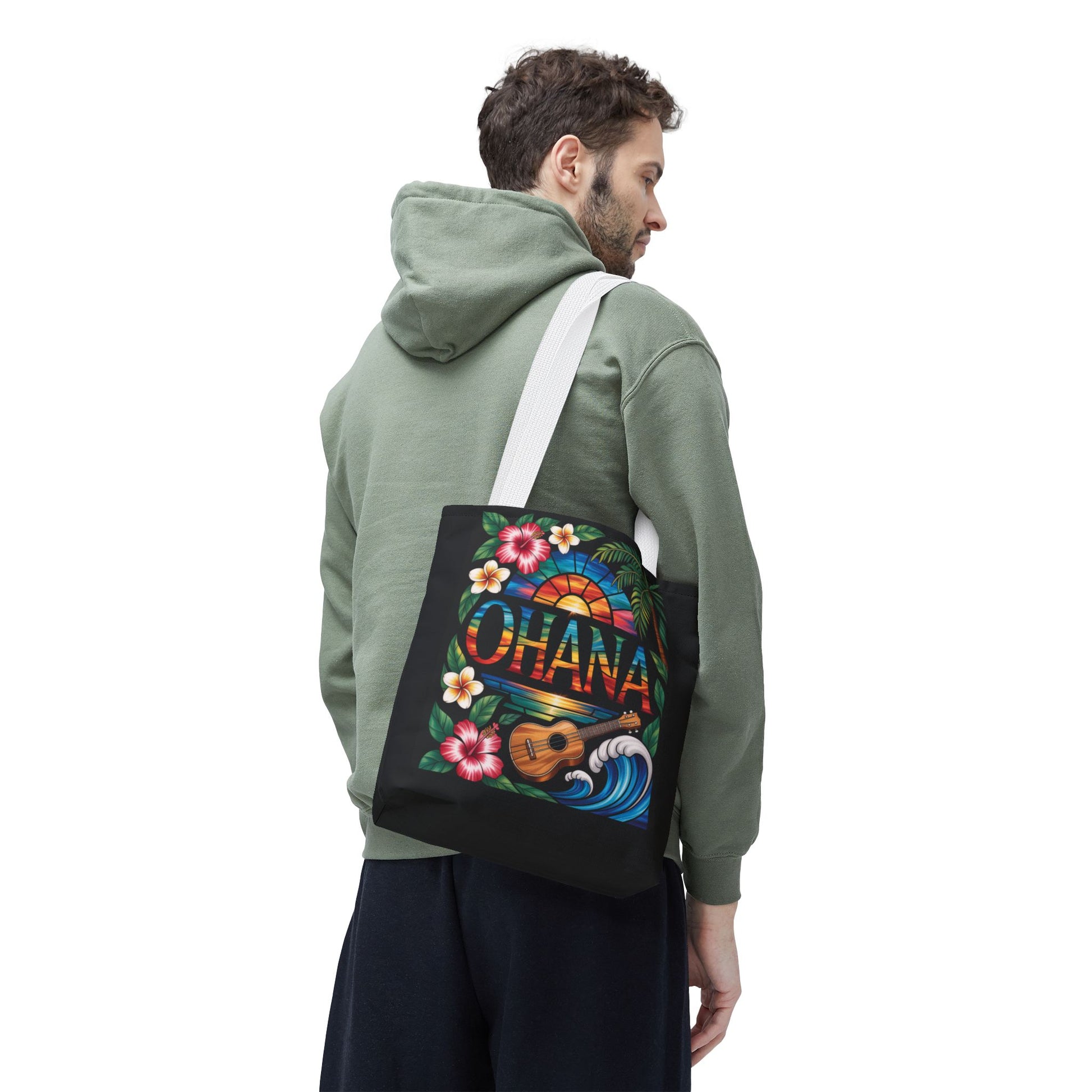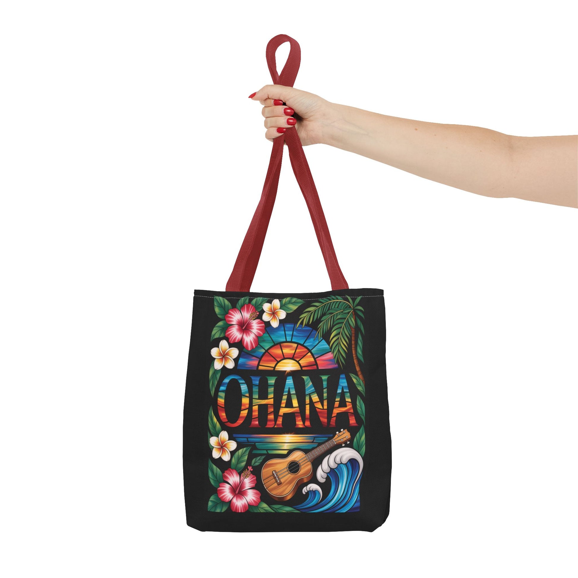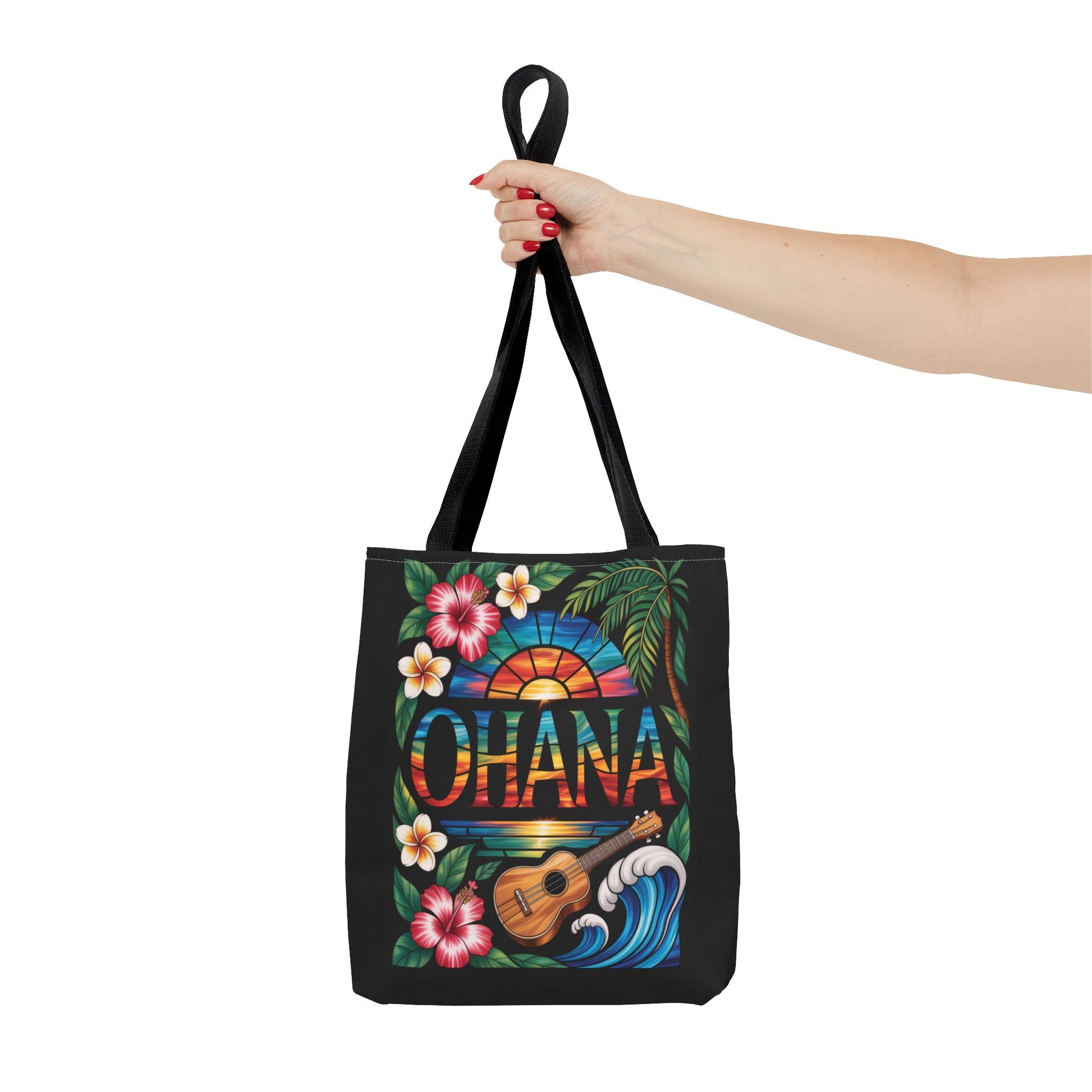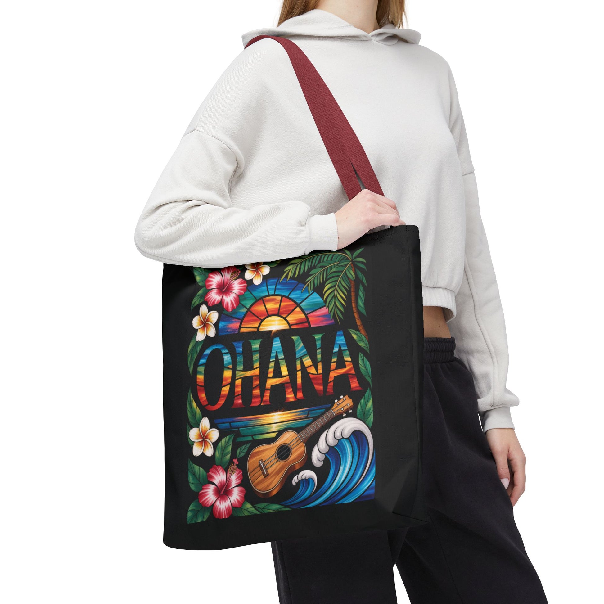 Ohana Tote Bag – Hawaiian Tropical Beach Bag with Ukulele, Sunset & Hibiscus Flowers, Island Gift for Women, Aloha Family Vibes
