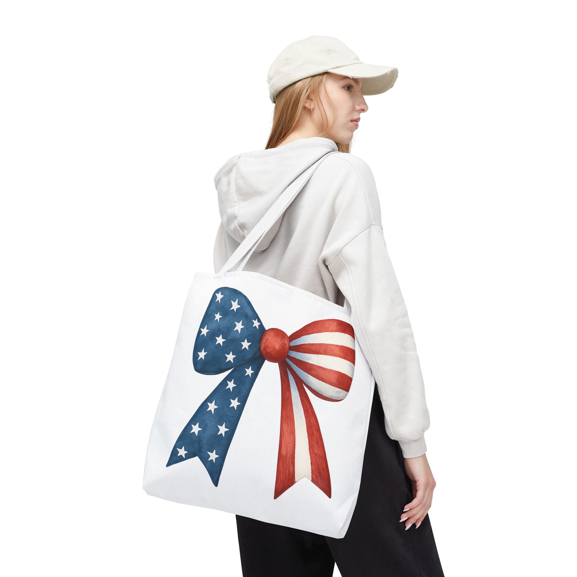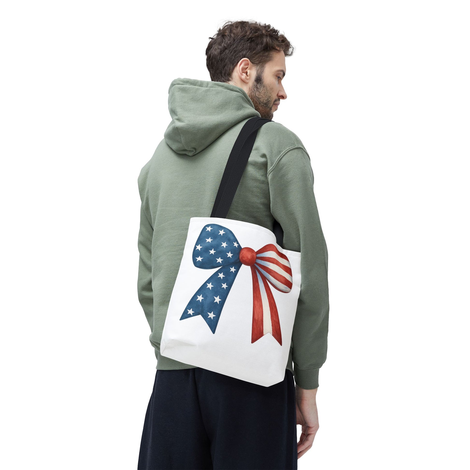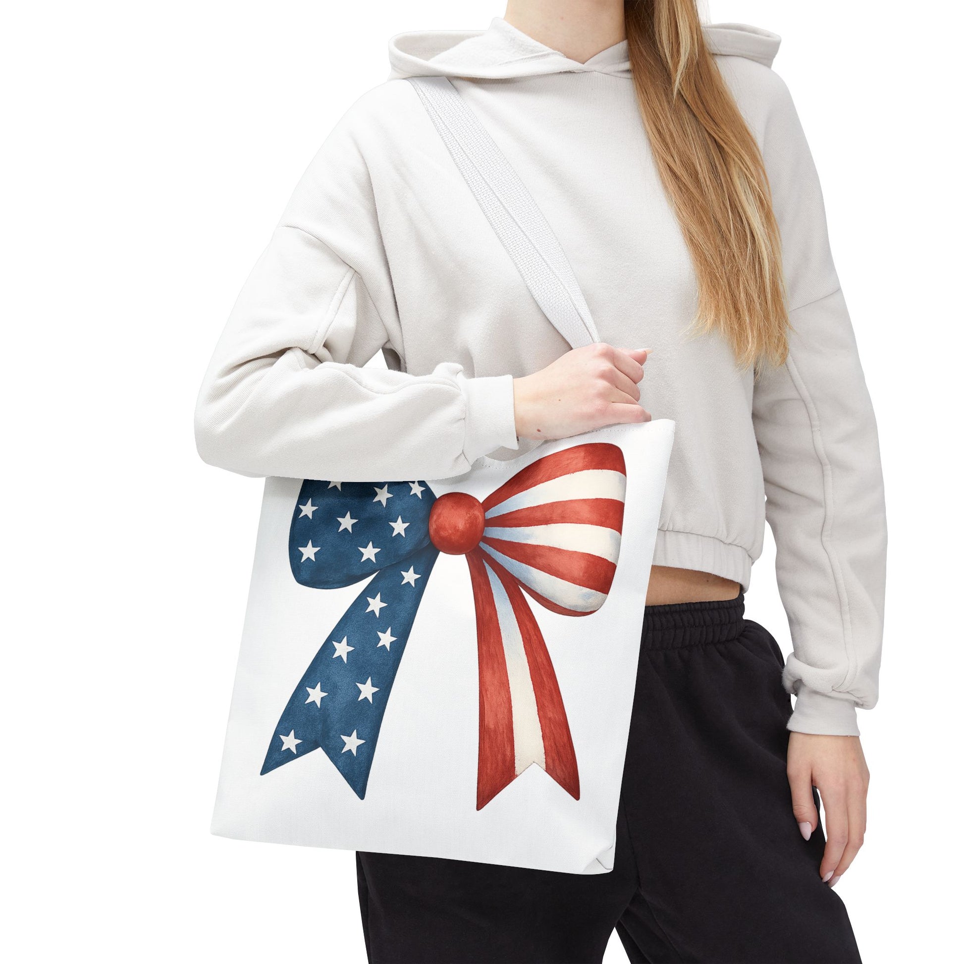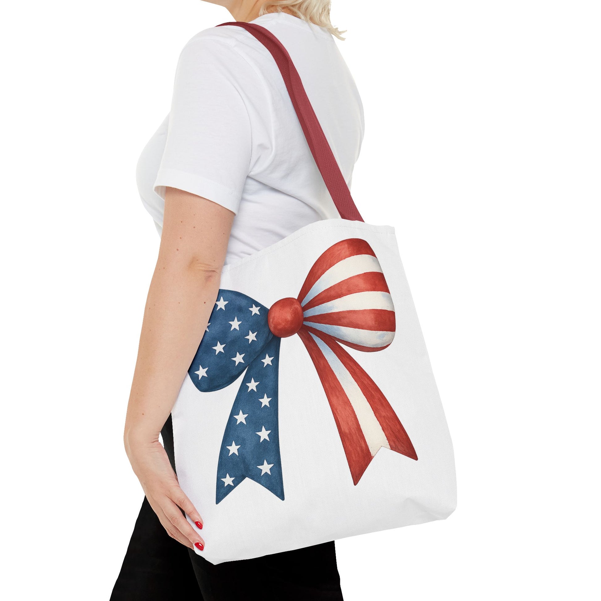 Carry your USA pride wherever you go with this stylish Patriotic Bow Tote Bag! Featuring a bold American Flag bow design, this roomy and durable reusable bag is perfect for farmers markets, beach days, 4th of July parties, picnics, daily errands, and more. 🇺🇸✨