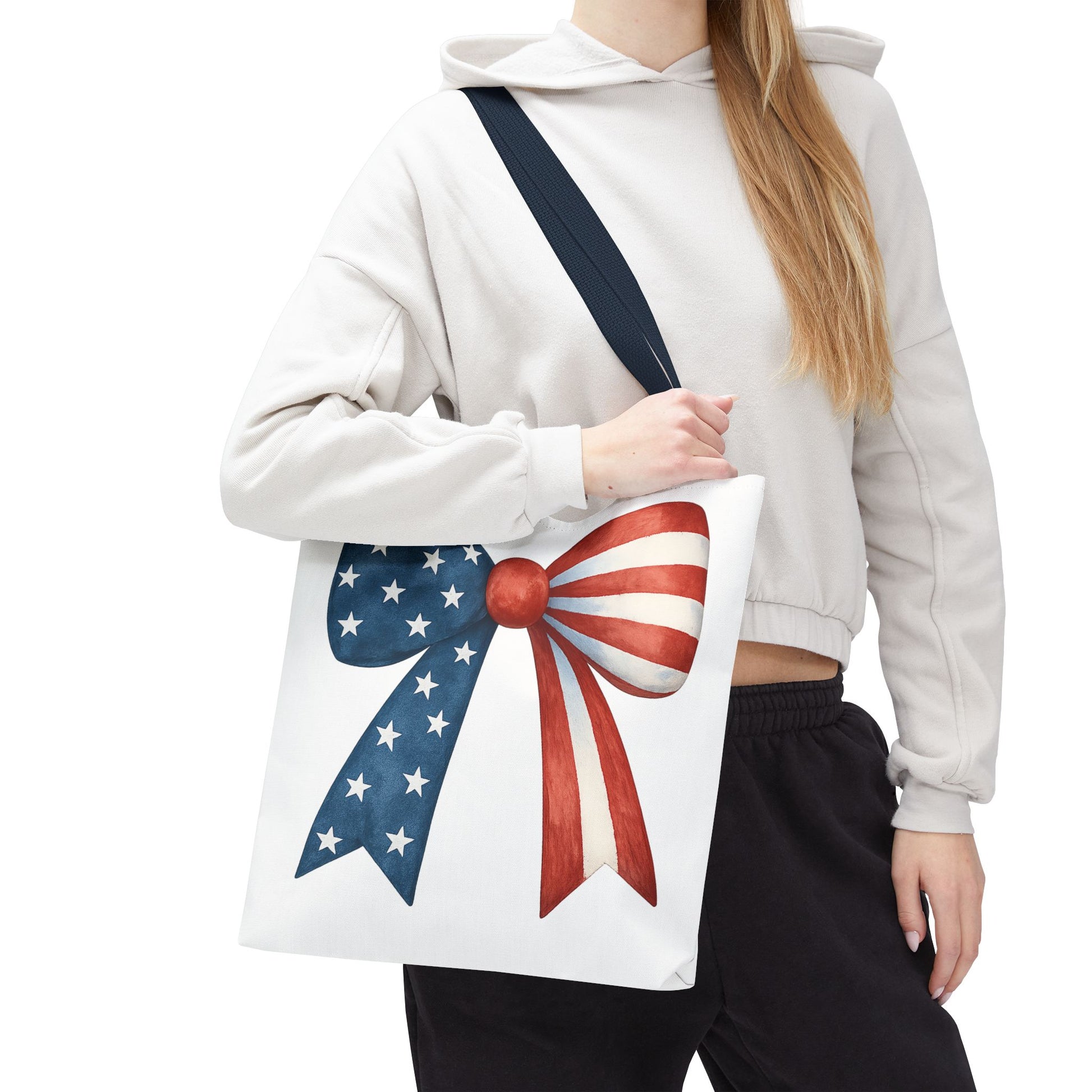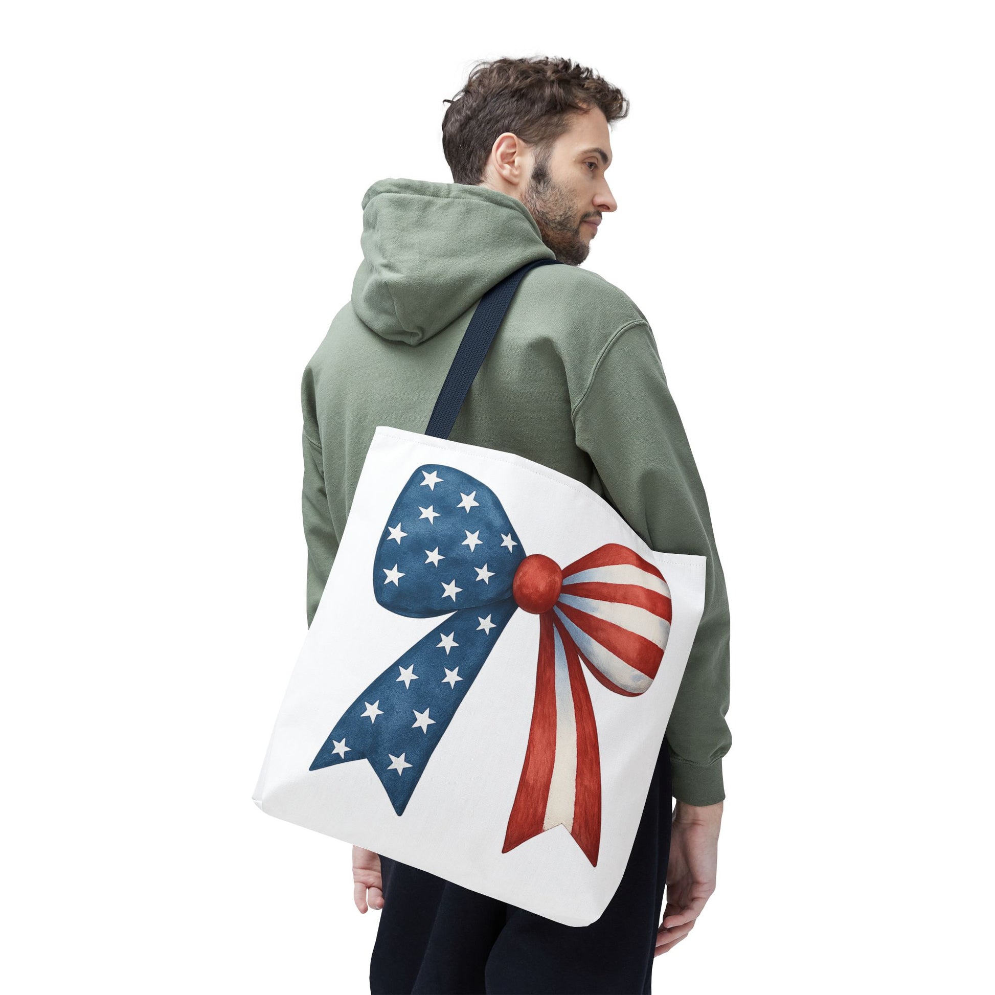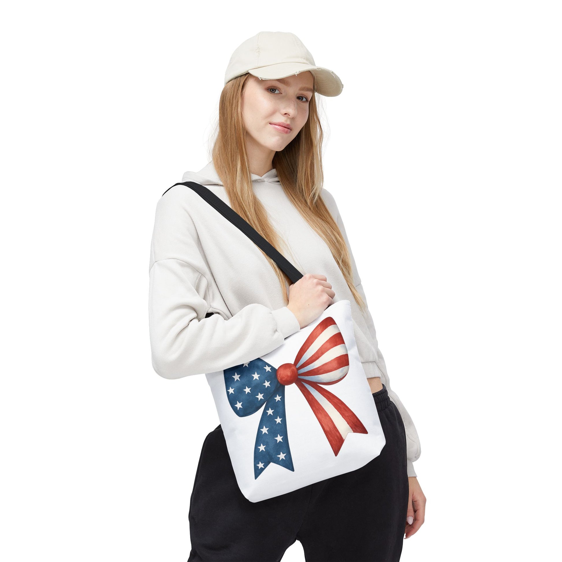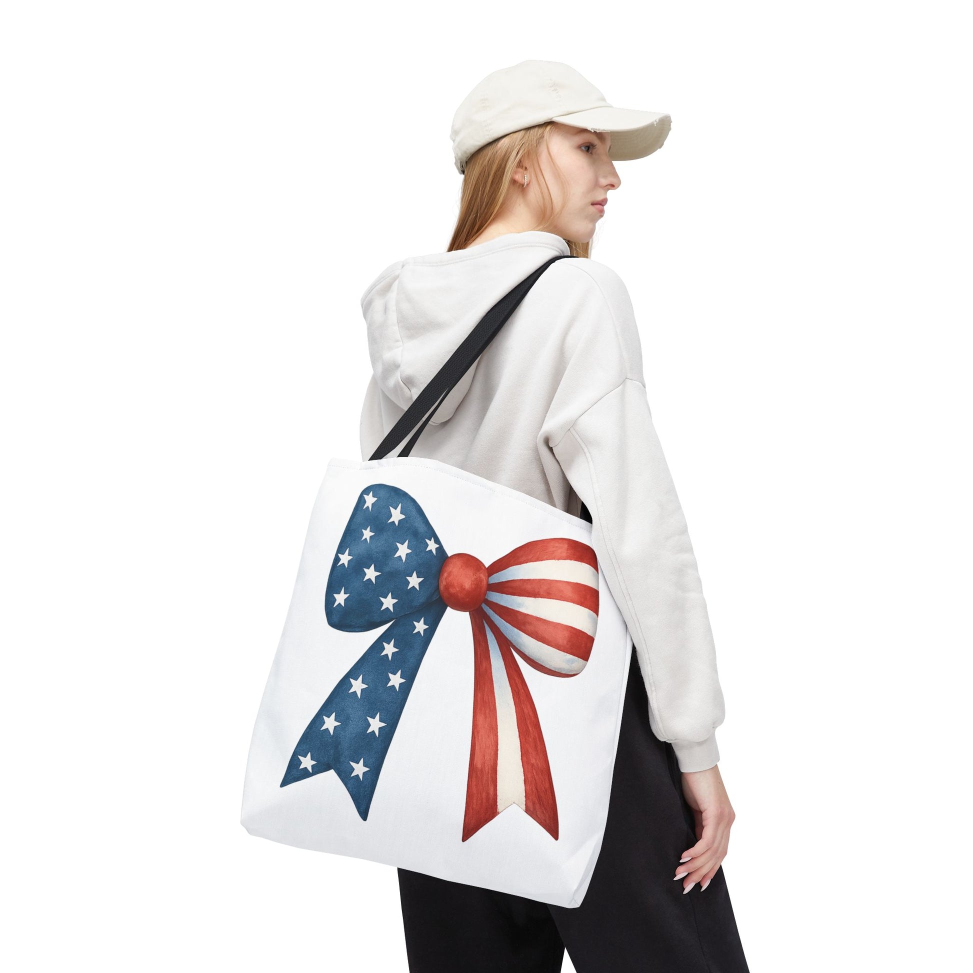 Carry your USA pride wherever you go with this stylish Patriotic Bow Tote Bag! Featuring a bold American Flag bow design, this roomy and durable reusable bag is perfect for farmers markets, beach days, 4th of July parties, picnics, daily errands, and more. 🇺🇸✨
