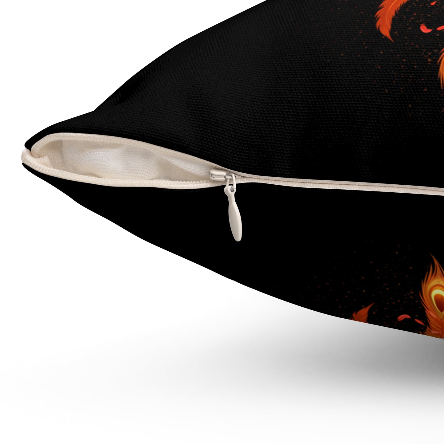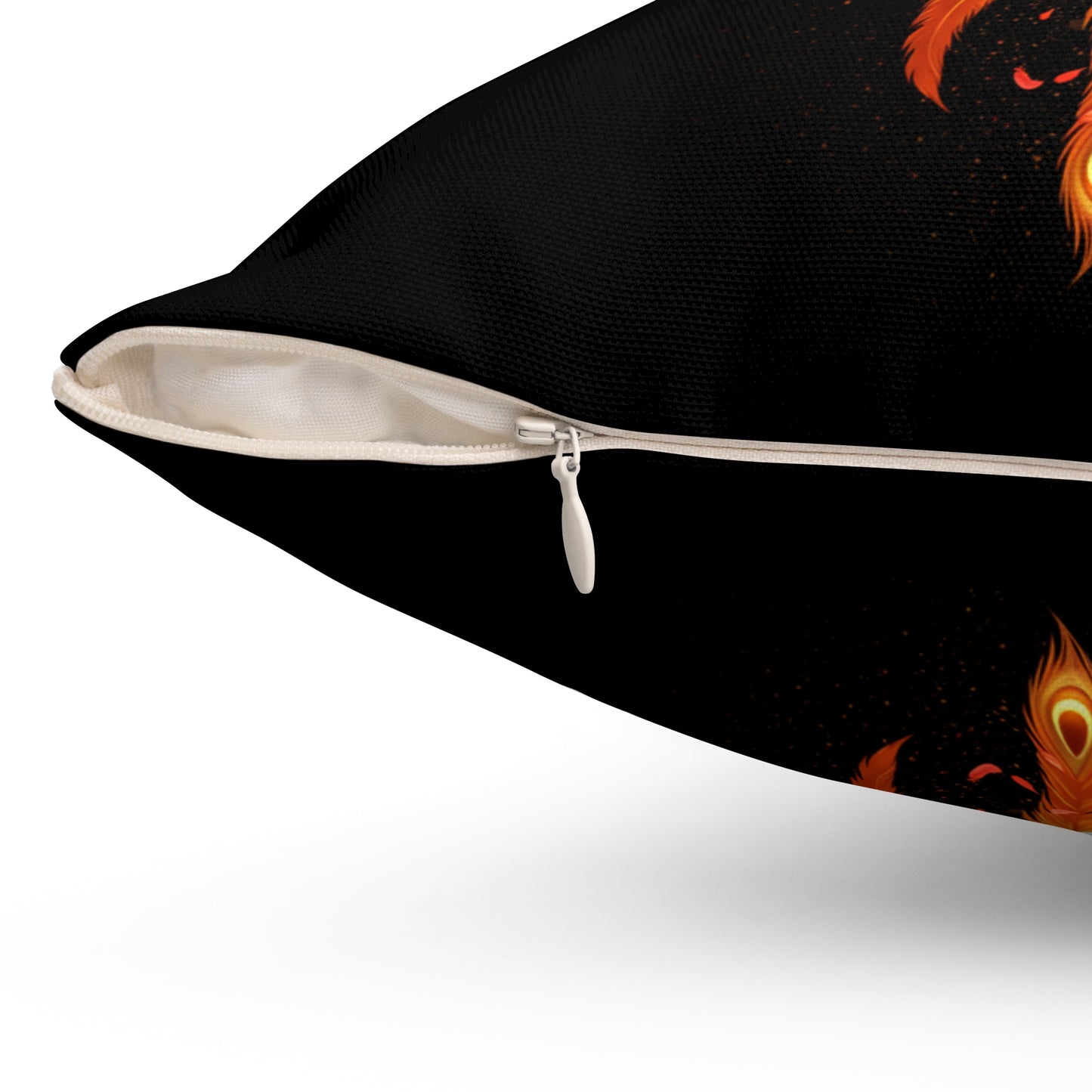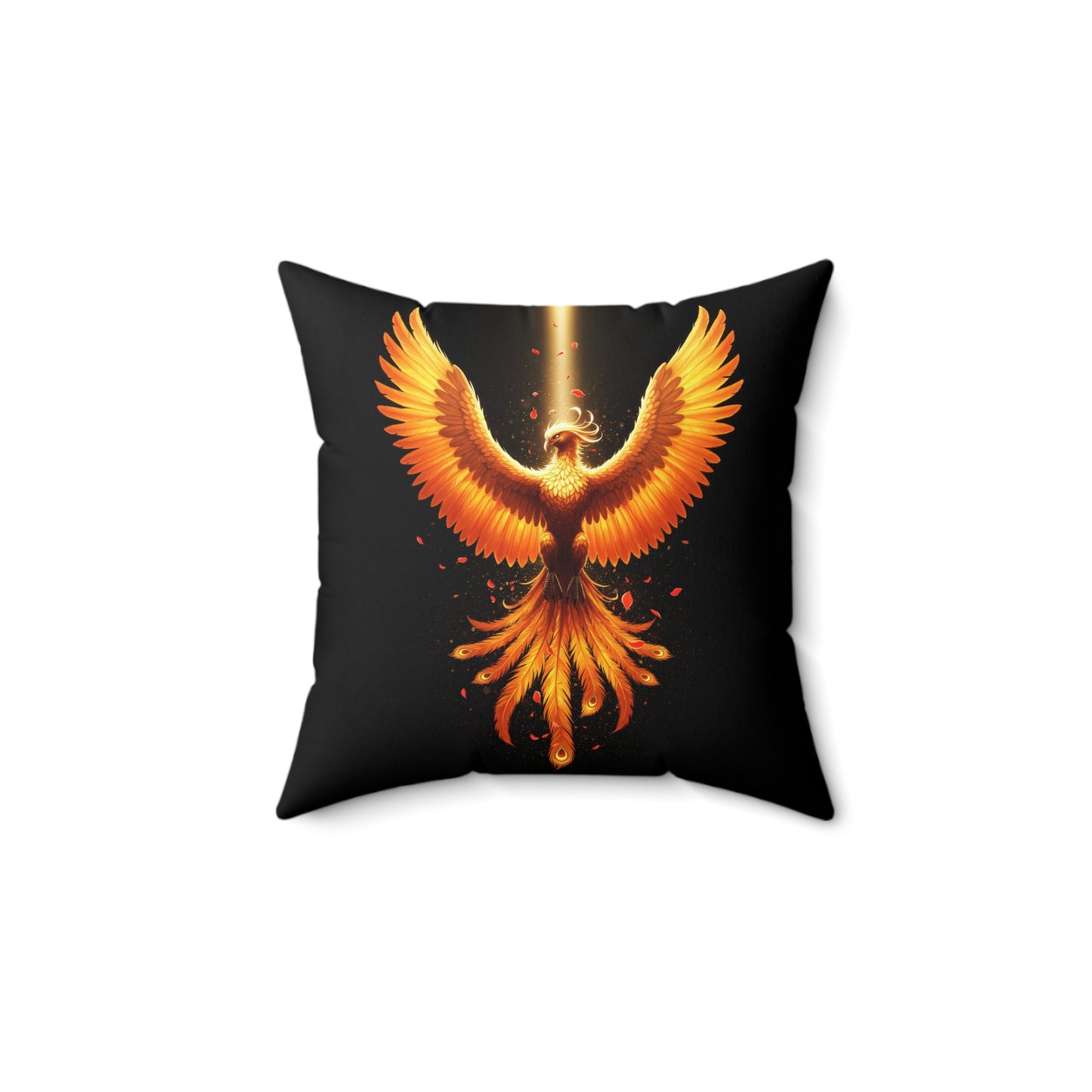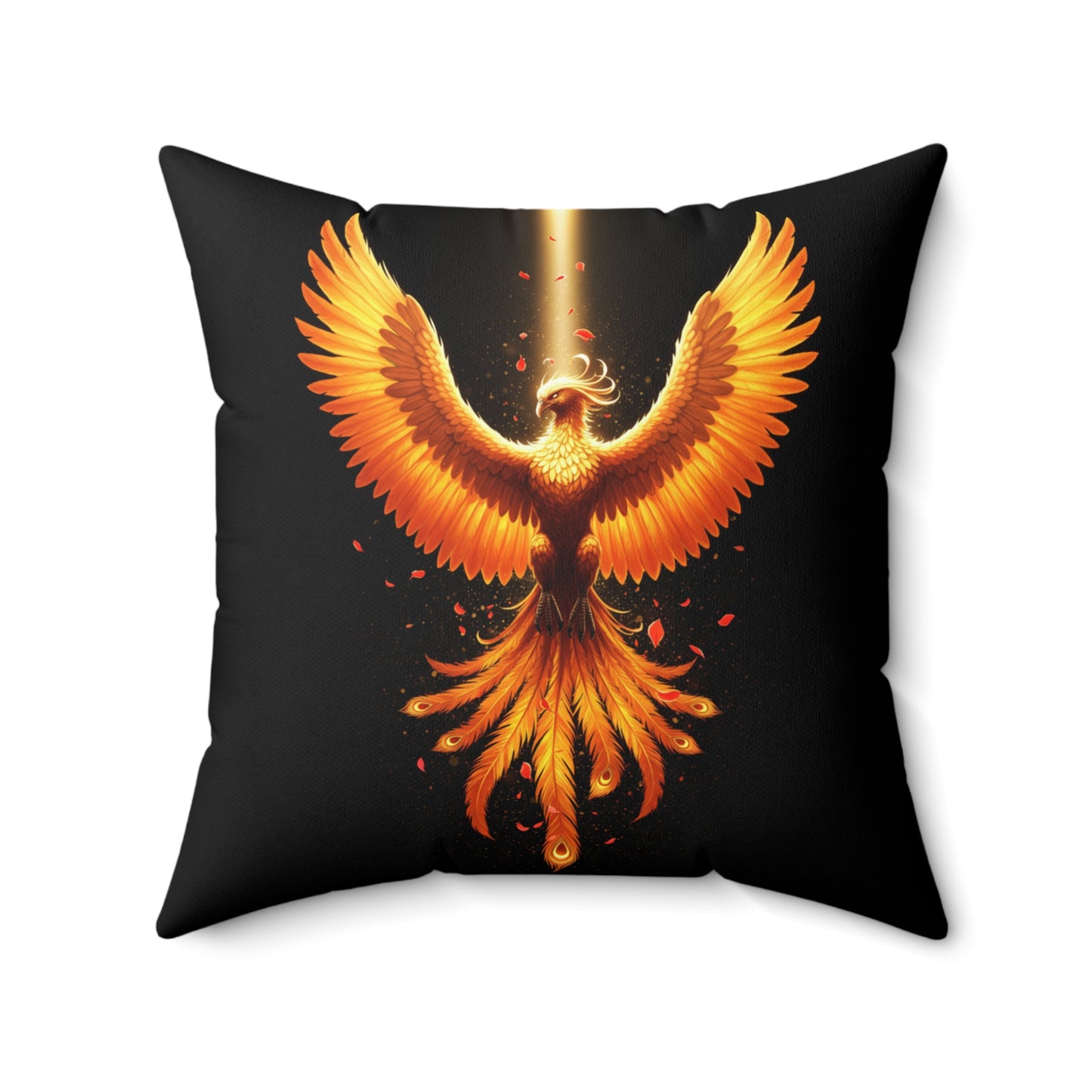 A fun square pillow featuring a Phoenix rising on it, perfect for adding a touch of whimsy to your home decor. This pillow is relevant for those who enjoy mystical and mythical designs, and can be a great addition to their living room or bedroom. It is ideal for those who celebrate fantasy and magic-themed holidays and occasions.