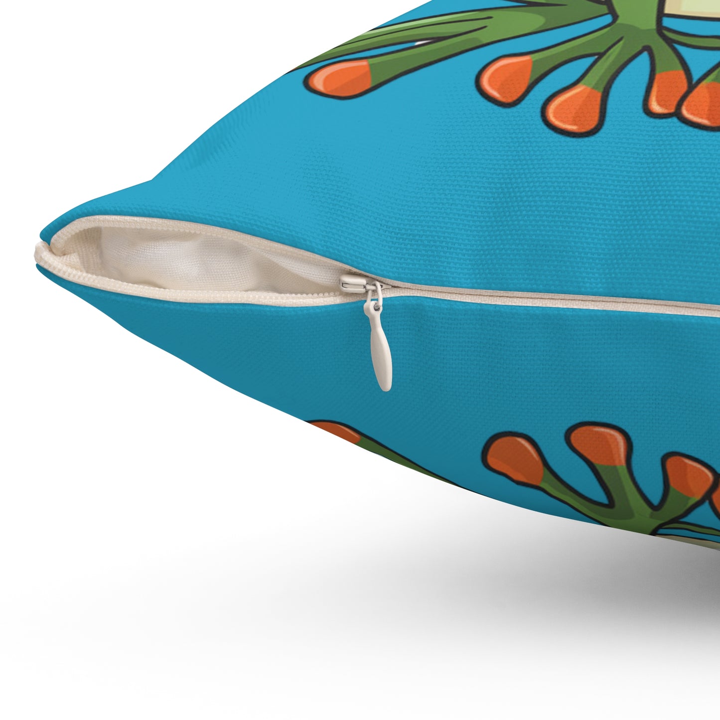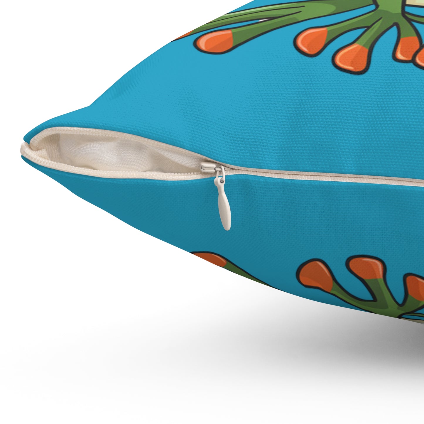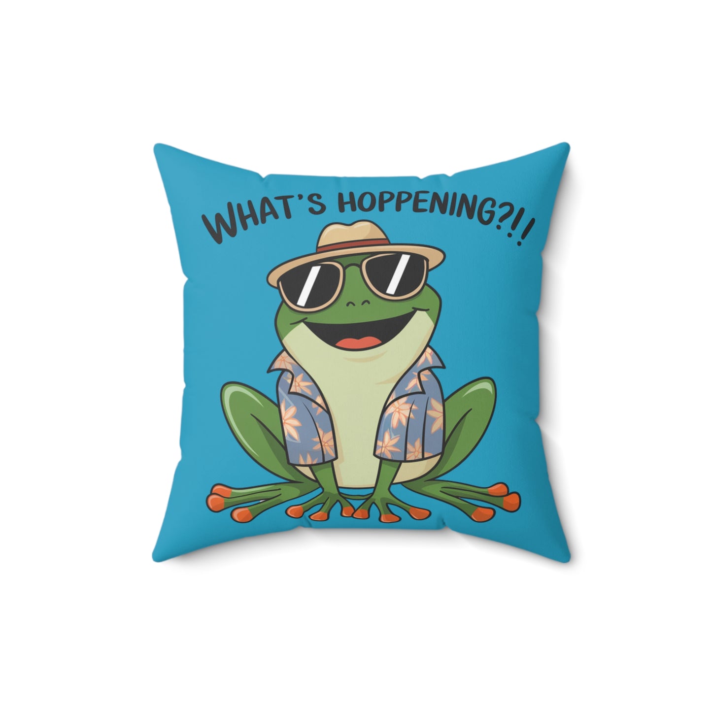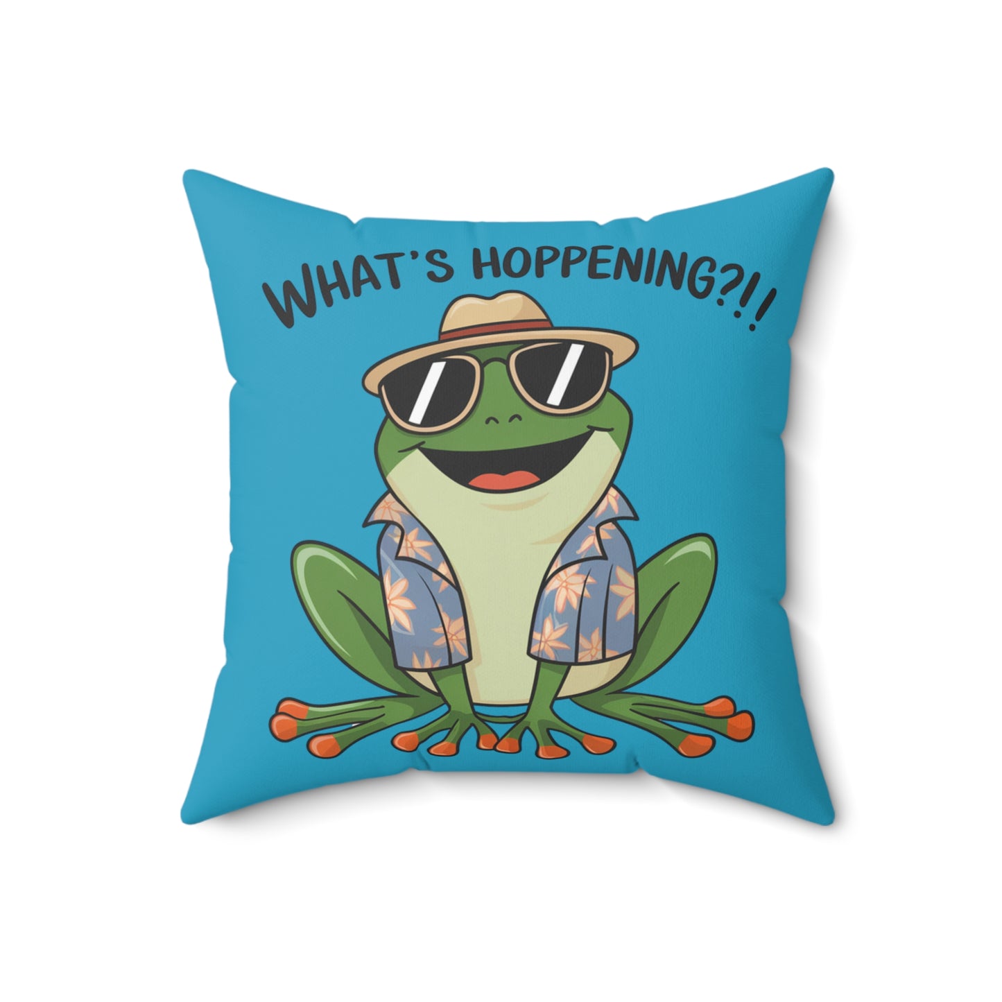 This frog-themed square pillow with the pun 'What's Hoppening' will bring a fun and playful vibe to any room. Perfect for frog lovers and those who enjoy whimsical decor. Ideal for adding a touch of humor to your living space or as a gift for animal lovers or pun enthusiasts. Great for decorating during springtime, Easter, or simply adding a touch of humor year-round.