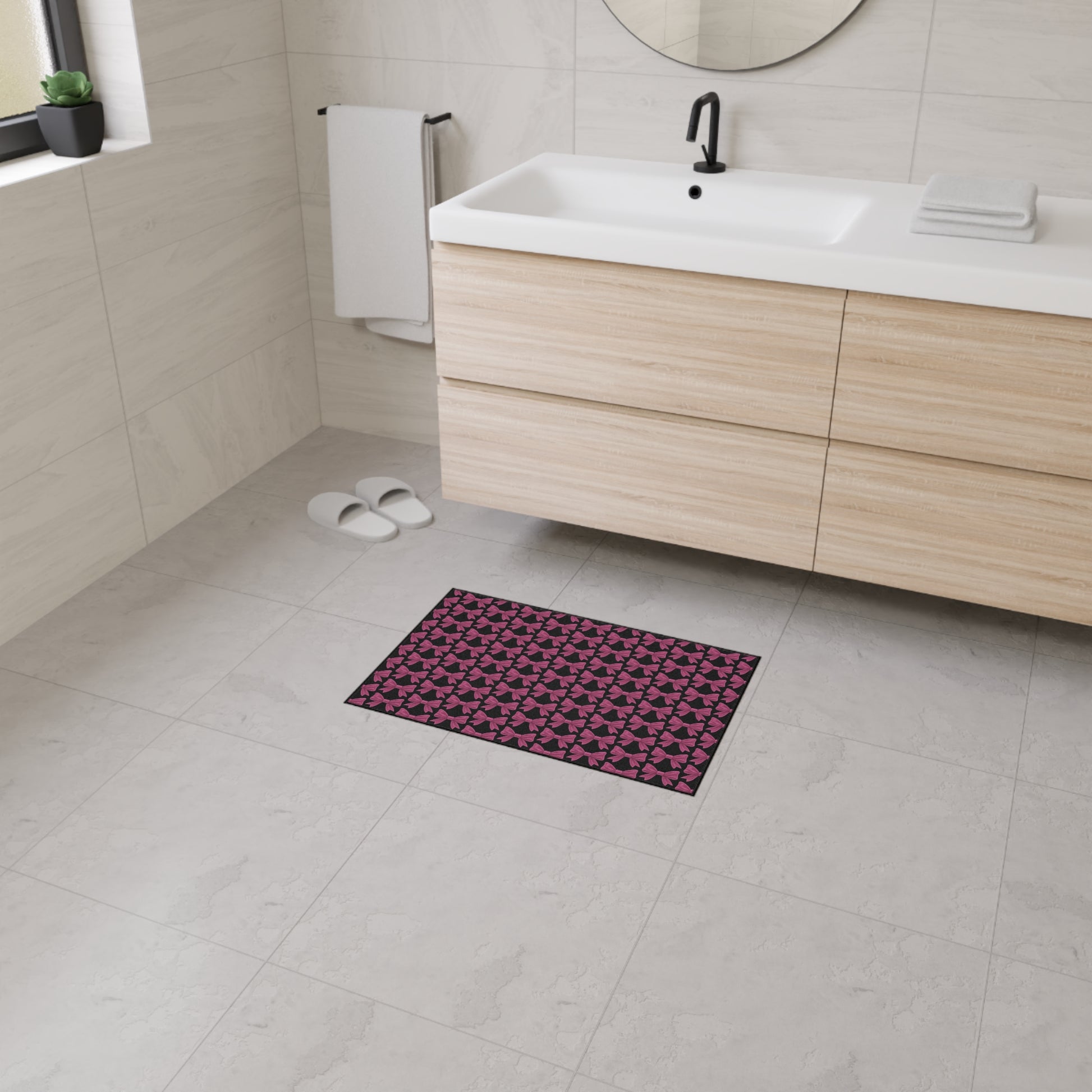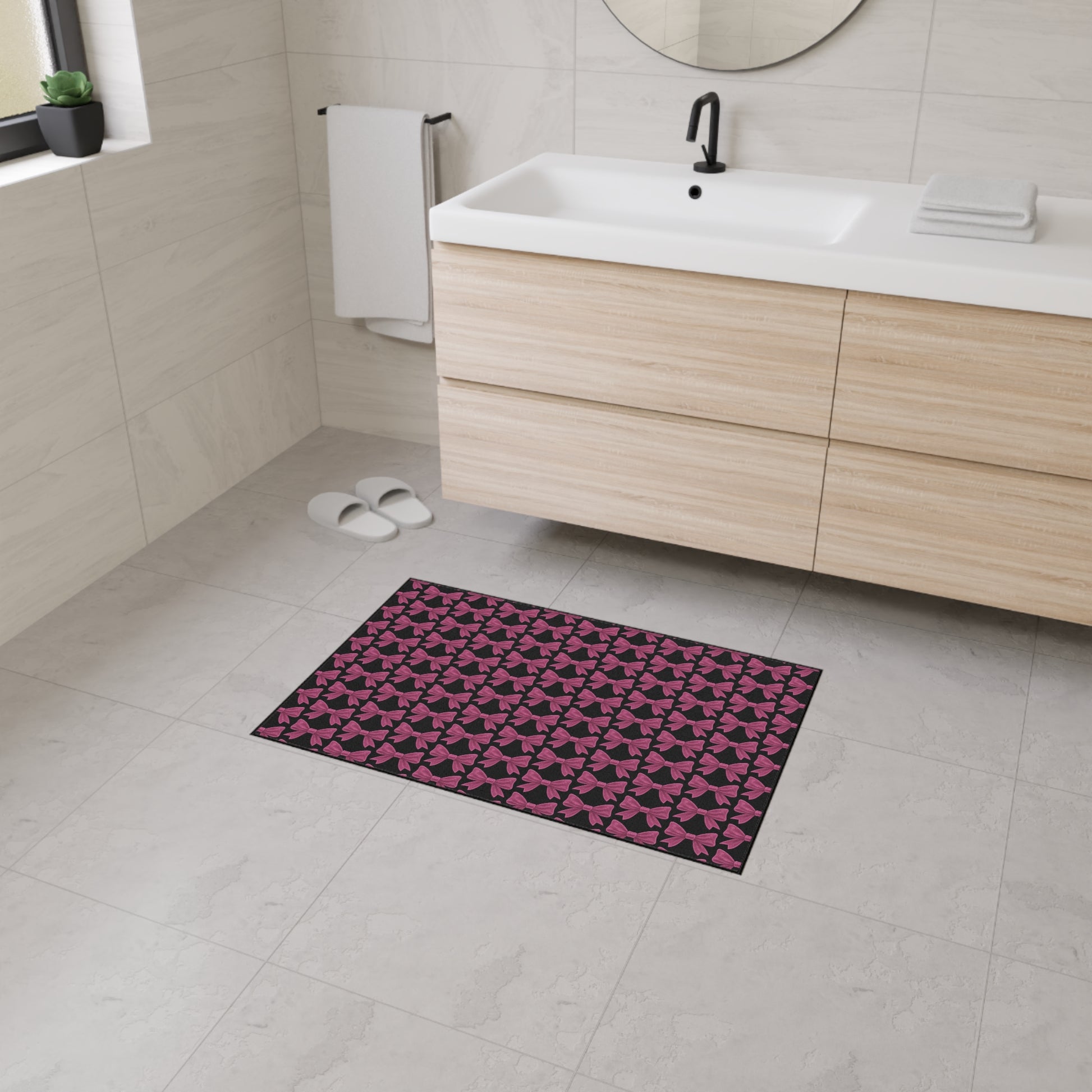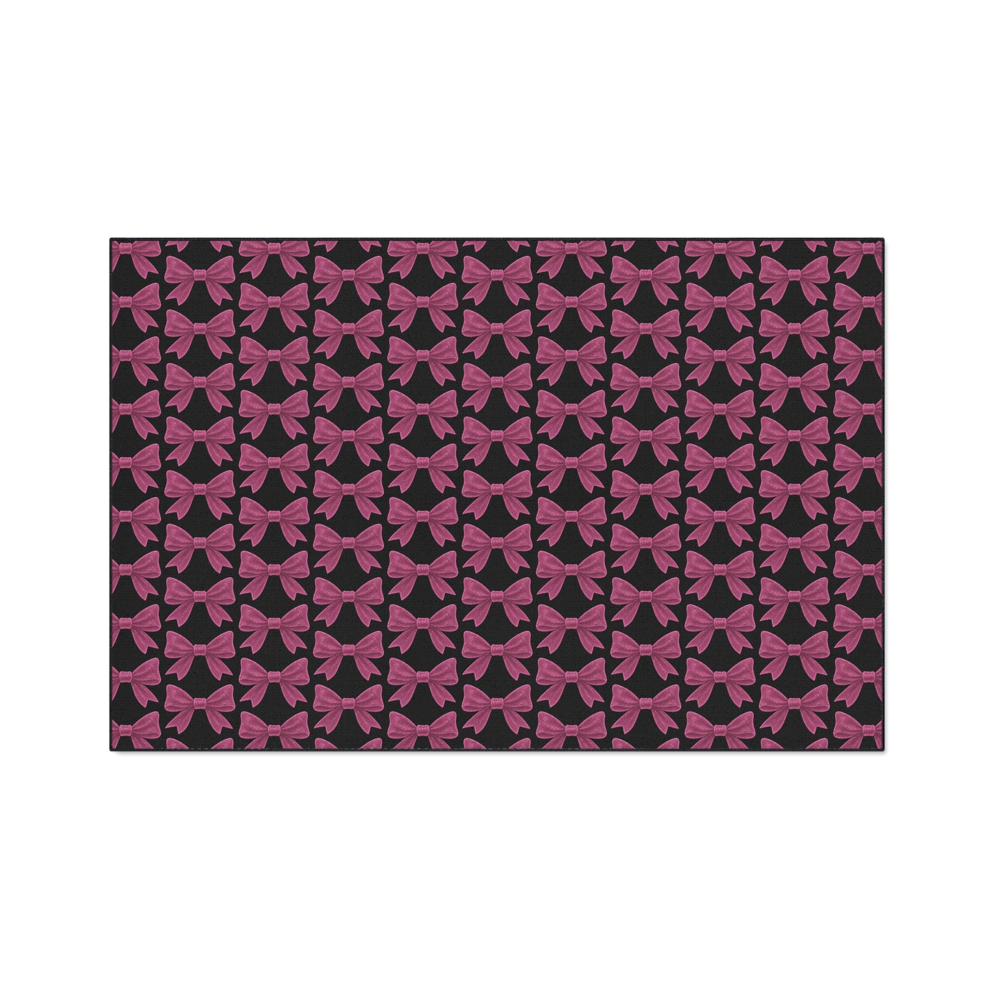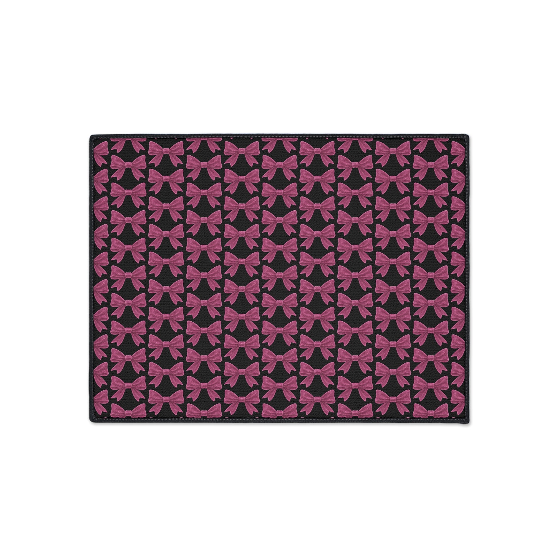 Make a bold first impression with this Pink Bow Doormat – the perfect fusion of functionality and fabulousness. Featuring an all-over pattern of vibrant pink bows on a sleek dark background, this mat adds a stylish pop to your entryway, kitchen, or bedroom.