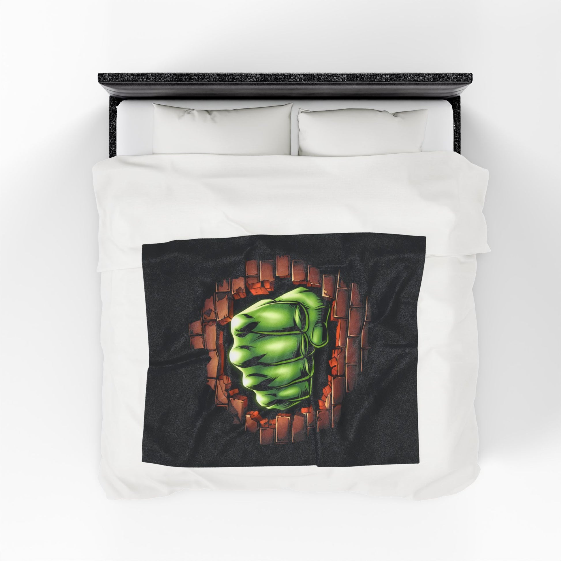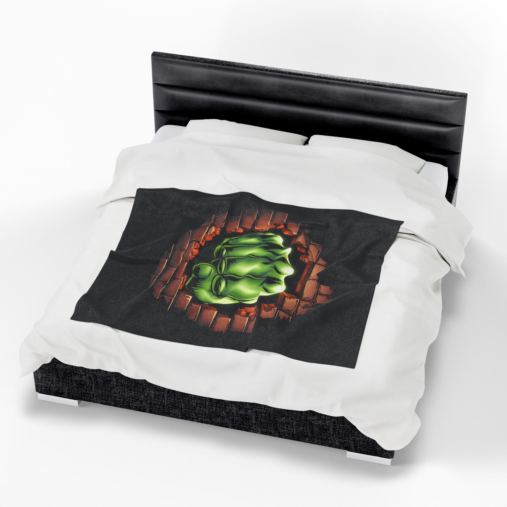 A fun Velveteen Plush Blanket featuring the Green Fist smashing through a wall design. This cozy blanket is perfect for adults who enjoy unique and bold home decor. Ideal for gifting during birthdays, holidays, or as a housewarming present.
