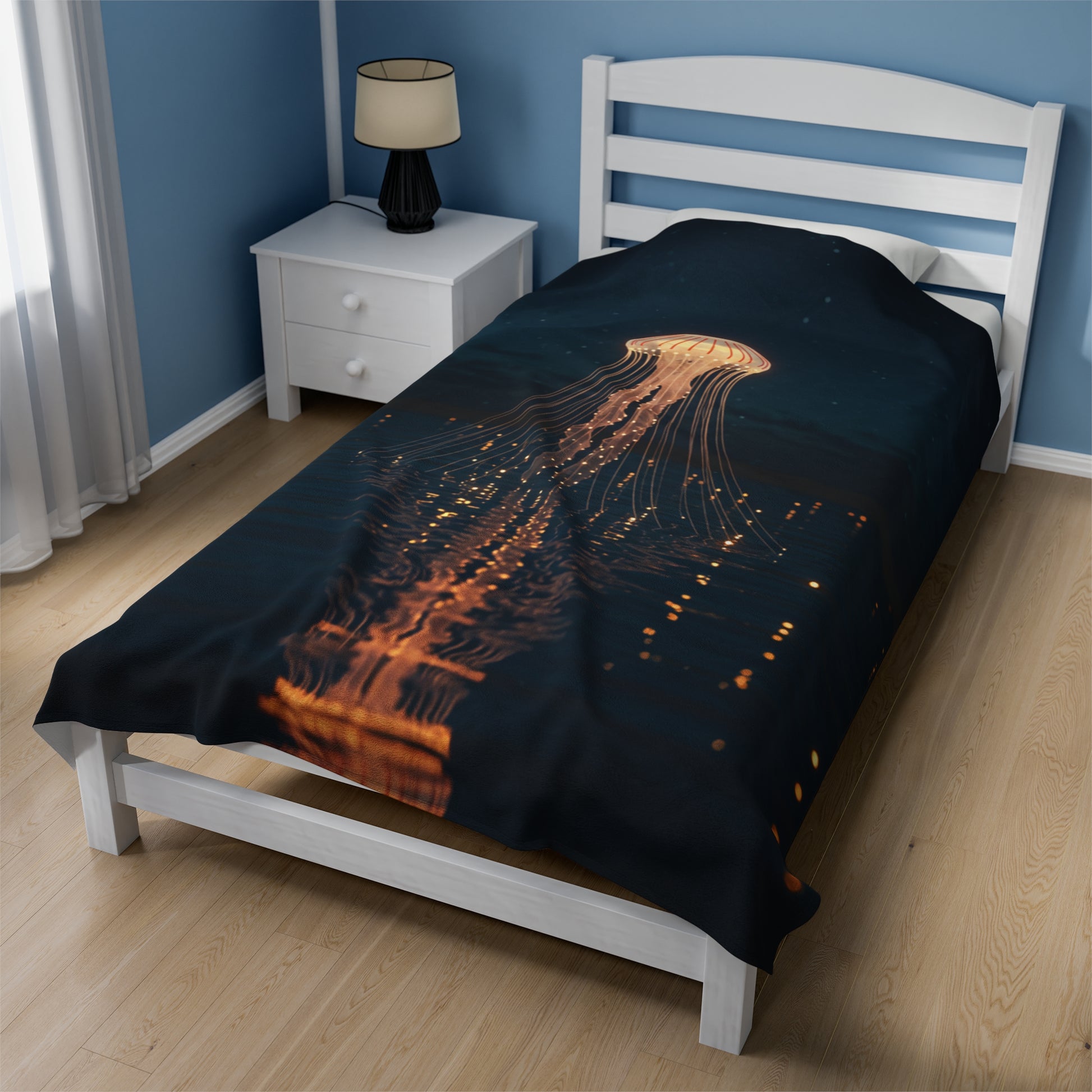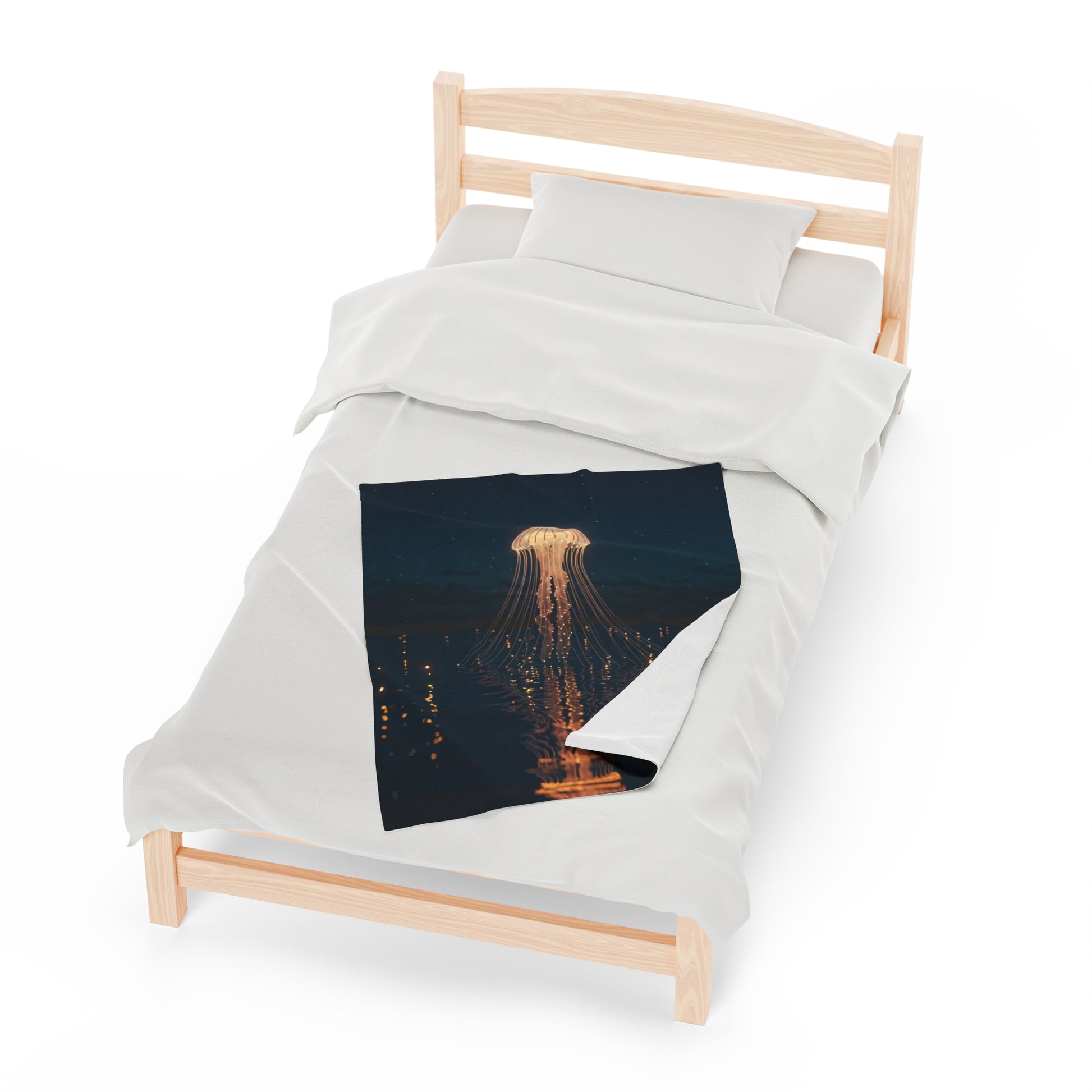 This velveteen plush blanket features a fun design of a Jellyfish emerging from a lake. It gives a cozy and whimsical vibe, perfect for snuggling up on a chilly evening or adding a playful touch to your home decor. Ideal for animal lovers or those who enjoy unique and colorful designs. Relevant for gifting during birthdays, holidays, or as a housewarming present.
