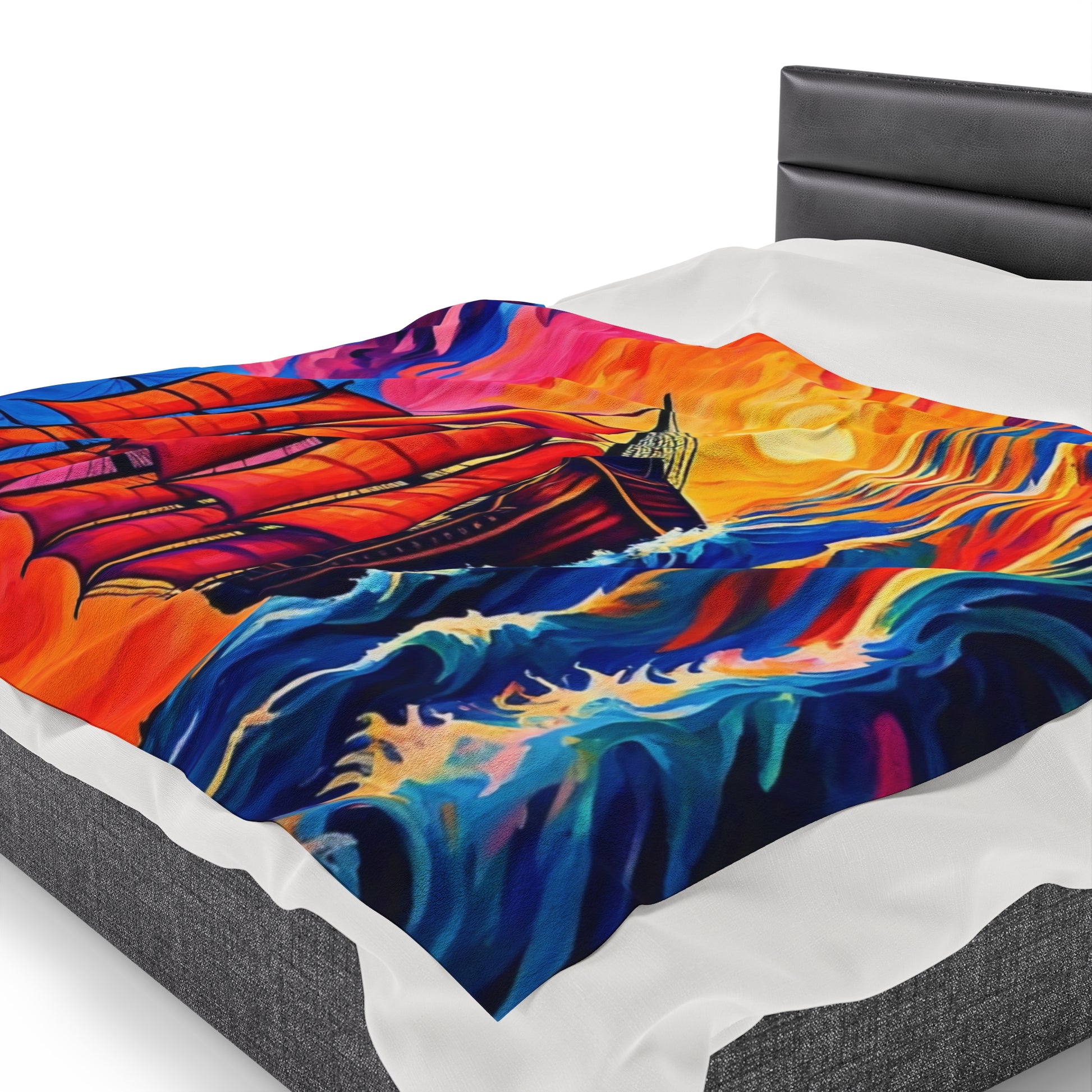 A fun plush blanket featuring a painting of a ship sailing at sunset, giving off cozy and calming vibes. Perfect for snuggling up on the couch during chilly evenings or as a decorative piece in a beach-themed room. Ideal for ocean lovers, beachgoers, and those who appreciate serene sunsets. Relevant for cozy nights in, beach house decor, nautical-themed rooms, and as a thoughtful gift for housewarmings or birthdays.