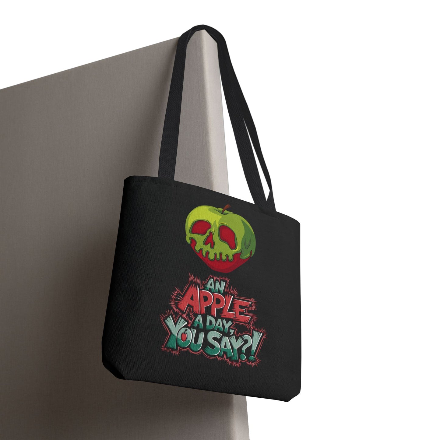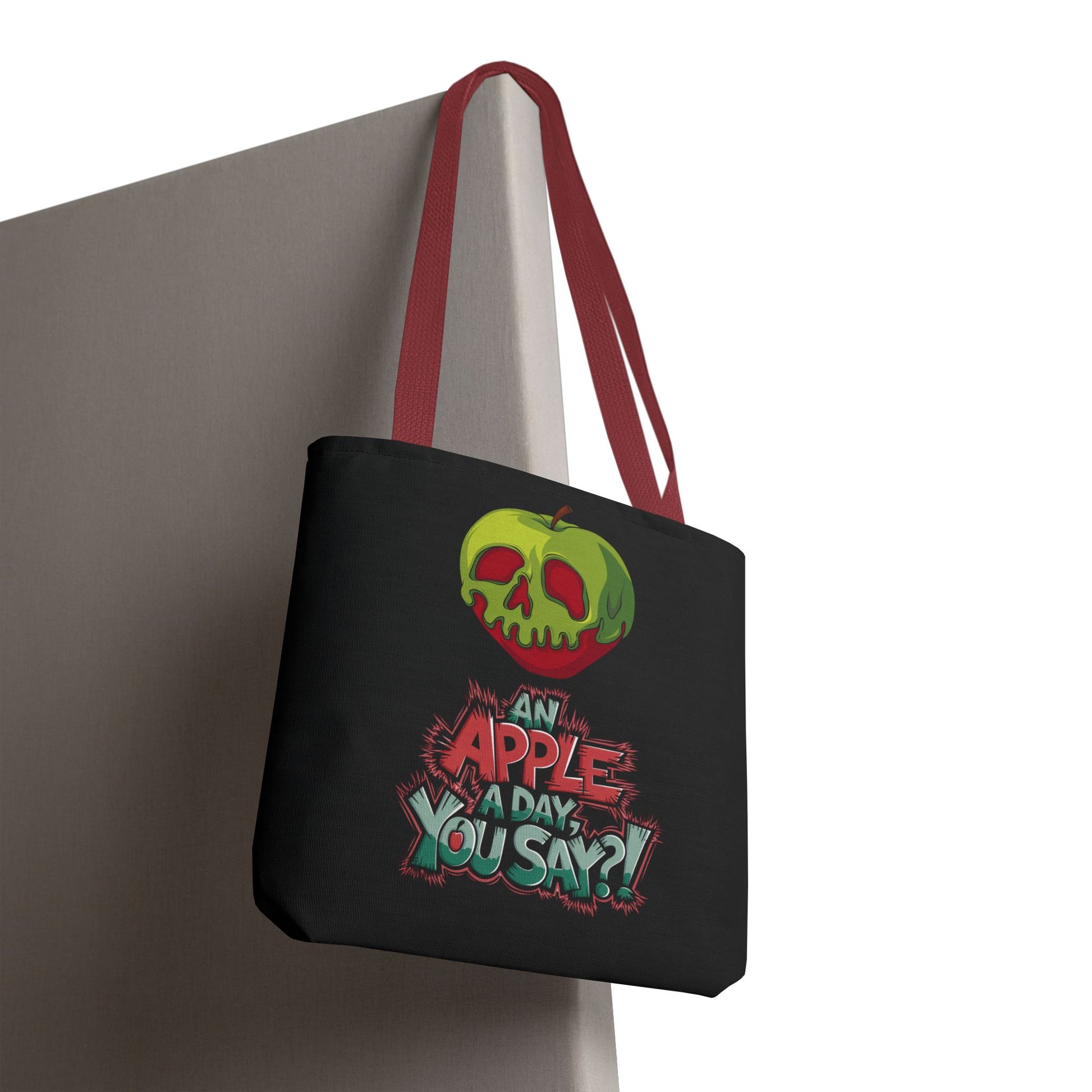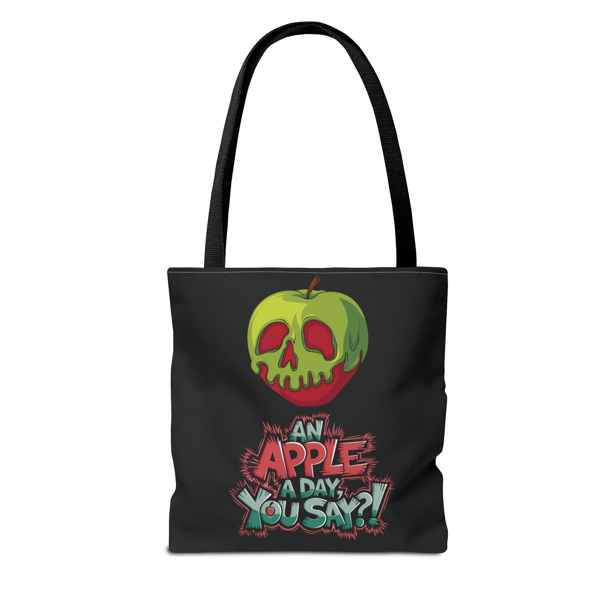 Add a wicked twist to your Halloween style with this eye-catching tote bag featuring a haunting poison apple design and the phrase “An Apple A Day, You Say?!” Inspired by spooky season aesthetics, this design is a perfect blend of eerie charm and bold humor. Printed on a durable black tote, the graphic showcases a green skull-faced apple with vivid red highlights, ideal for carrying treats, books, or your spell ingredients (no judgment here).
