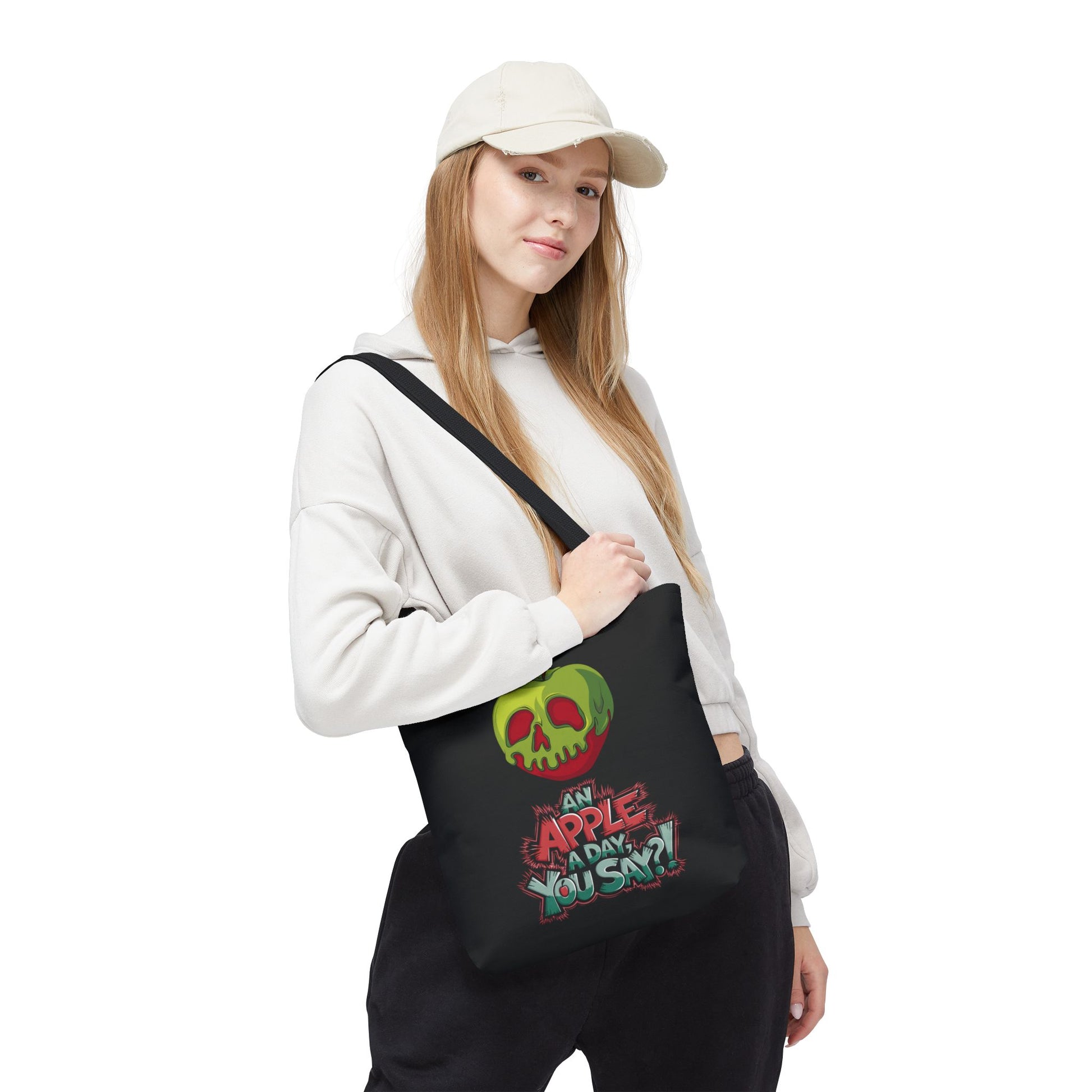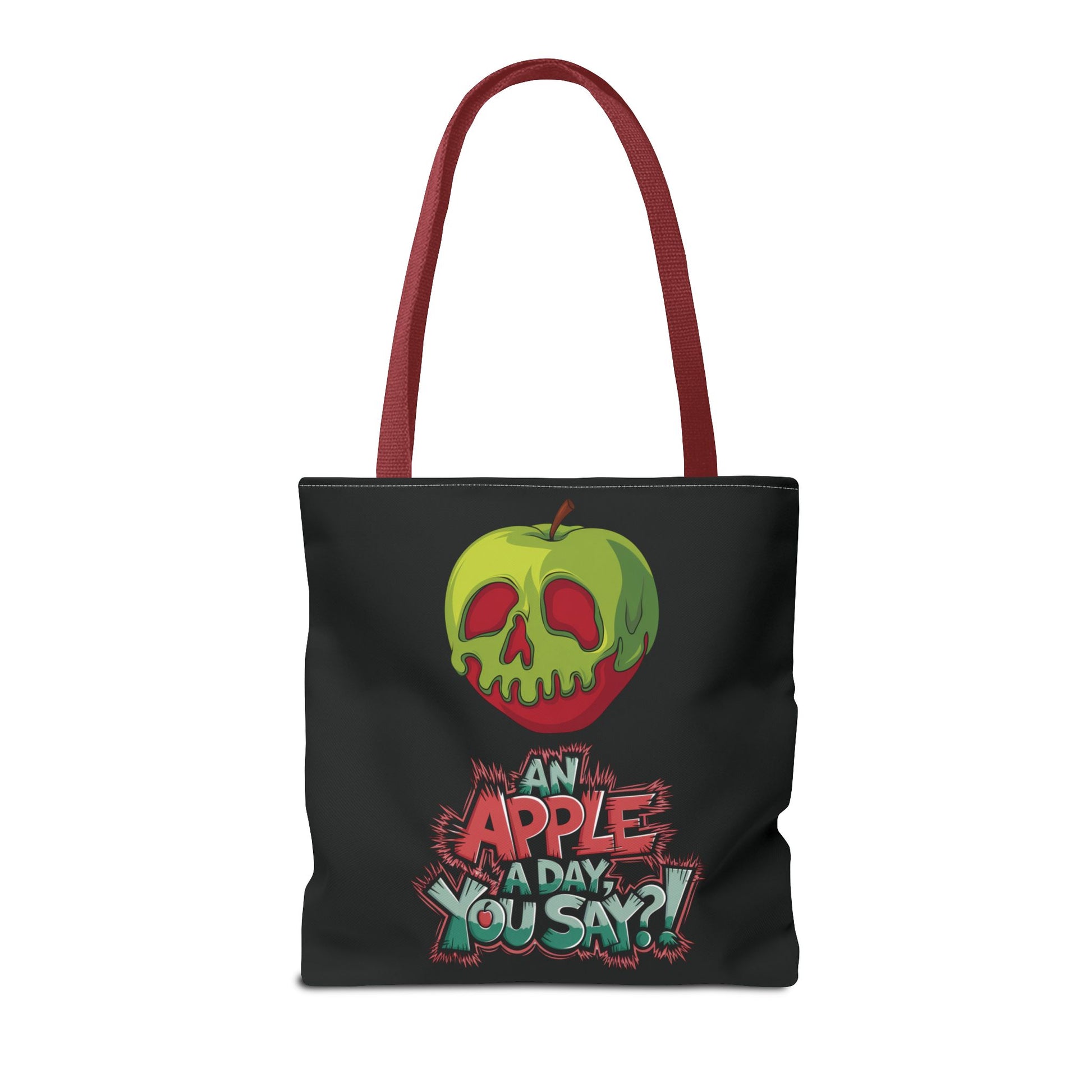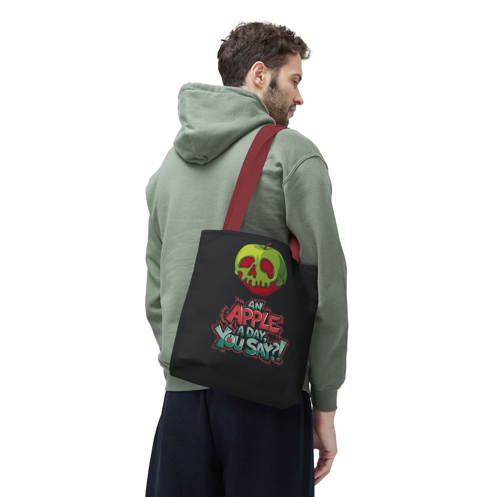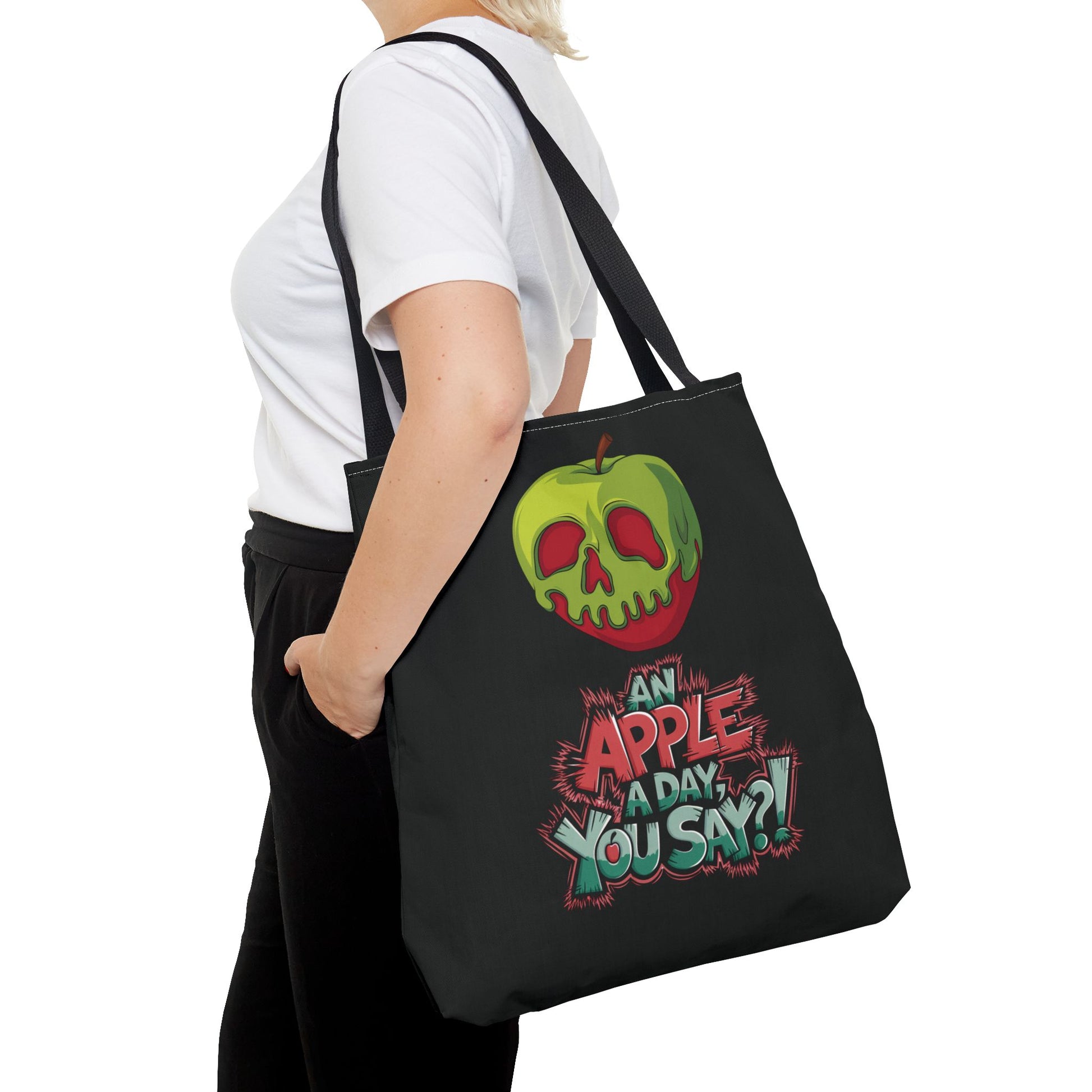 Add a wicked twist to your Halloween style with this eye-catching tote bag featuring a haunting poison apple design and the phrase “An Apple A Day, You Say?!” Inspired by spooky season aesthetics, this design is a perfect blend of eerie charm and bold humor. Printed on a durable black tote, the graphic showcases a green skull-faced apple with vivid red highlights, ideal for carrying treats, books, or your spell ingredients (no judgment here).