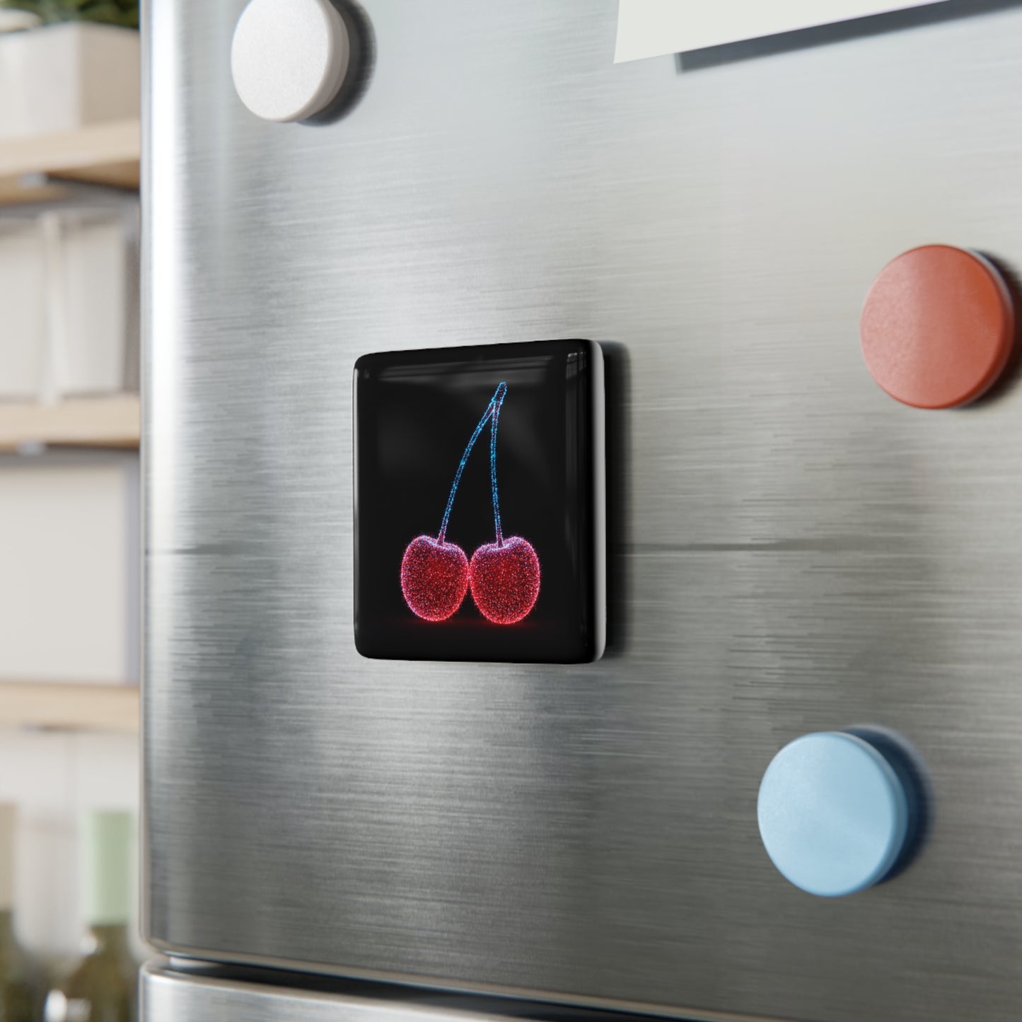 A fun Porcelain Magnet with Sparkling Cherries on it, perfect for adding a pop of color and fun to your fridge or office space. Ideal for those who love quirky and playful designs. Great for birthdays, kitchen decor, and to brighten up any space.