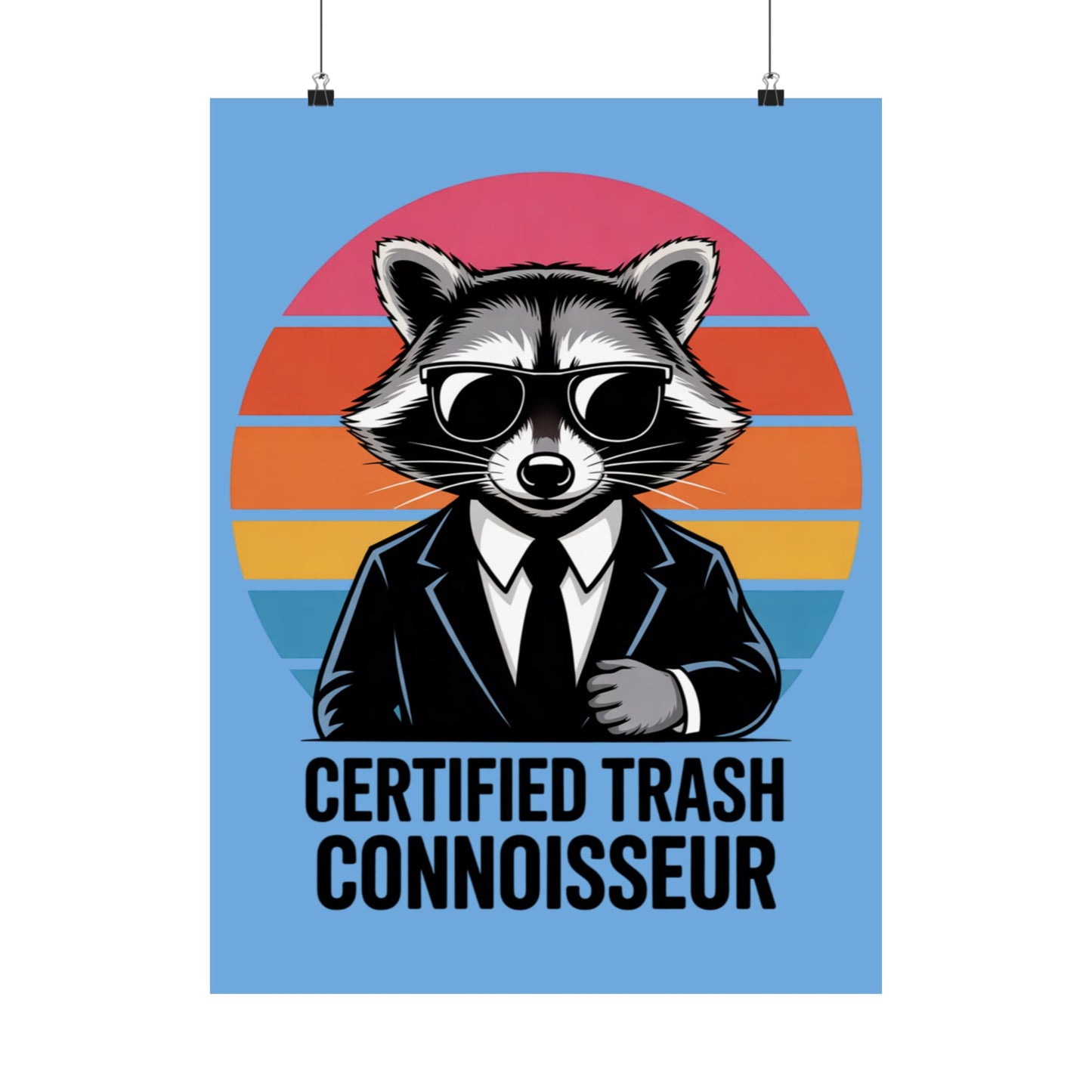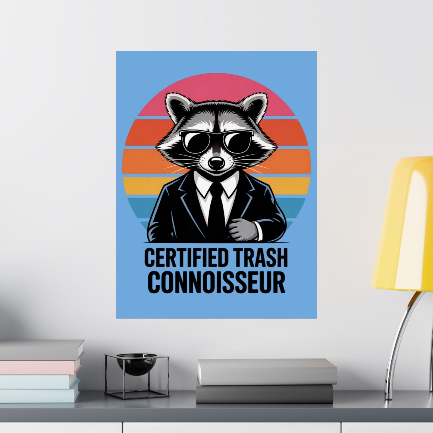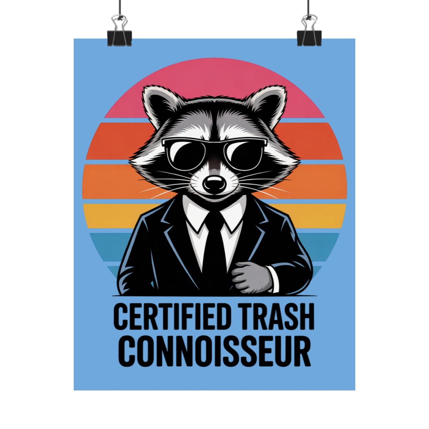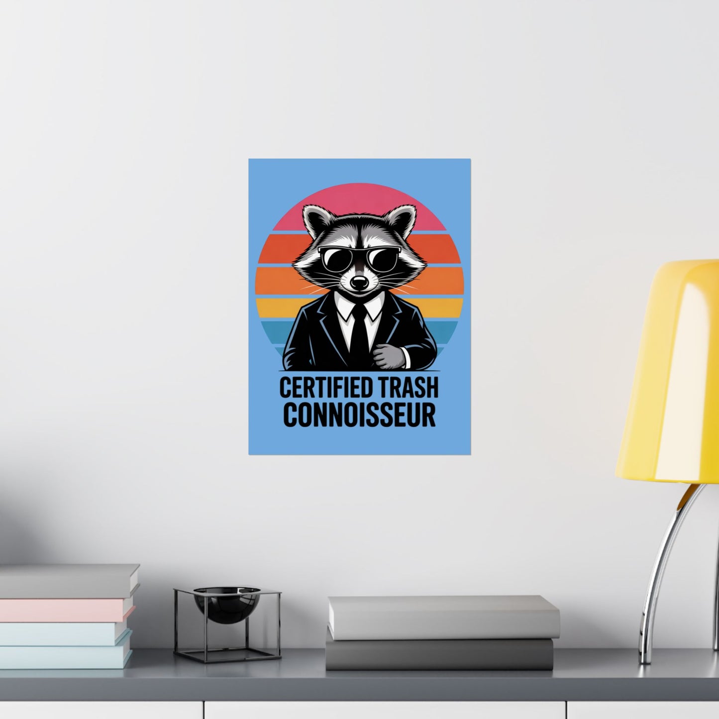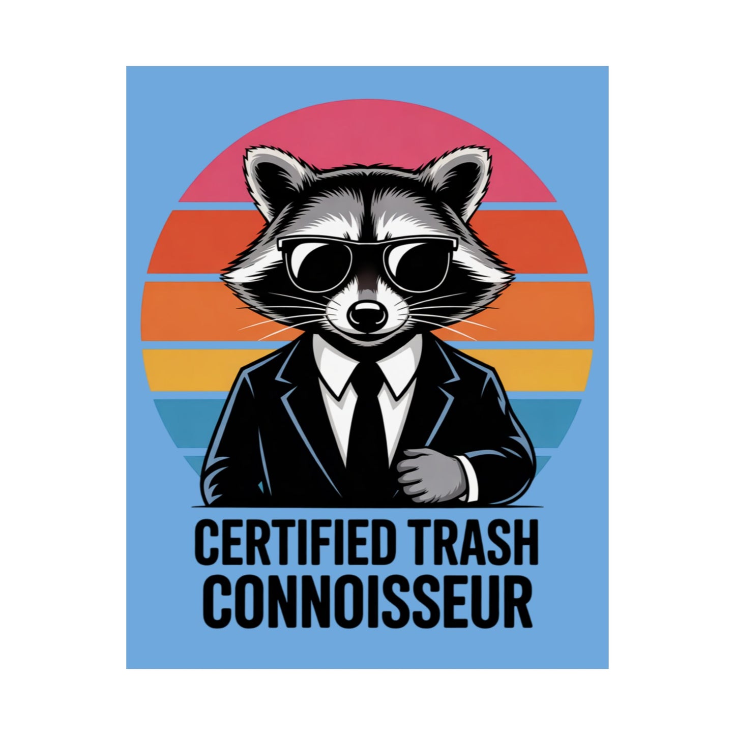 A fun poster featuring a raccoon with the text 'Certified Trash Connoisseur'. Perfect for adding a touch of whimsy to any room. Ideal for those who appreciate quirky decor and humor. Relevant for birthdays, housewarmings, and dorm room decorations.