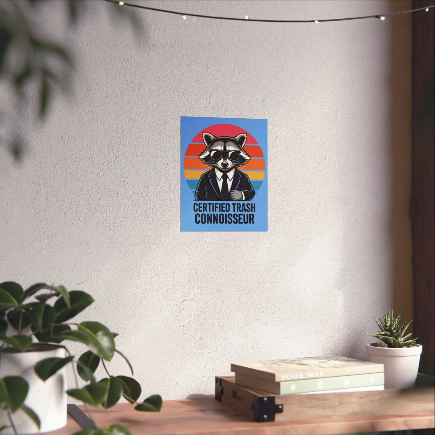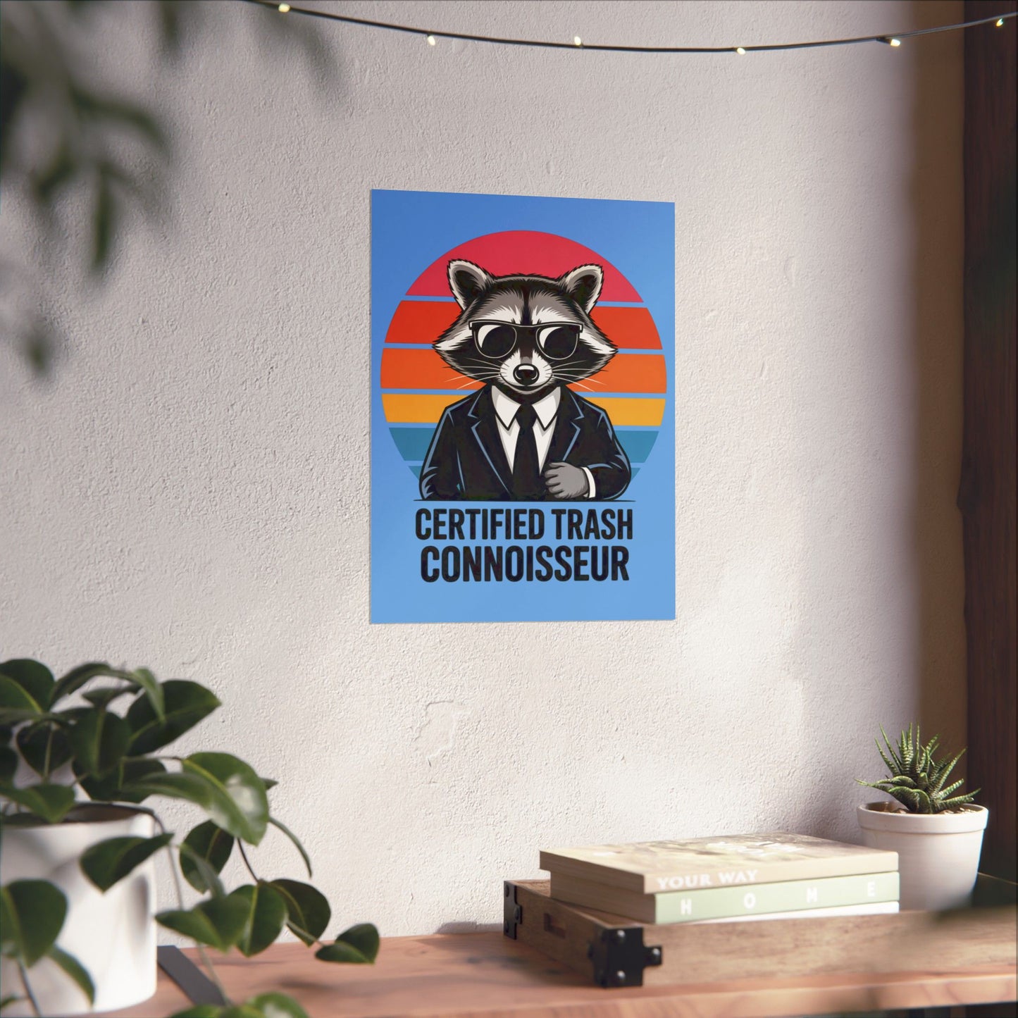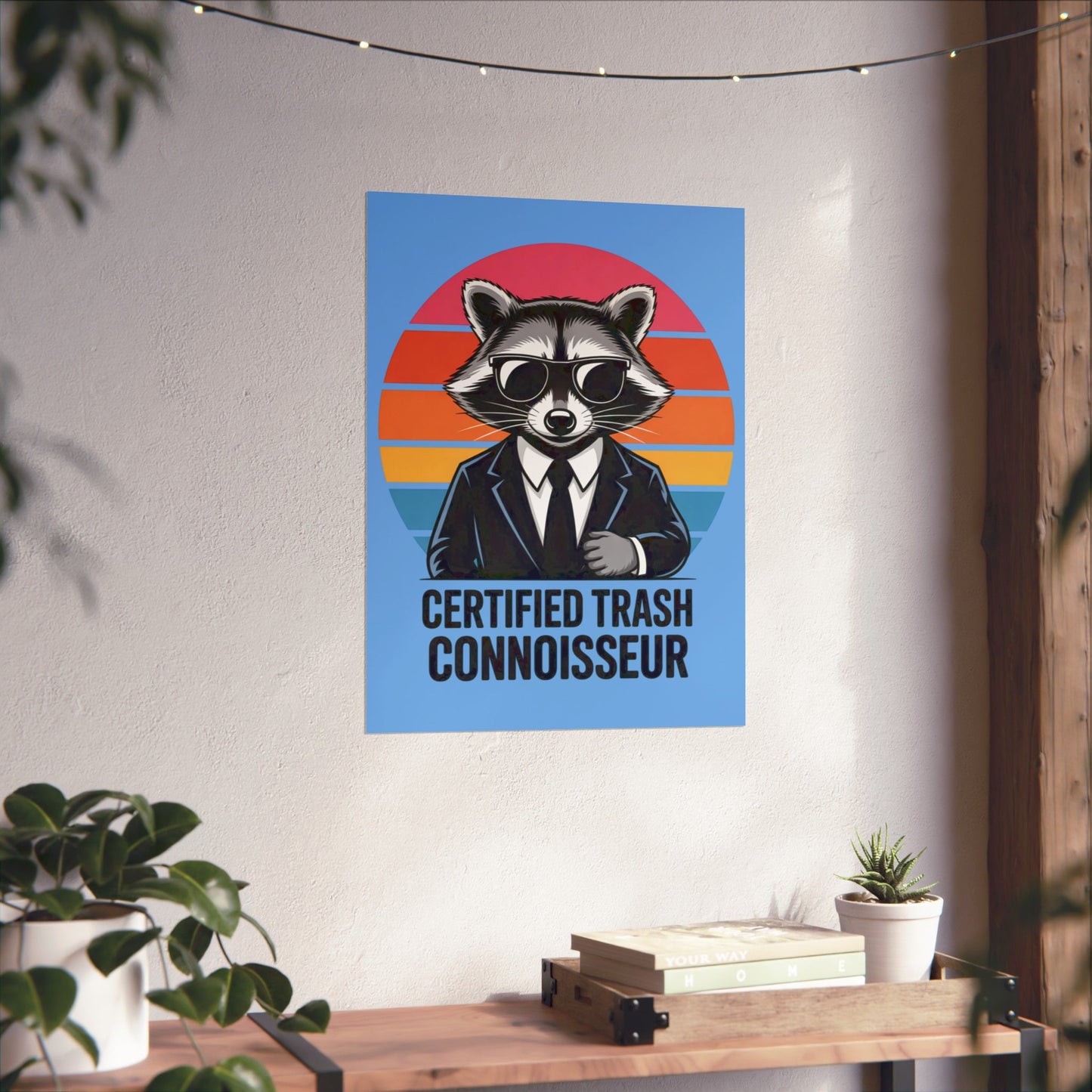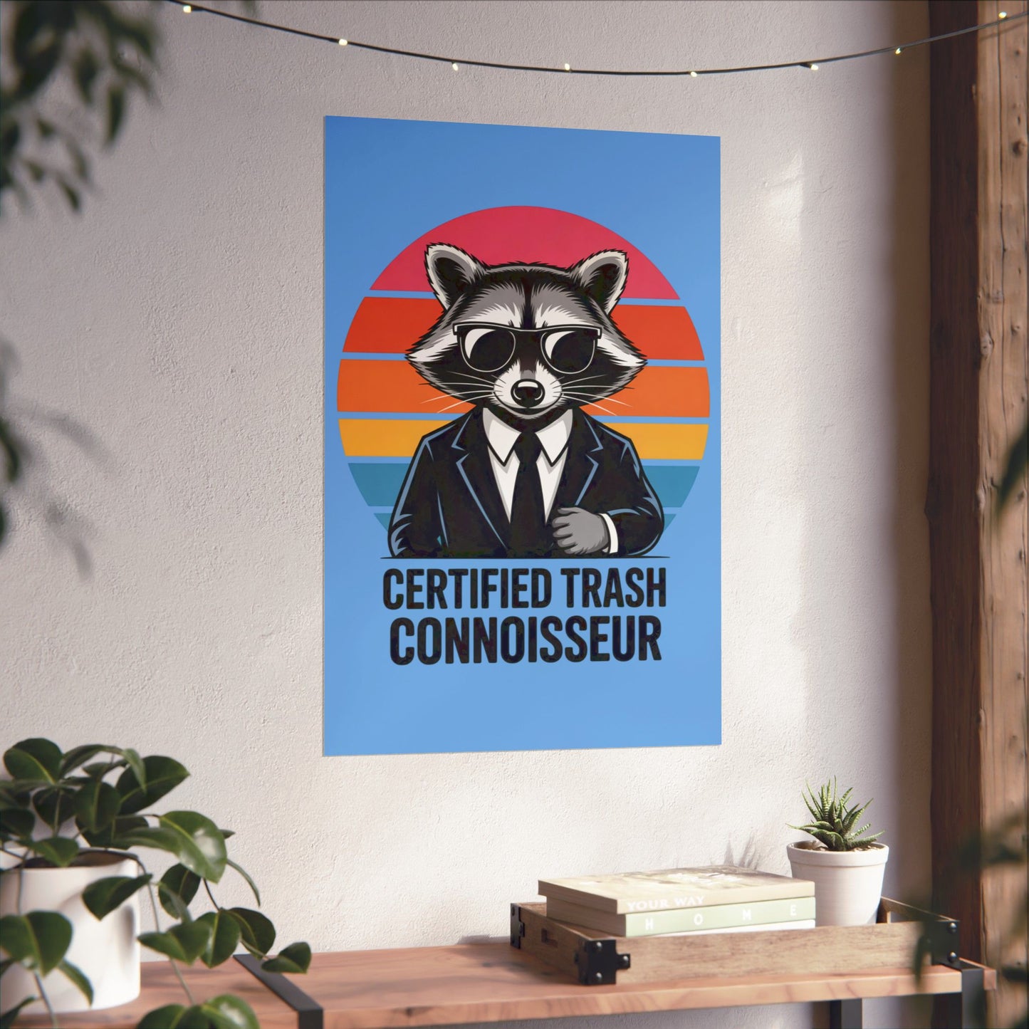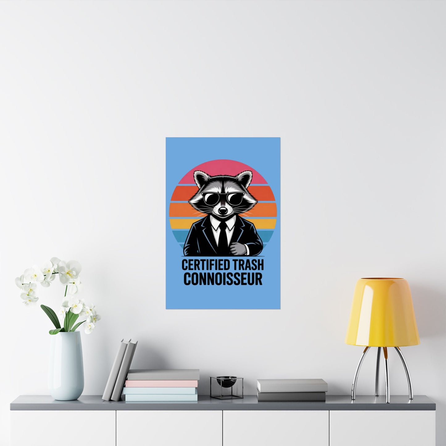 A fun poster featuring a raccoon with the text 'Certified Trash Connoisseur'. Perfect for adding a touch of whimsy to any room. Ideal for those who appreciate quirky decor and humor. Relevant for birthdays, housewarmings, and dorm room decorations.