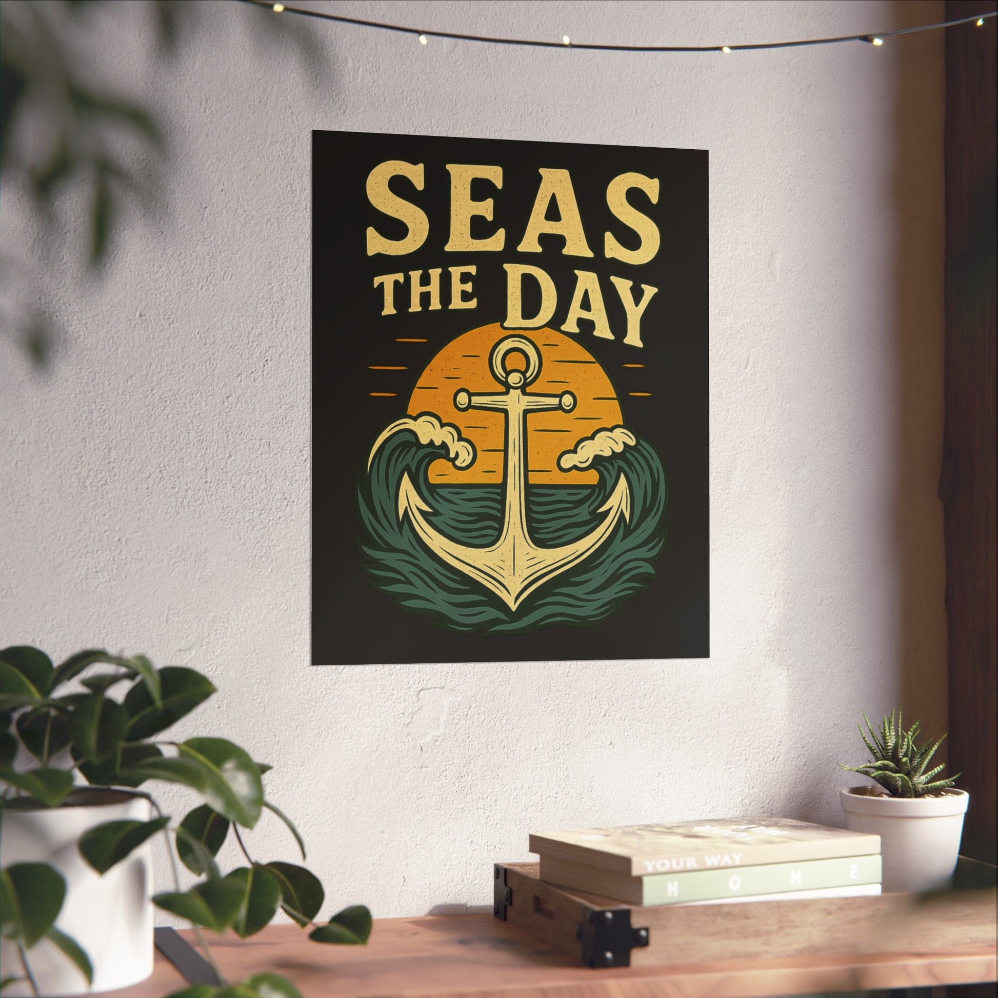 A fun poster with an anchor at sunset that states "Seas the Day". Perfect for adding a touch of nautical charm to any room. Ideal for those who love coastal decor and beach-themed items. Relevant for summer decor, beach house decorations, and ocean lovers.