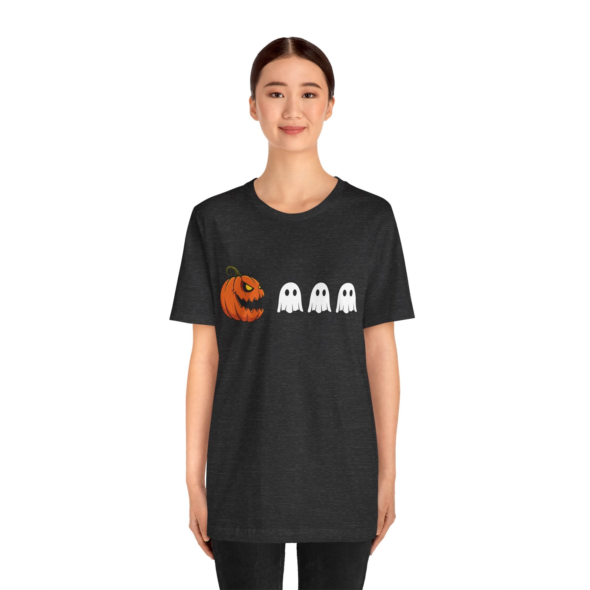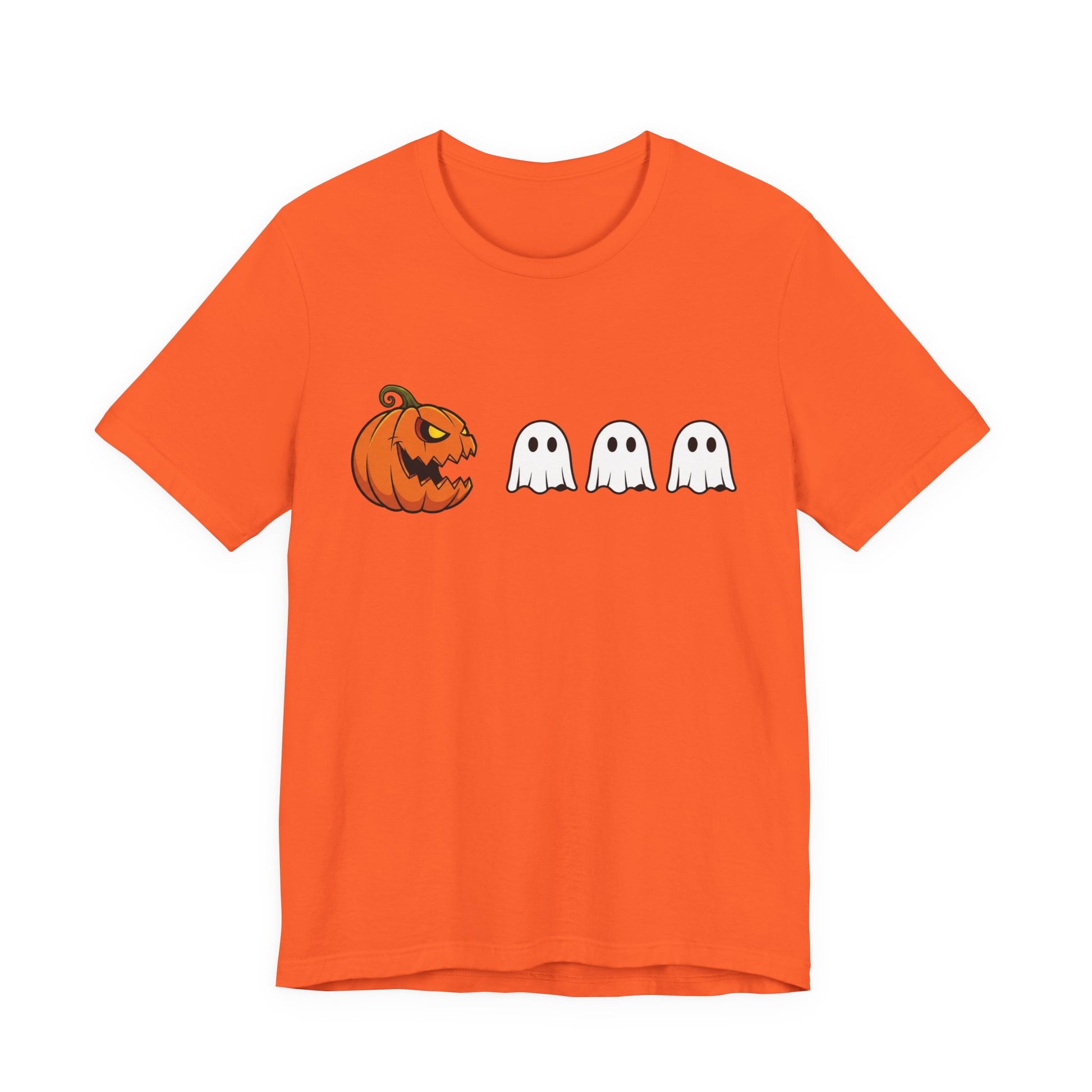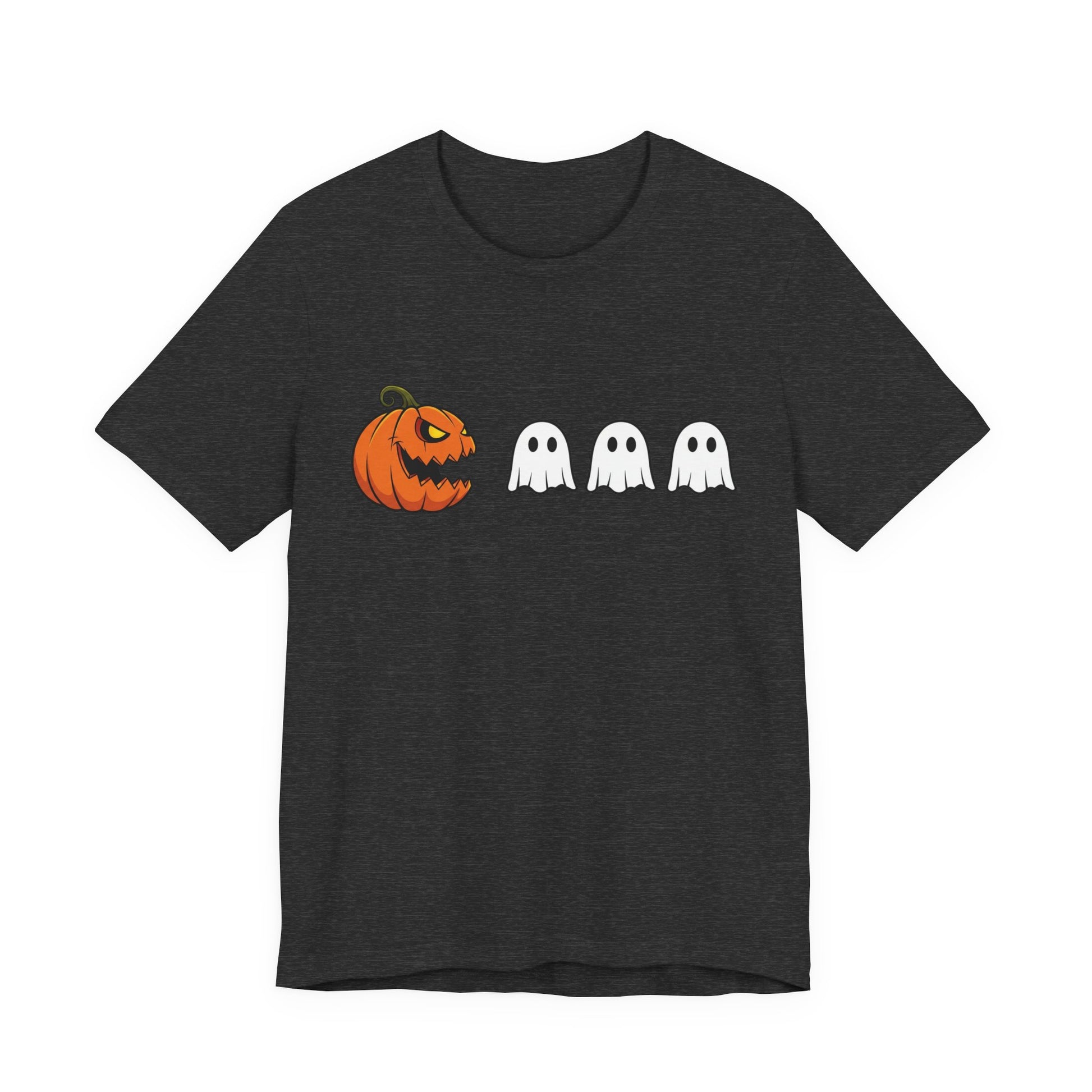 Vibrant pumpkin and ghost graphics pop against a black tee