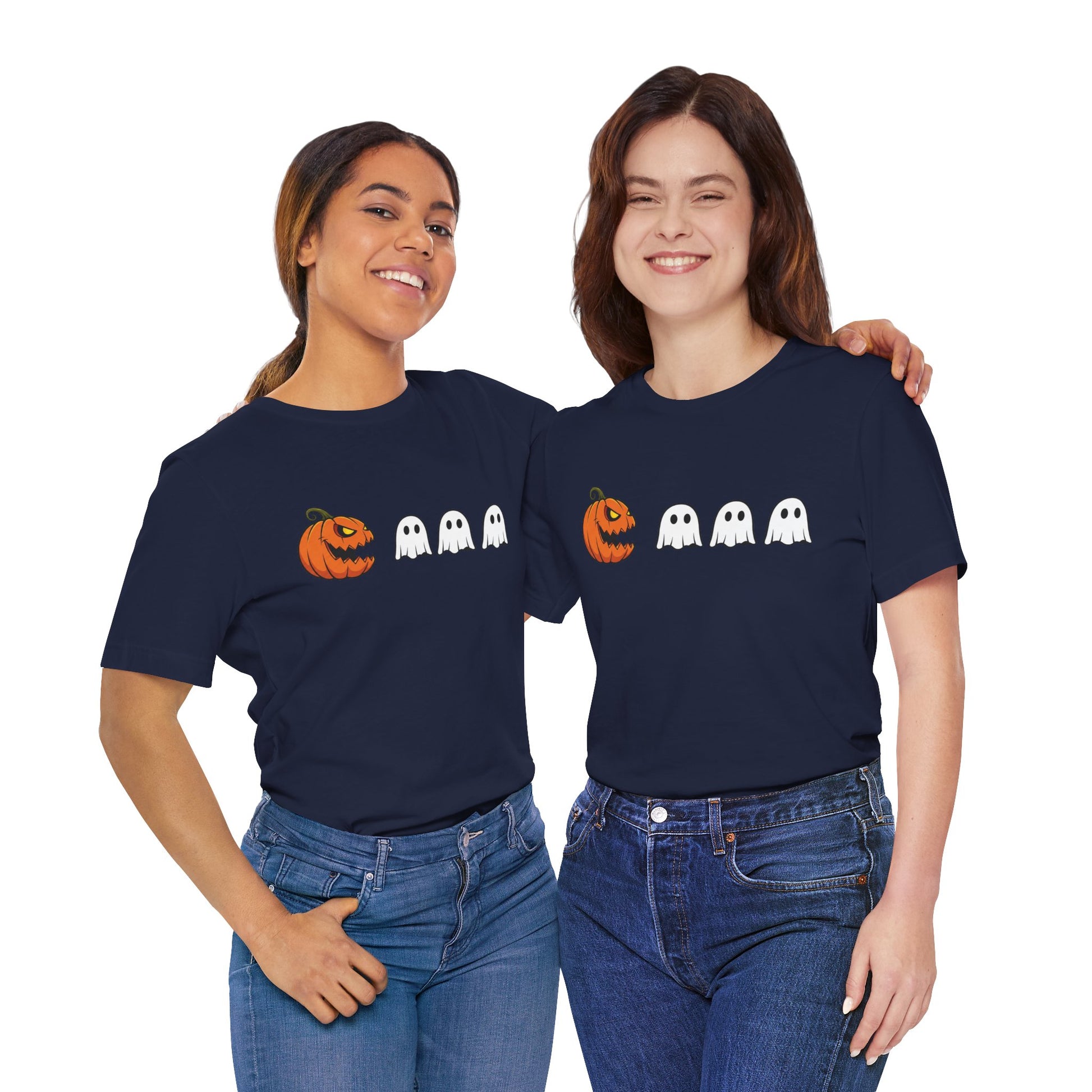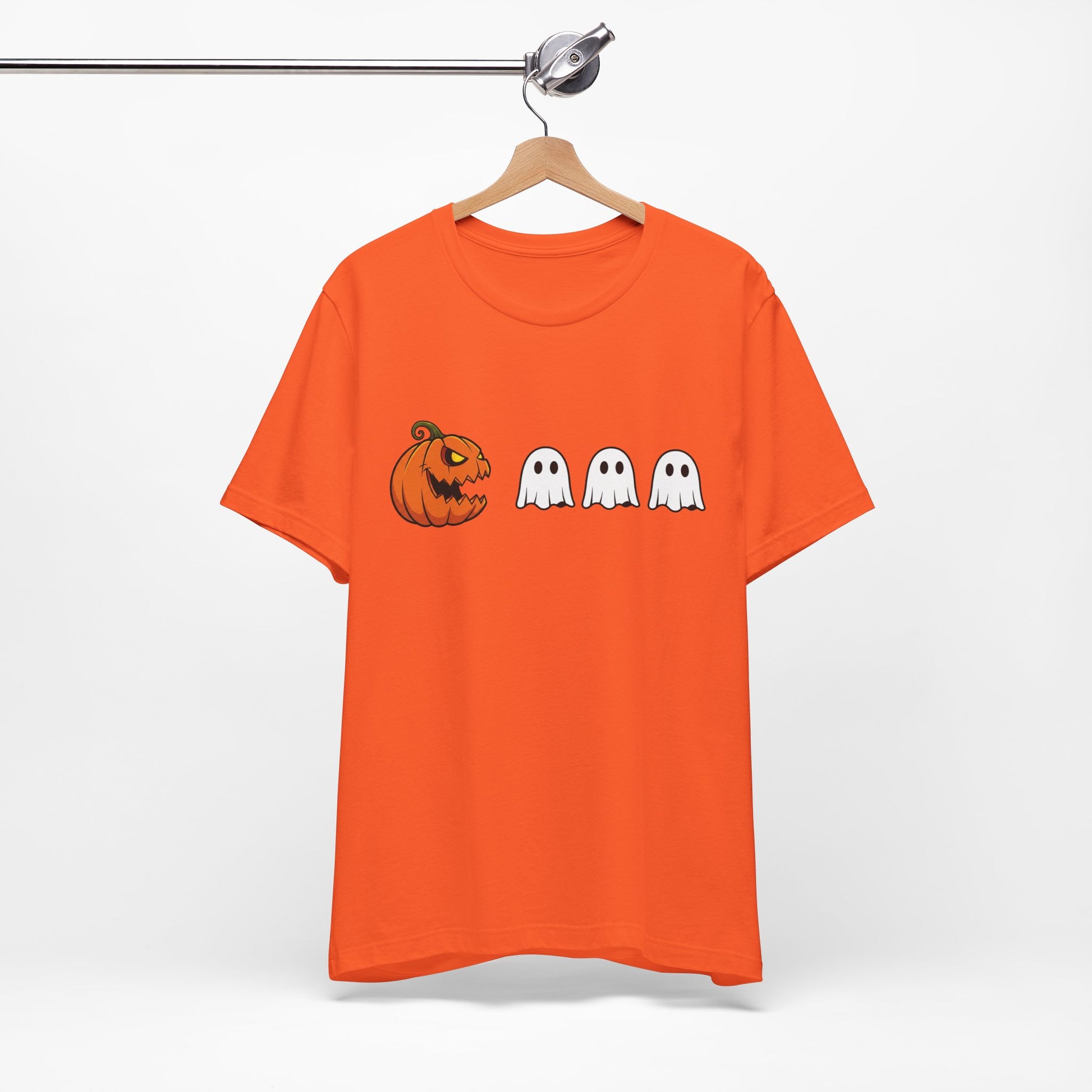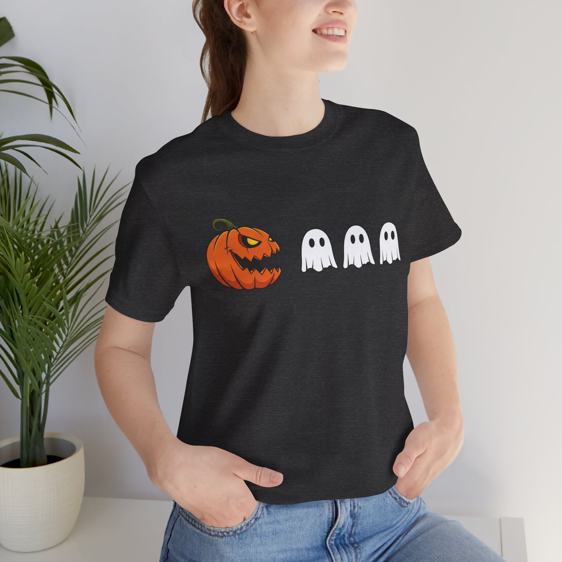 Vibrant pumpkin and ghost graphics pop against a black tee