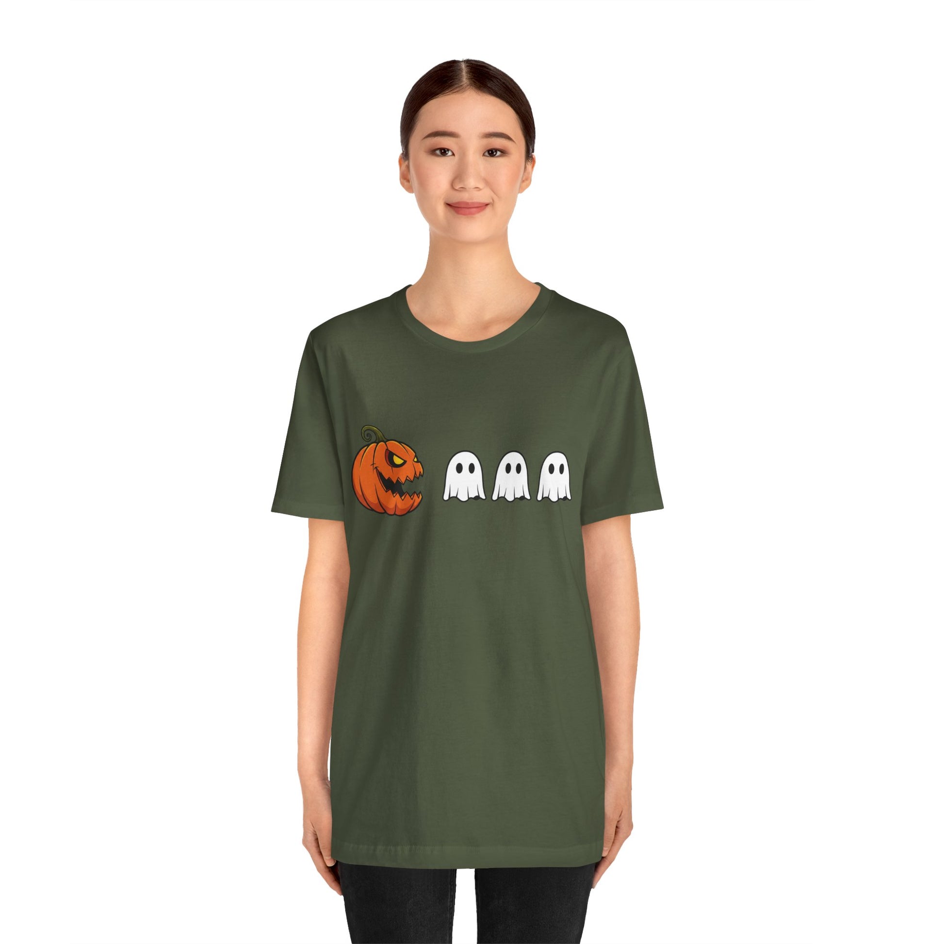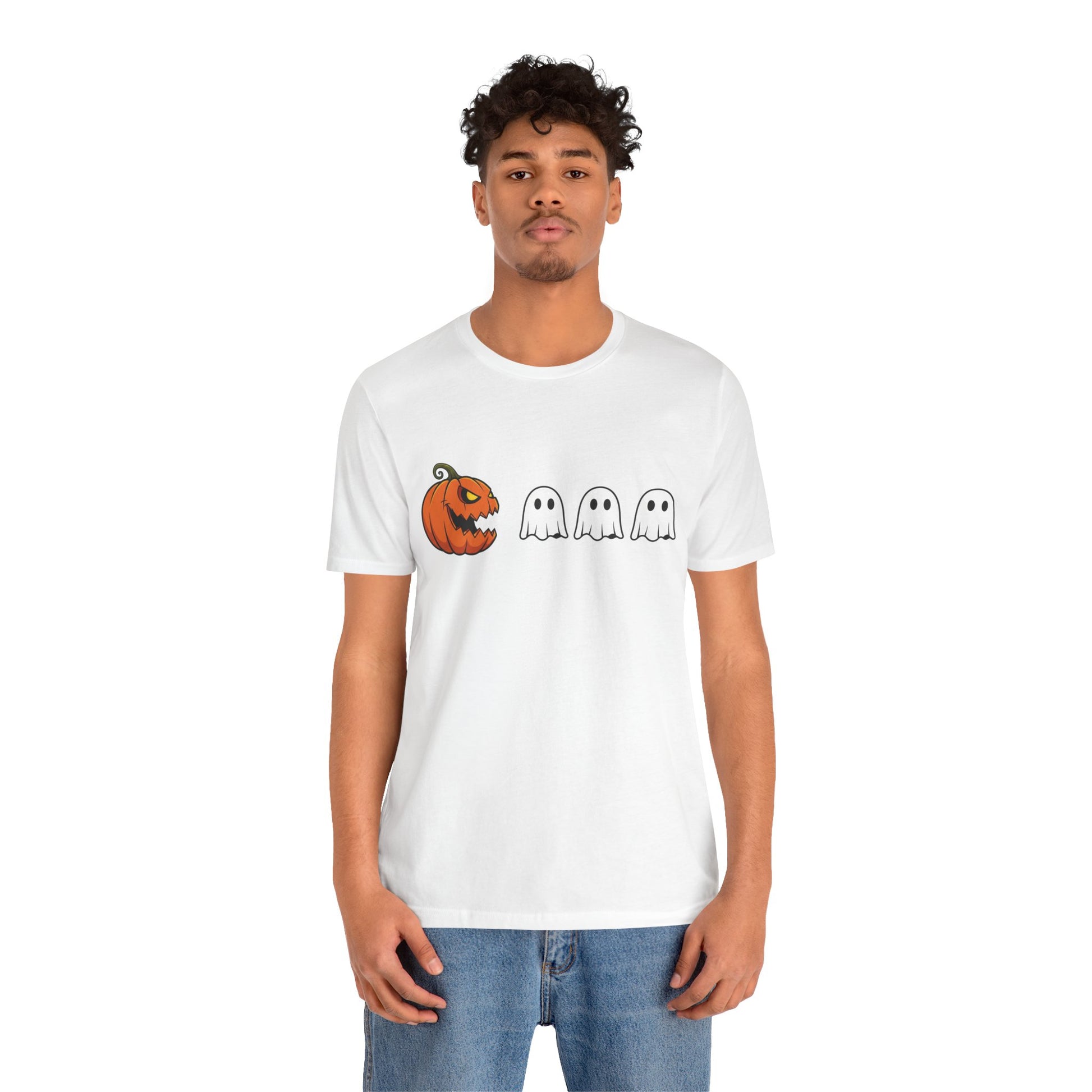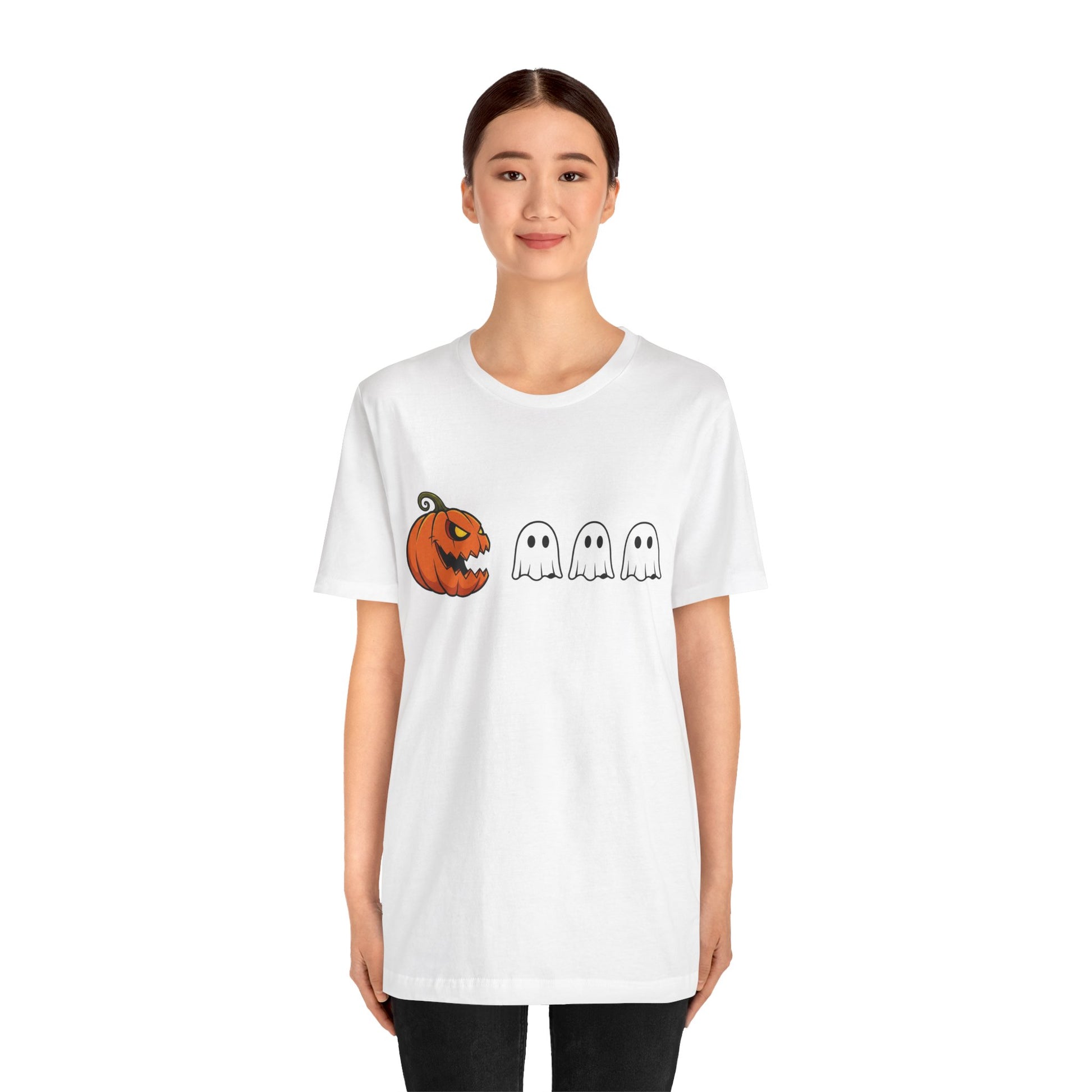 Get into the spooky spirit with this pumpkin Pac-Man shirt, turning a classic jack-o'-lantern into a retro arcade hero chasing ghosts! A clever mashup of Halloween and vintage gaming, it's ideal for anyone who loves quirky, nostalgic style.