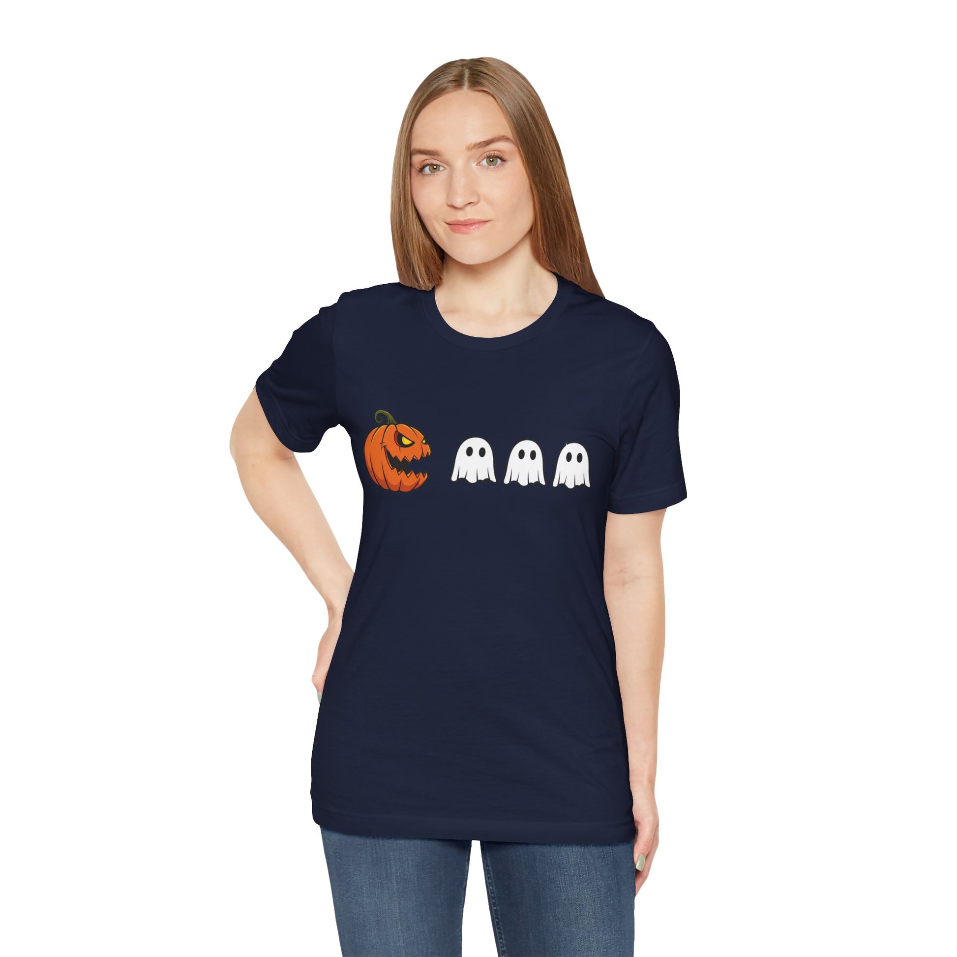 This quirky pumpkin Pac-Man shirt playfully reimagines a jack-o'-lantern as a ghost-chasing video game icon—perfect for retro gamers with a spooky sense of humor. The bold, nostalgic design brings arcade-style fun to your Halloween wardrobe.