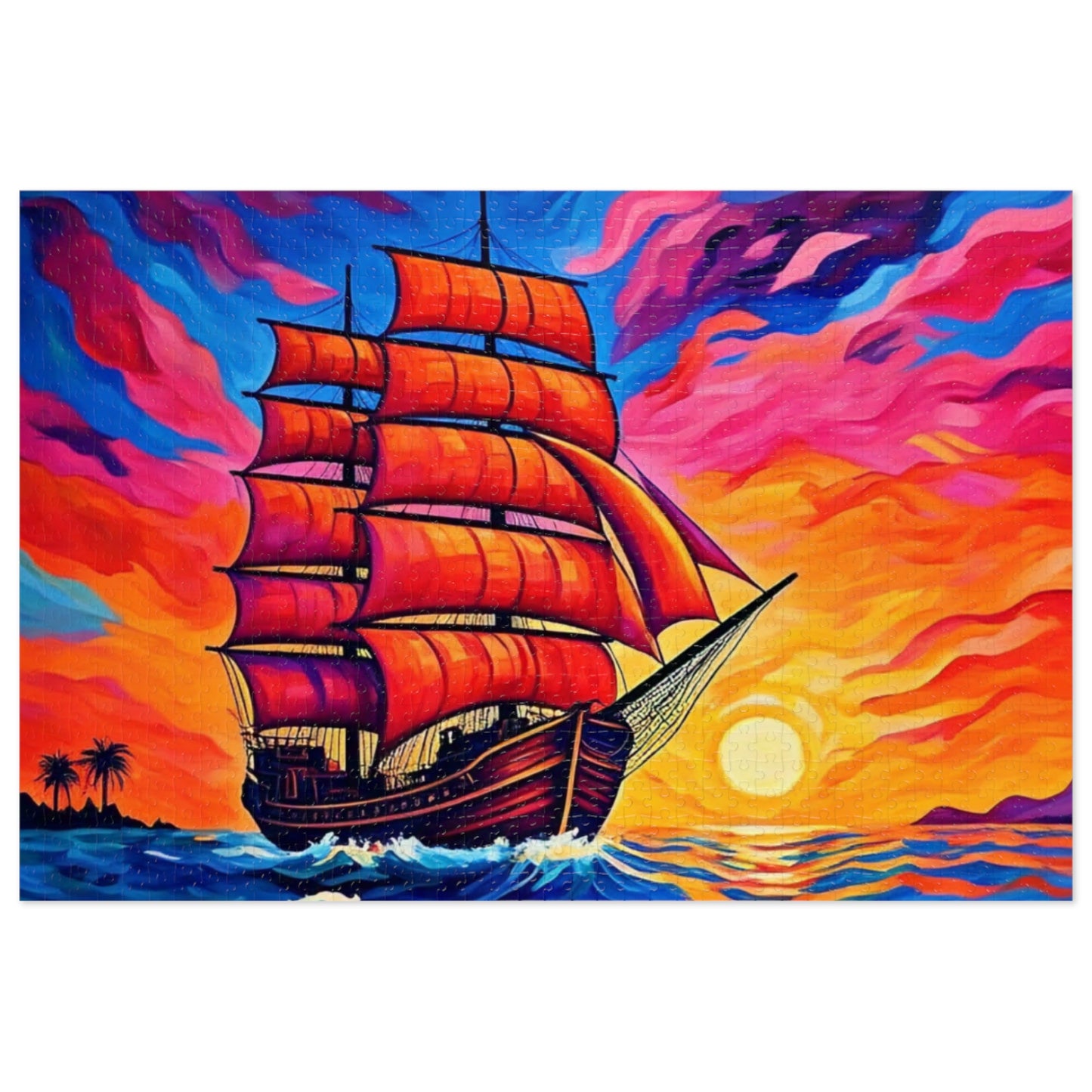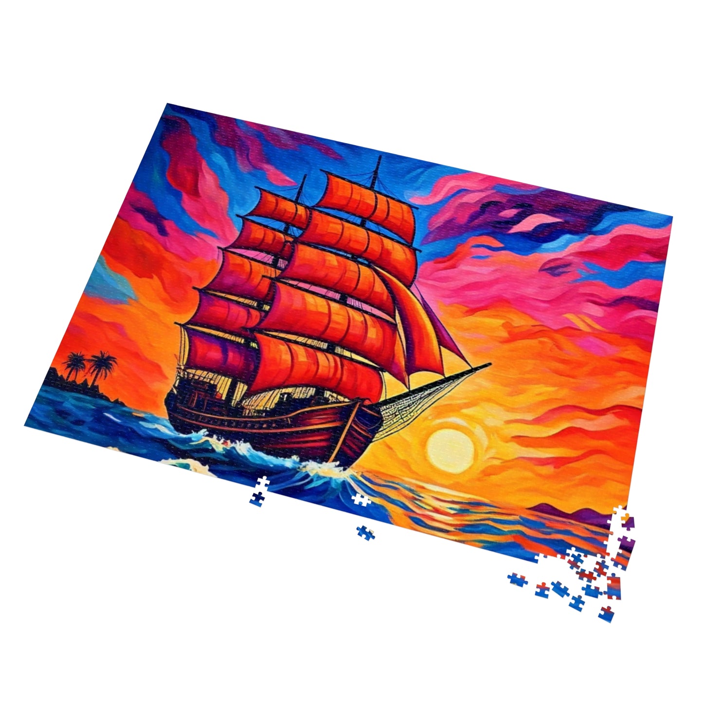 A fun puzzle with a colorful painting of a ship sailing at sunset. This jigsaw puzzle offers a relaxing and engaging activity for puzzle enthusiasts. Perfect for anyone who enjoys challenging their mind and appreciates beautiful artwork. Ideal for gifting during holidays, birthdays, or as a thoughtful surprise.