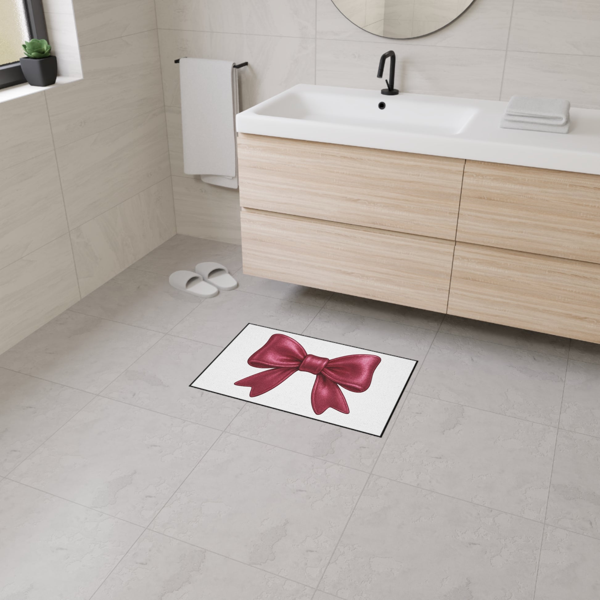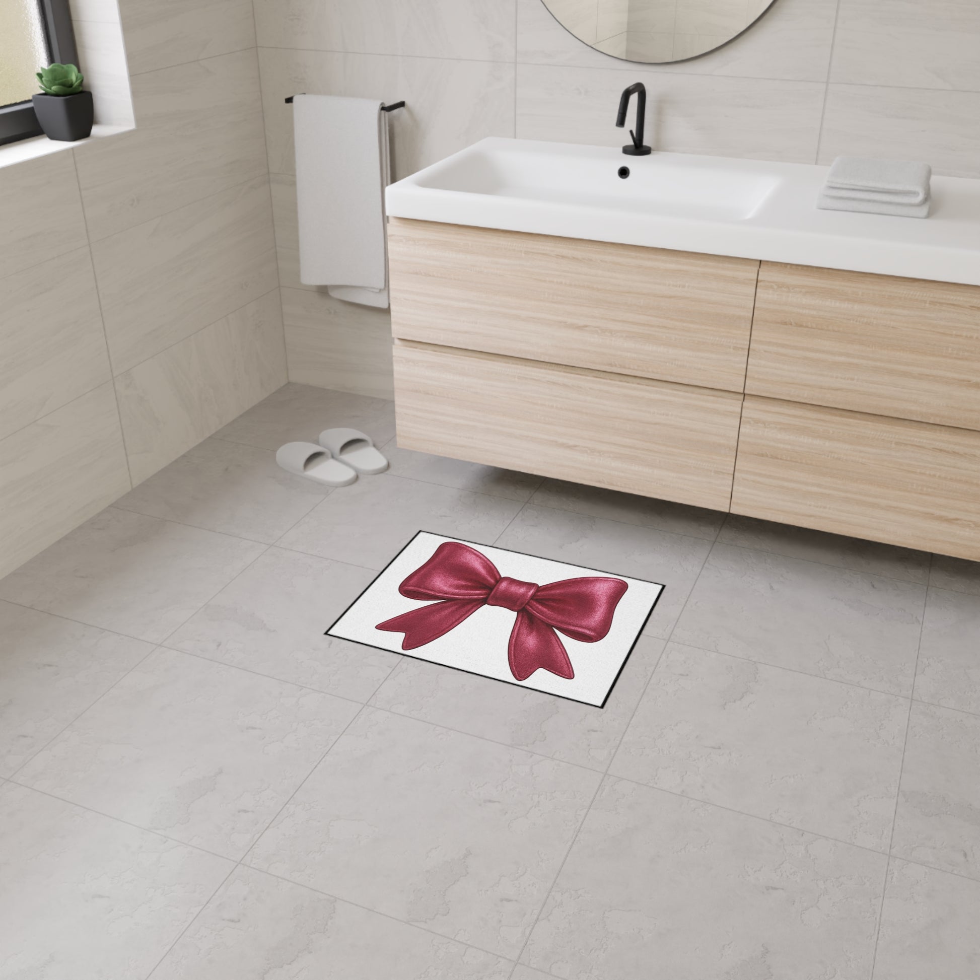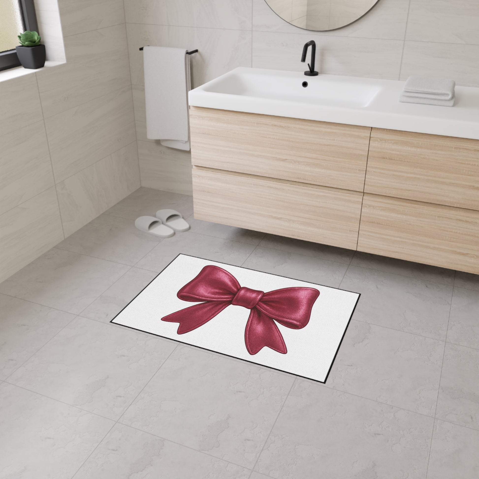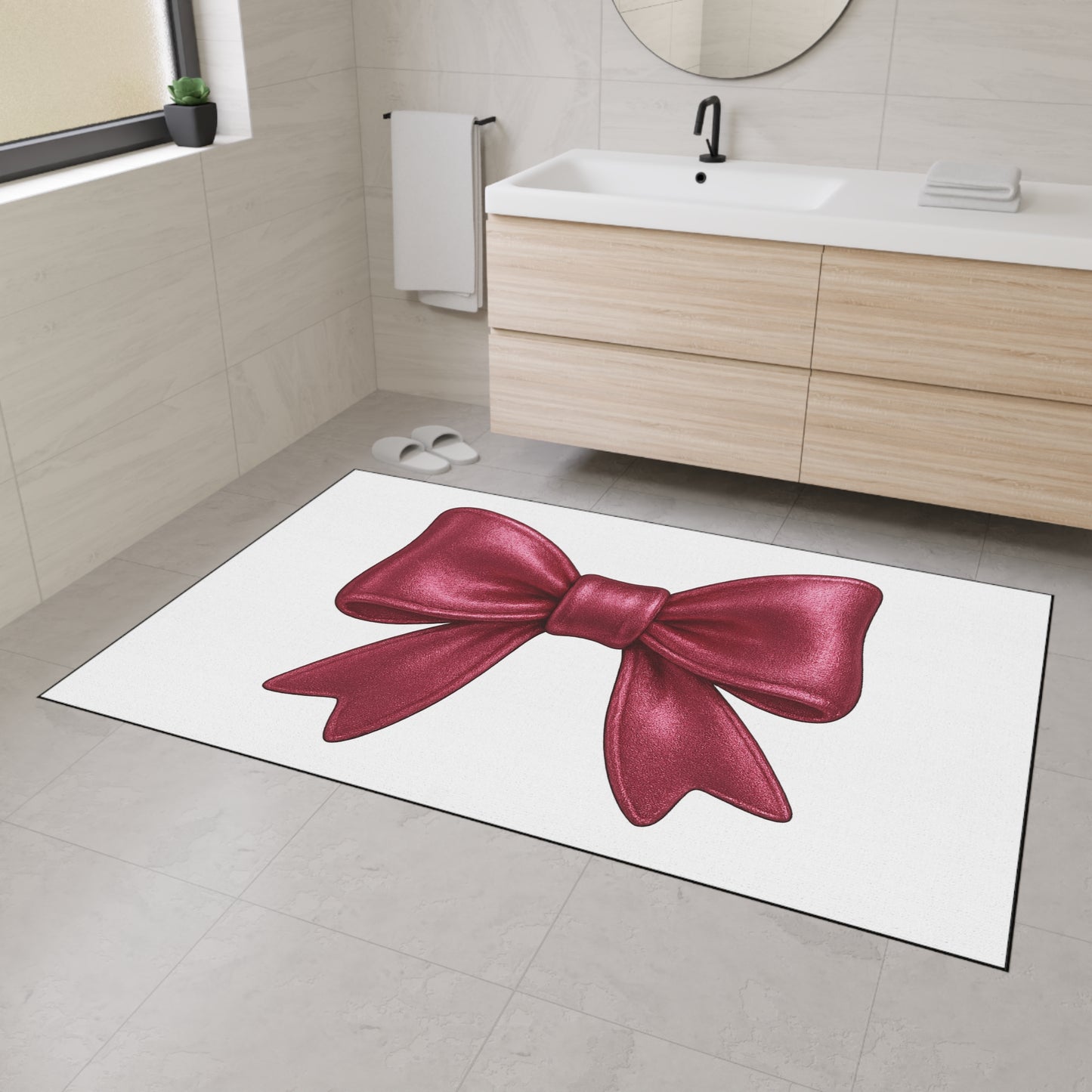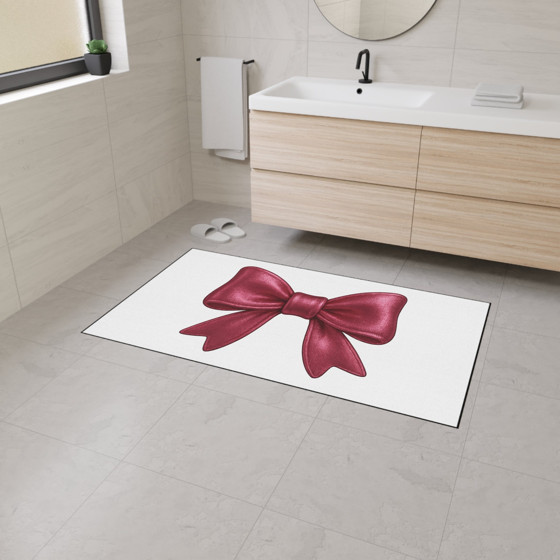 This eye-catching mat features a bold satin-look red bow against a clean white background, offering a chic pop of personality to your entryway, bathroom, vanity space, or dorm. Whether you're decorating for the holidays or simply love a glam aesthetic, this mat makes every entrance fabulous.