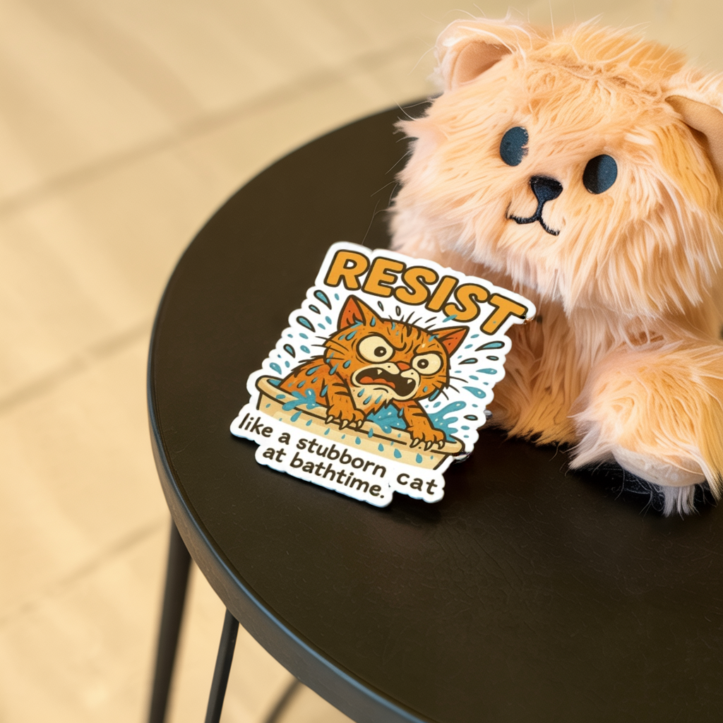 Express your inner stubbornness—just like a cat resisting bath time! This die‑cut vinyl sticker features a hilarious cat illustration and bold “RESIST” text, perfect for making a statement.