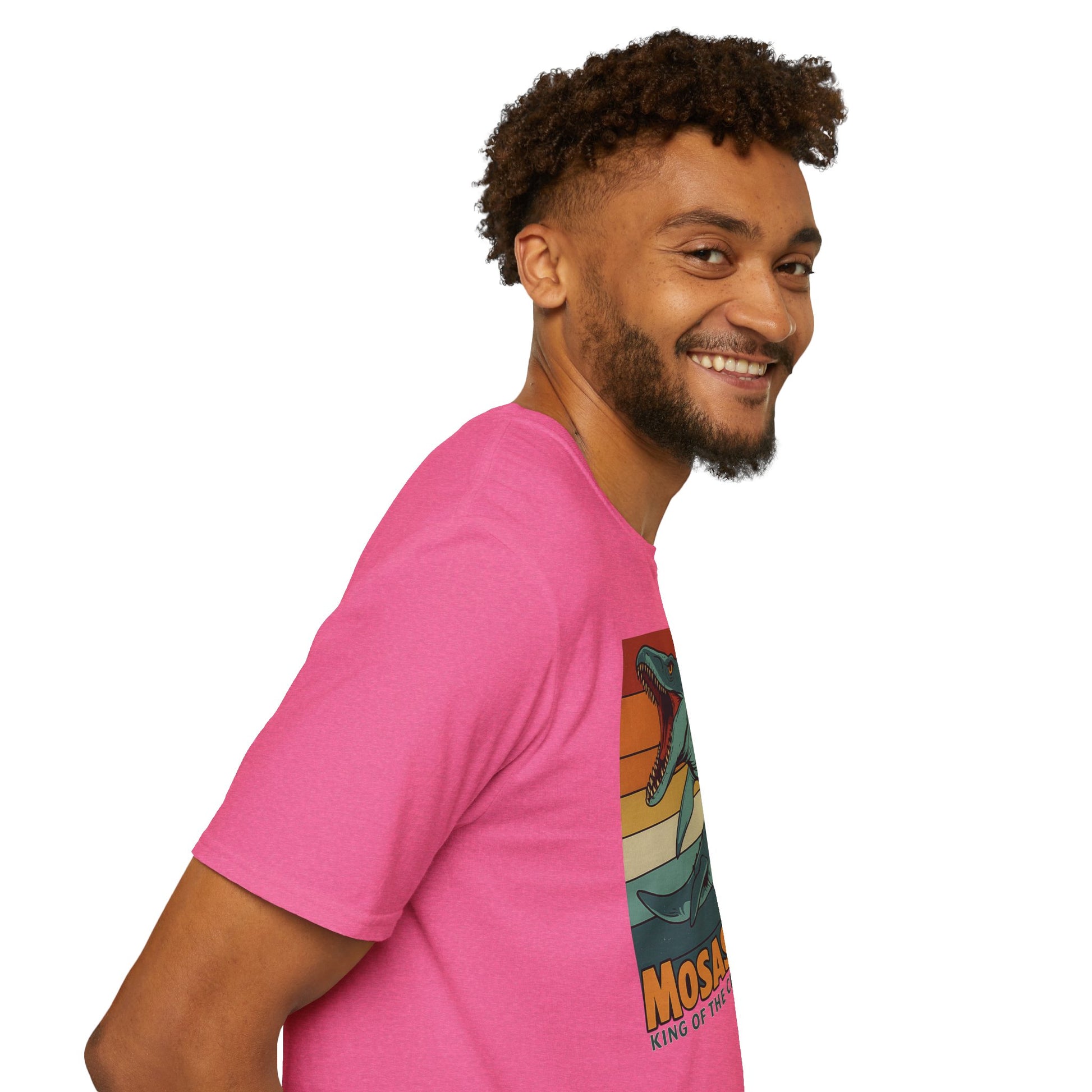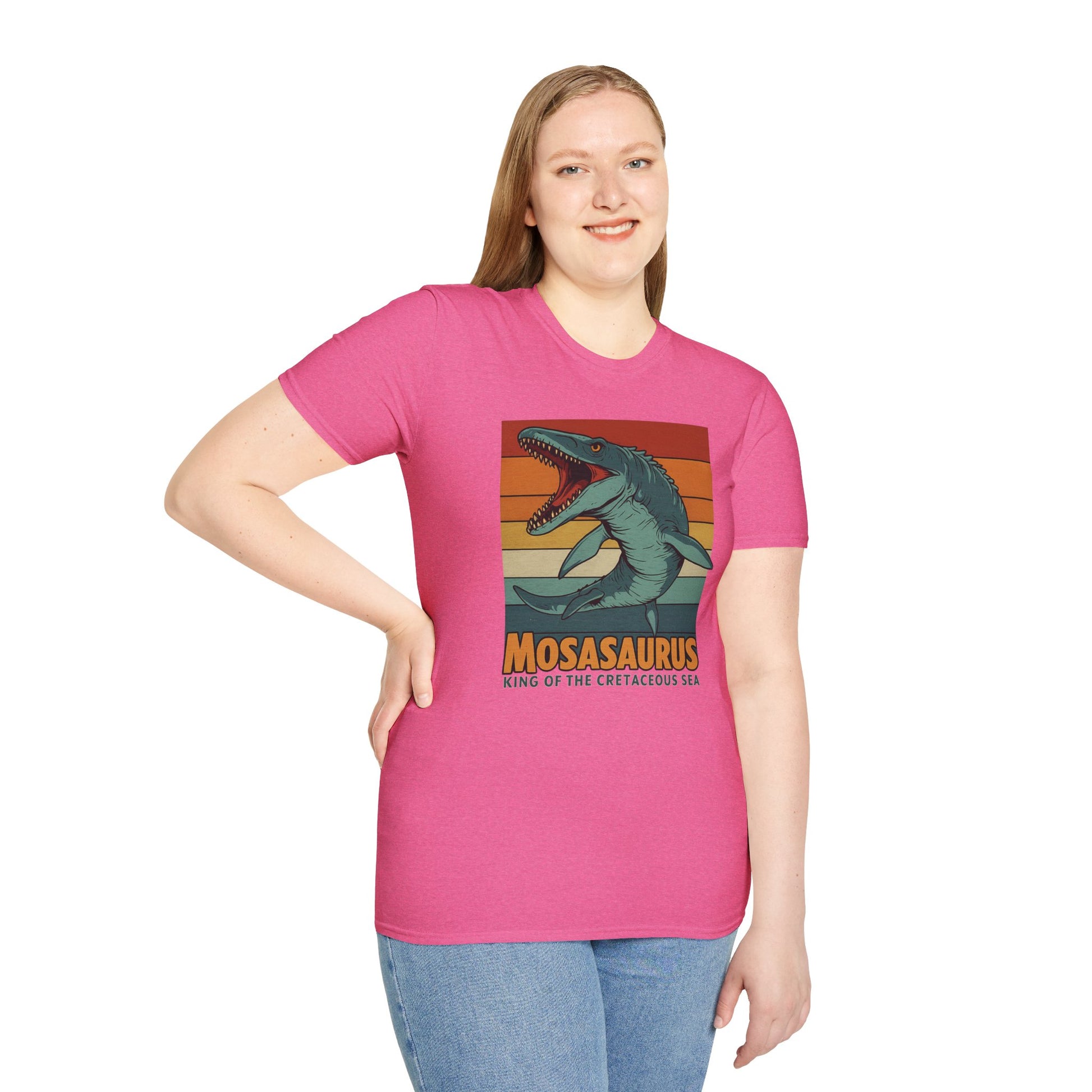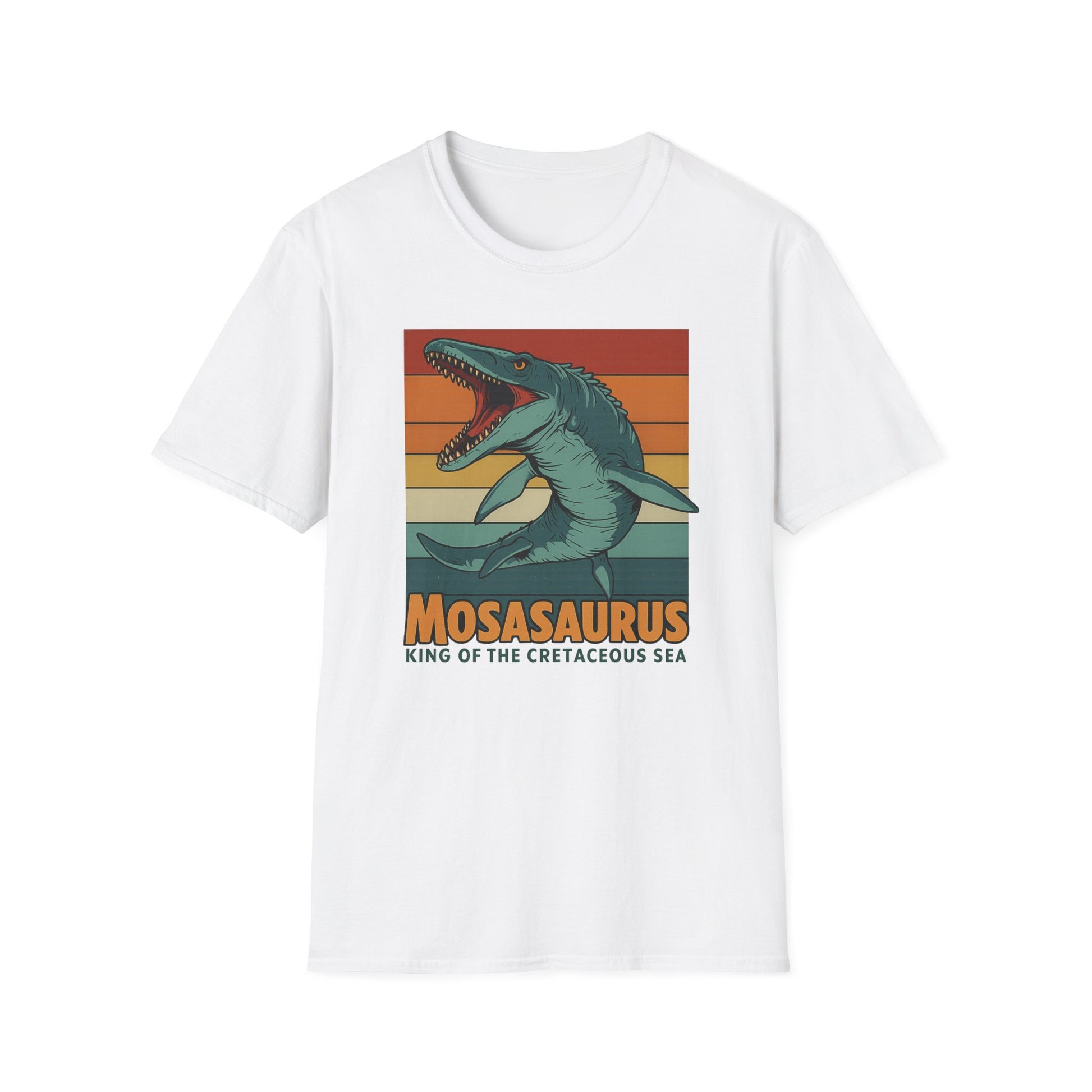 Expertly printed on soft, unisex soft cotton fabric, this tee features a vibrant, vintage-inspired graphic of the mighty Mosasaurus—“King of the Cretaceous Sea.”