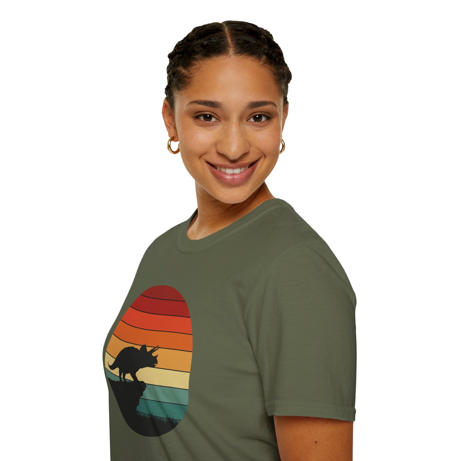 Retro Triceratops Sunset T-Shirt - Vintage Dino Graphic Tee - Unisex Softstyle Dinosaur Shirt - Nature and Prehistoric Lover Gift