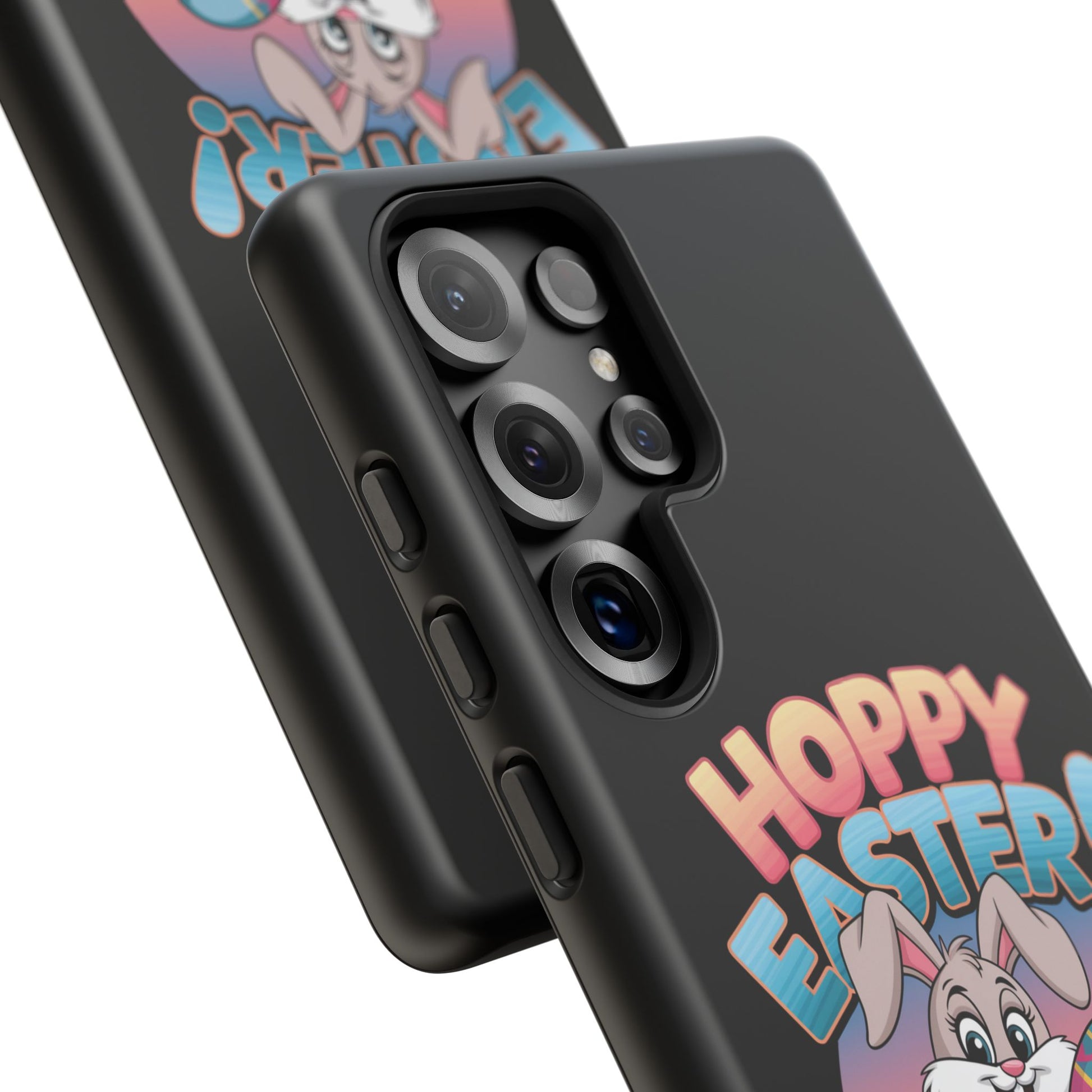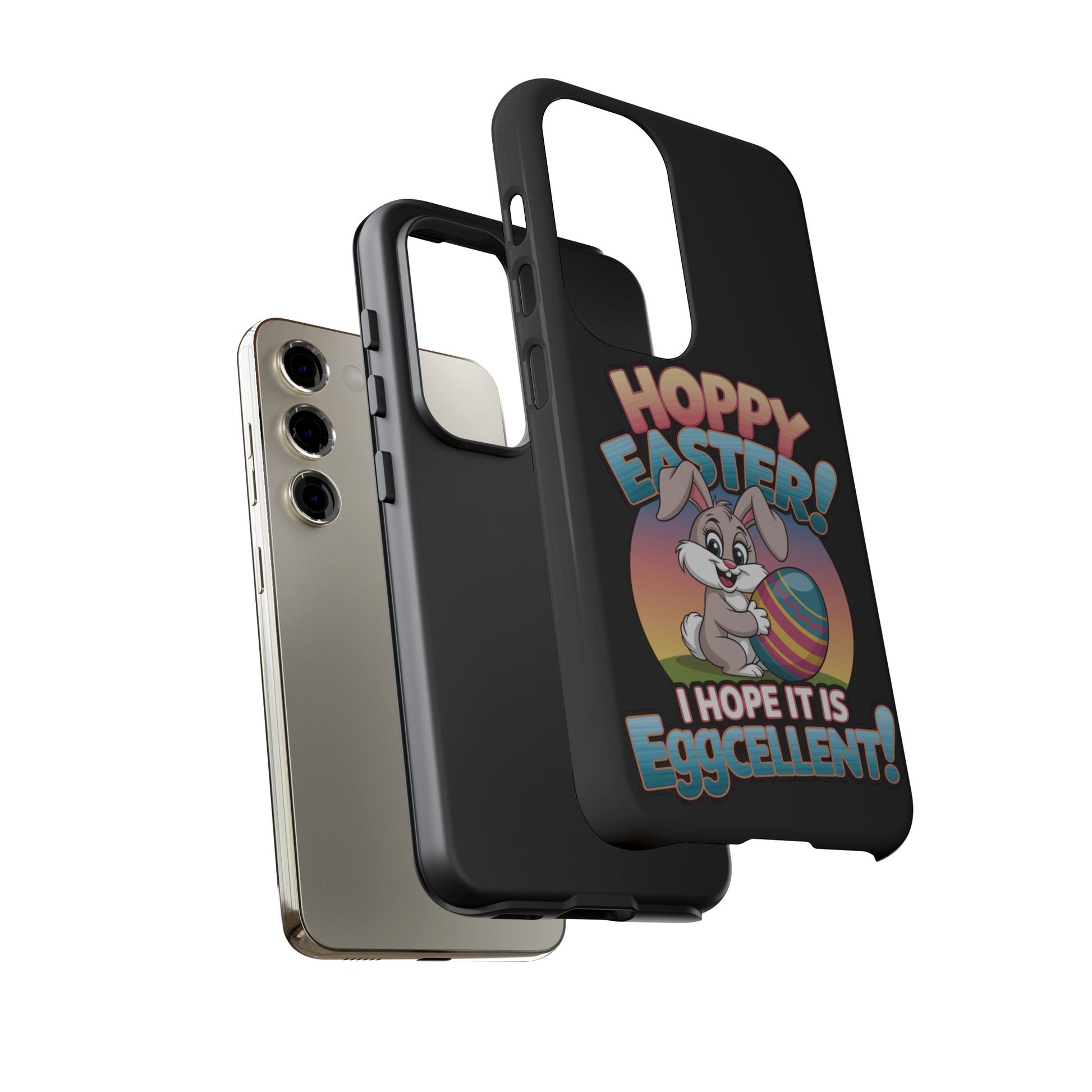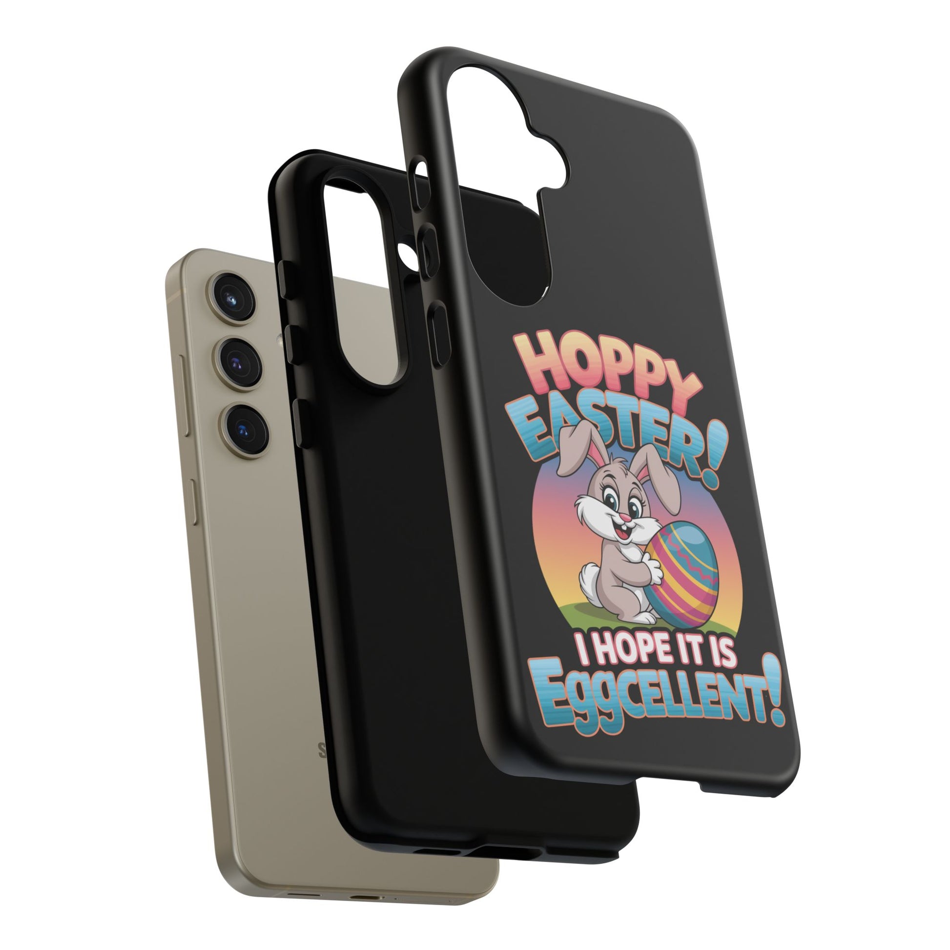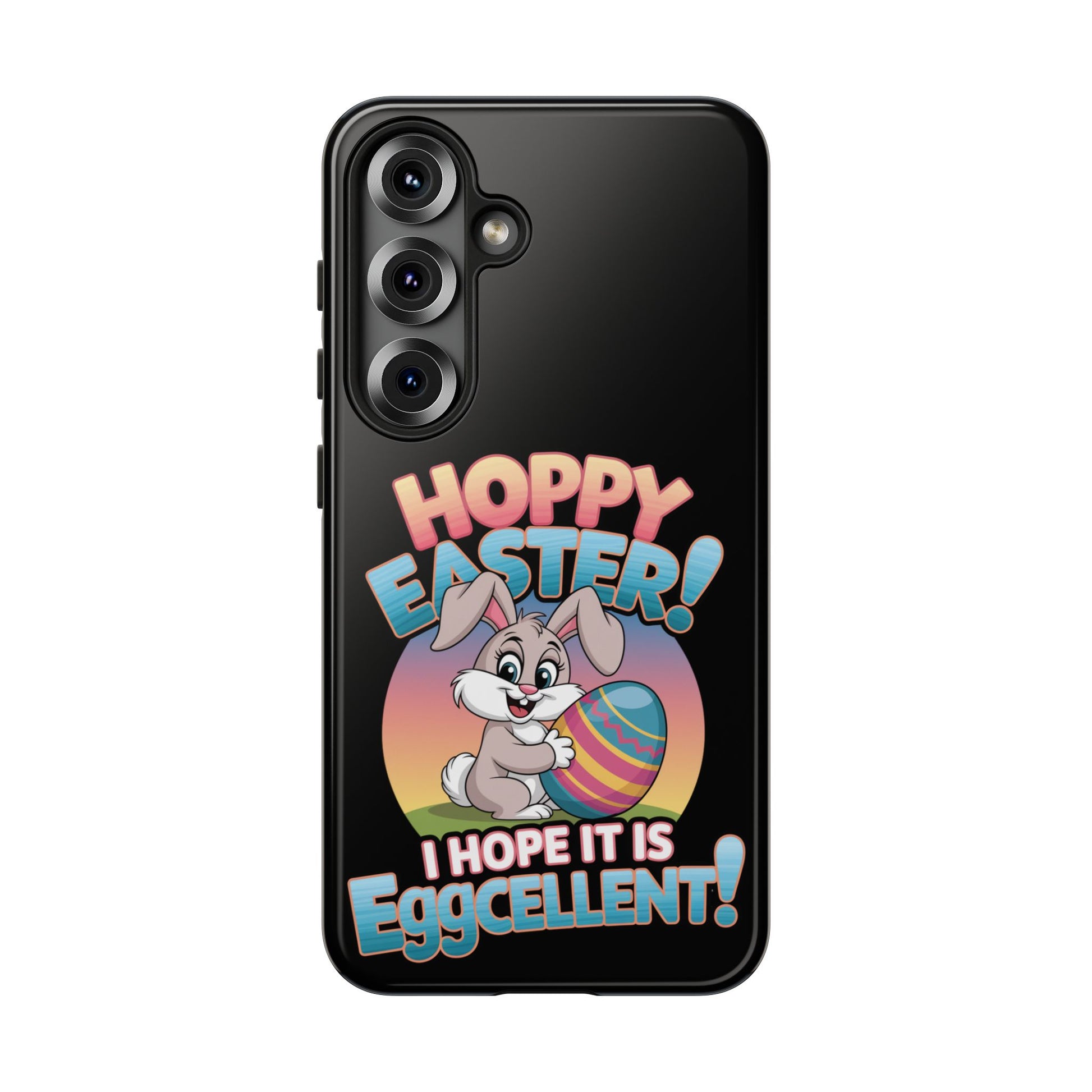 A fun Samsung Phone Case with the Easter Bunny on it that states "Hoppy Easter I Hope it is Eggcellent". This phone case exudes a playful and festive vibe, perfect for Easter celebrations. It is relevant to adults looking for a durable and impact-resistant phone case with a cute Easter design.