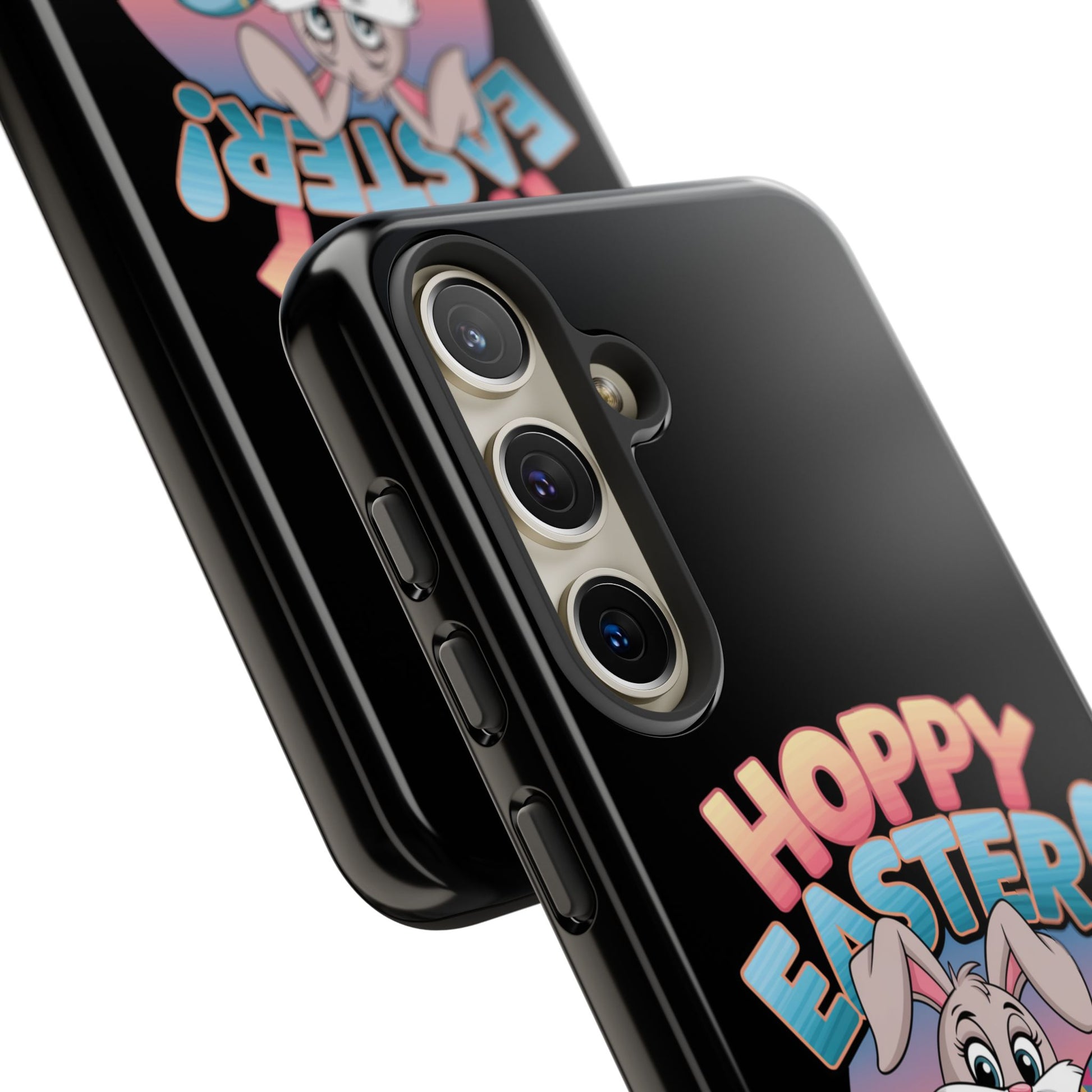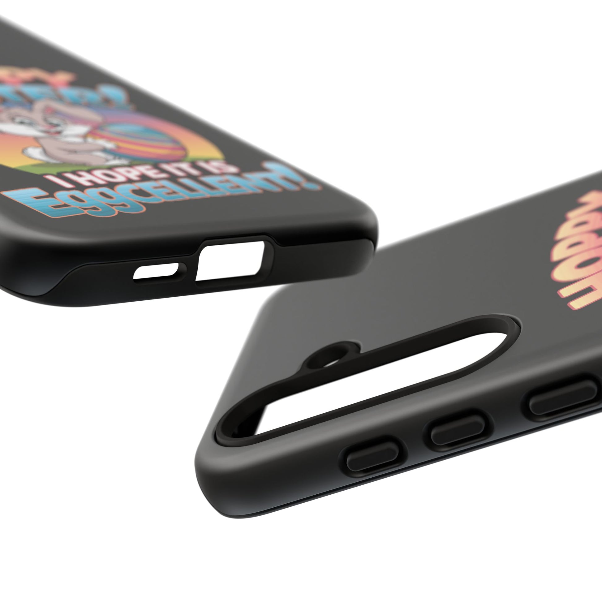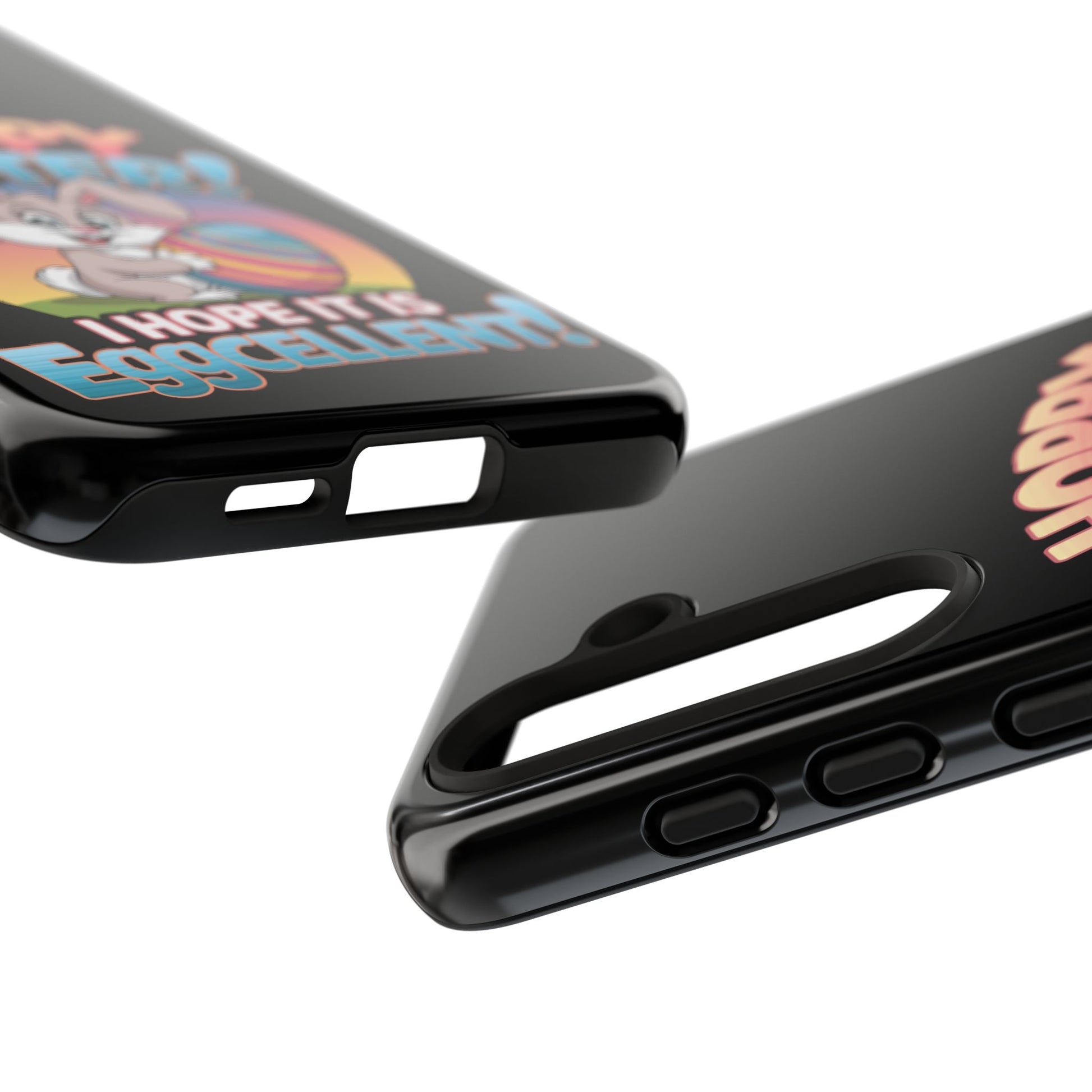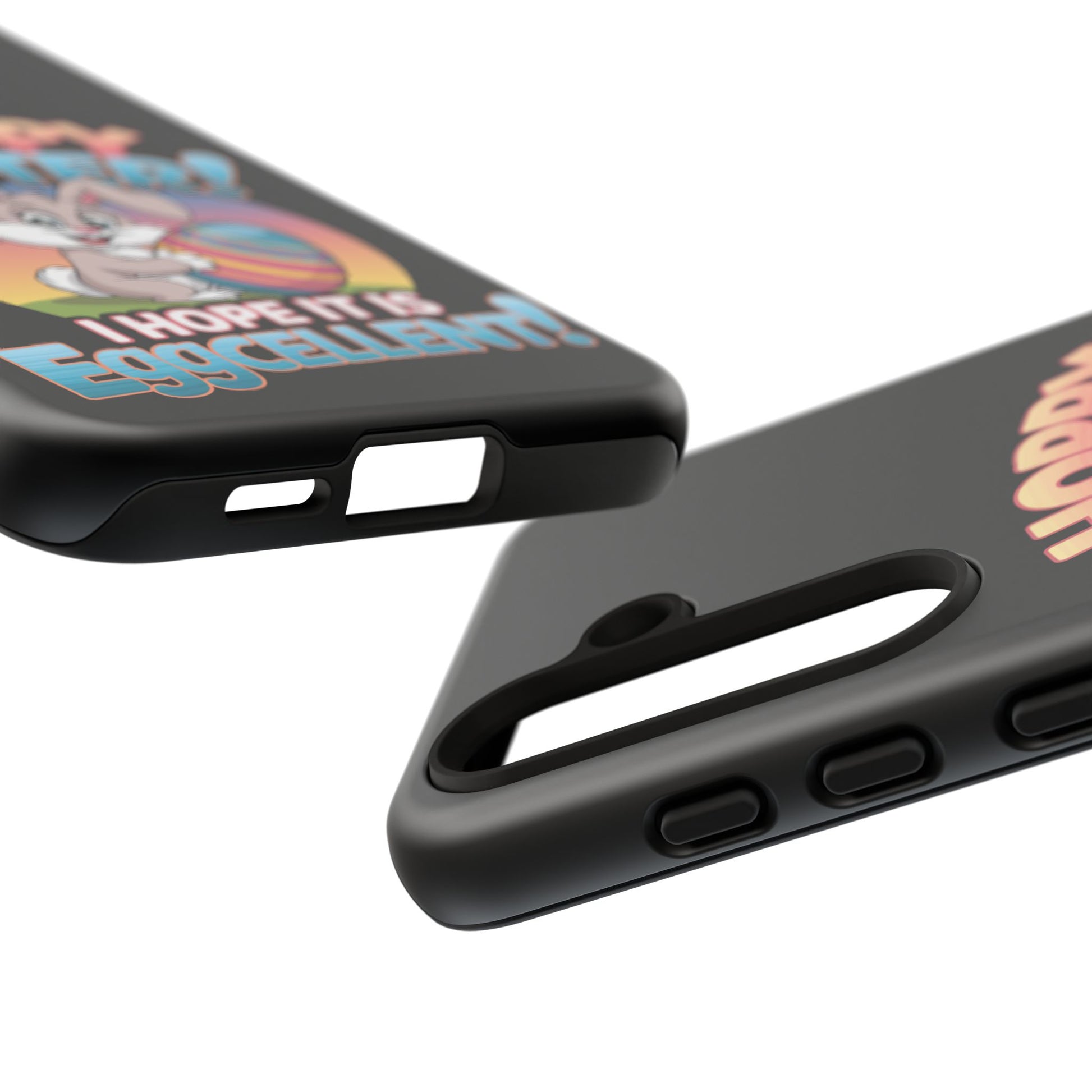 A fun Samsung Phone Case with the Easter Bunny on it that states "Hoppy Easter I Hope it is Eggcellent". This phone case exudes a playful and festive vibe, perfect for Easter celebrations. It is relevant to adults looking for a durable and impact-resistant phone case with a cute Easter design.