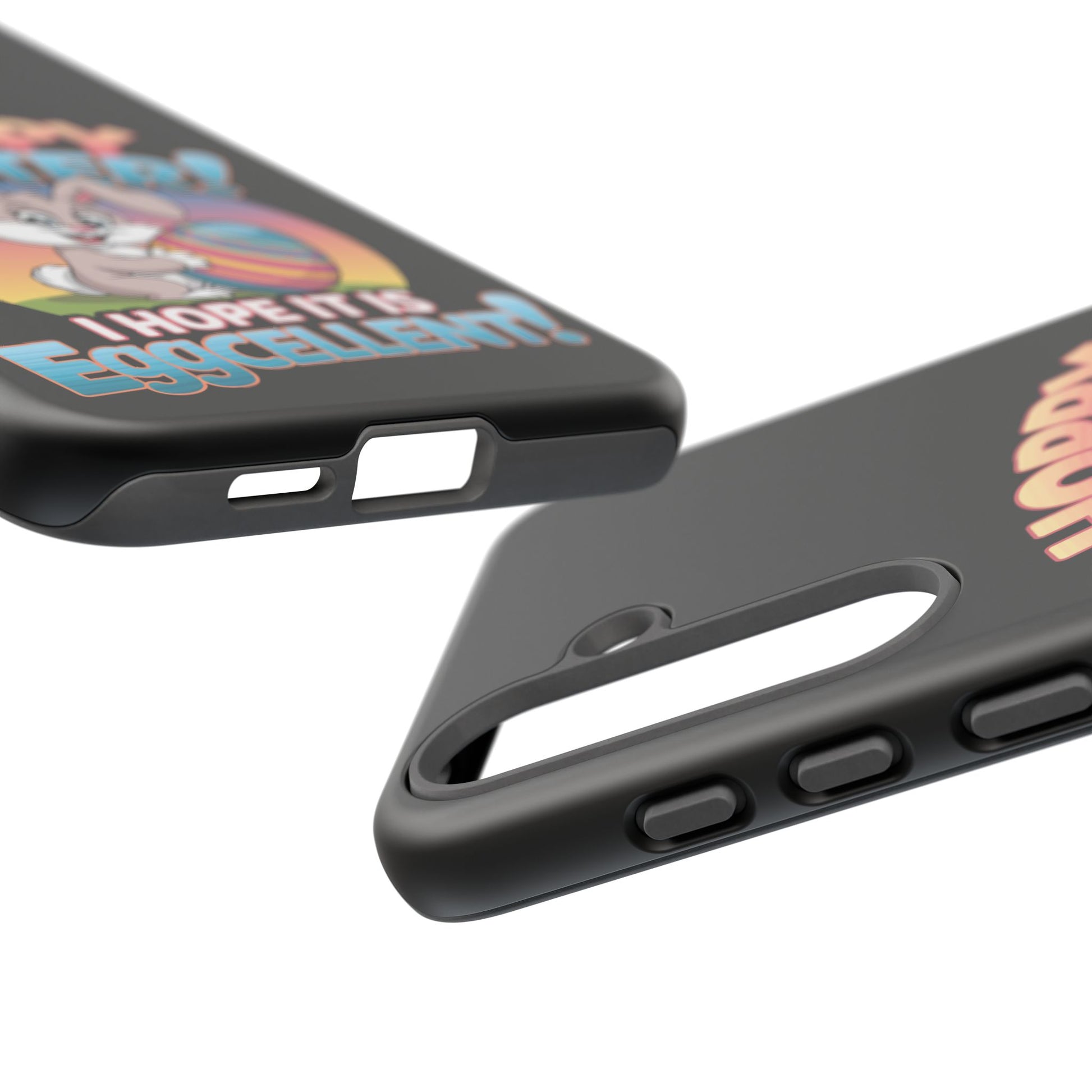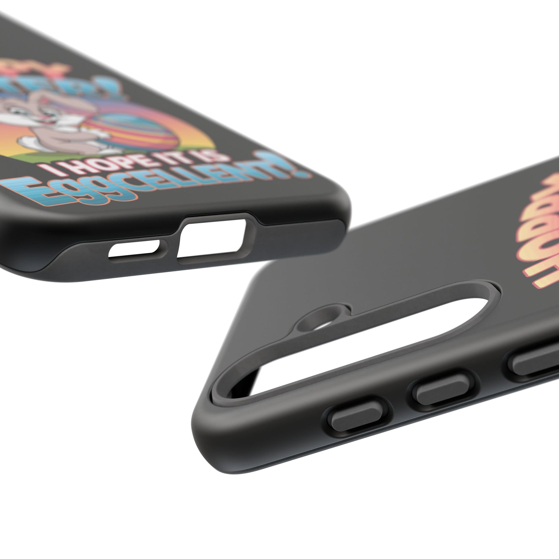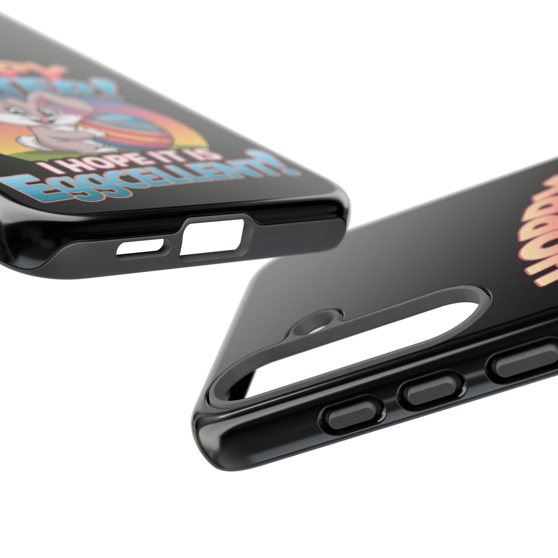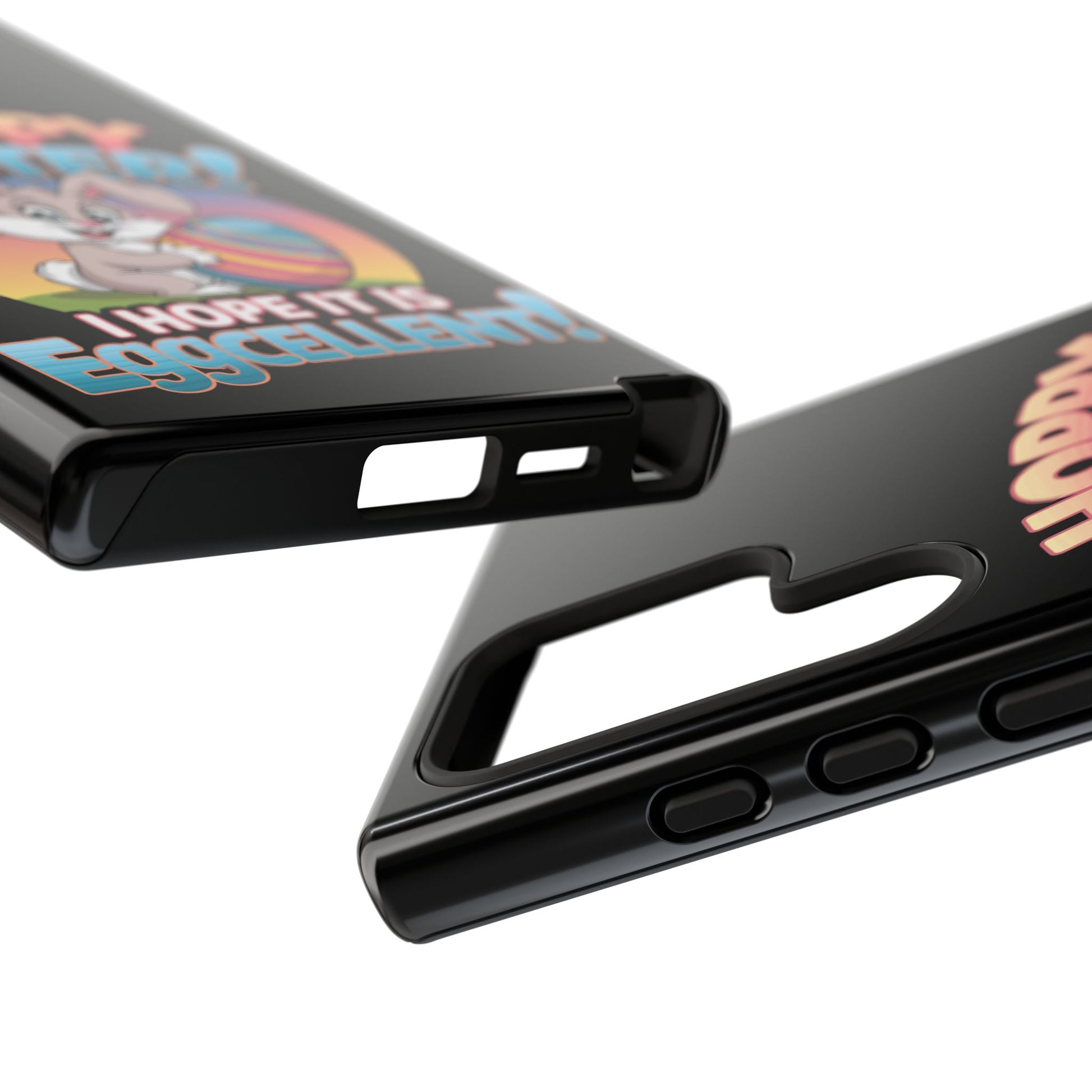 A fun Samsung Phone Case with the Easter Bunny on it that states "Hoppy Easter I Hope it is Eggcellent". This phone case exudes a playful and festive vibe, perfect for Easter celebrations. It is relevant to adults looking for a durable and impact-resistant phone case with a cute Easter design.