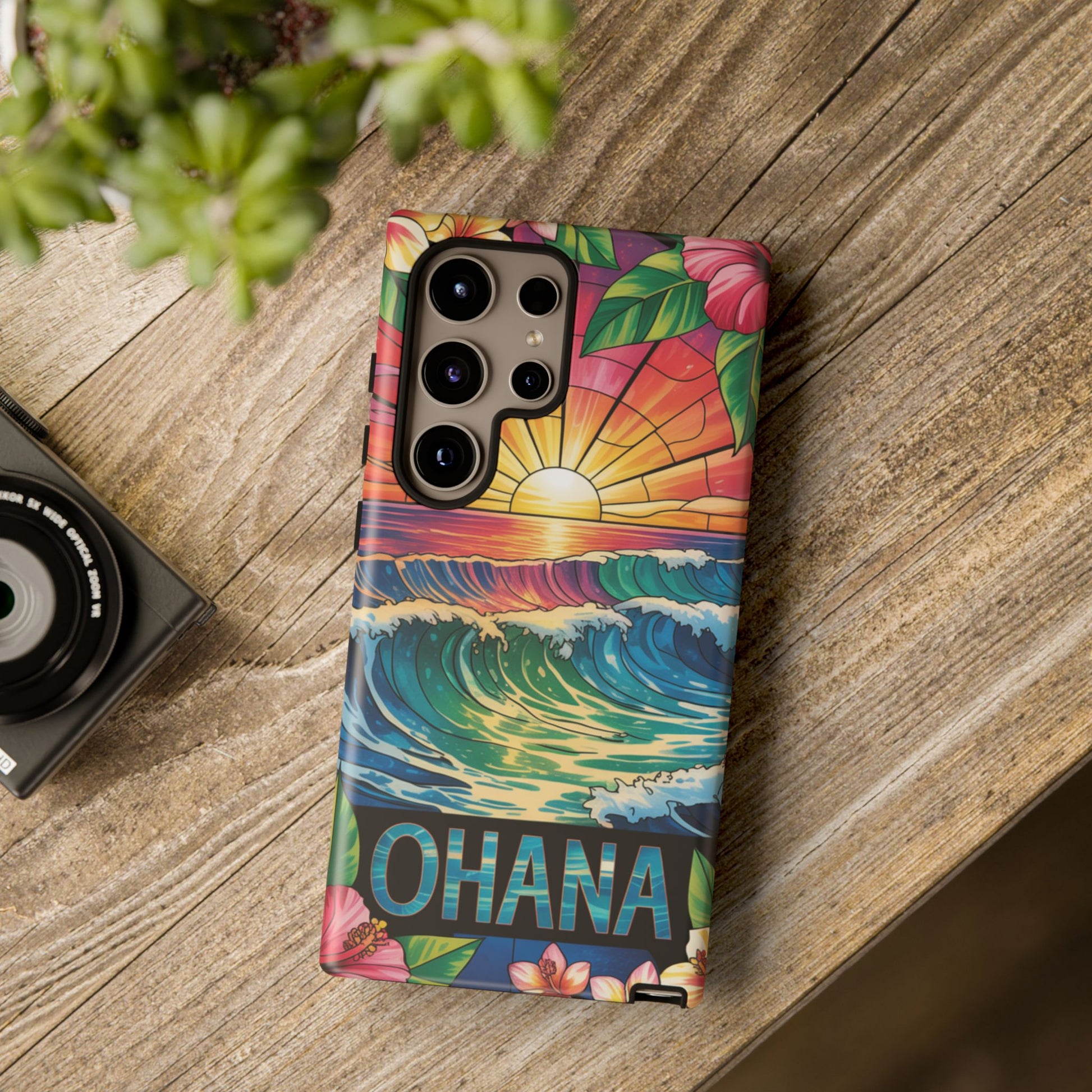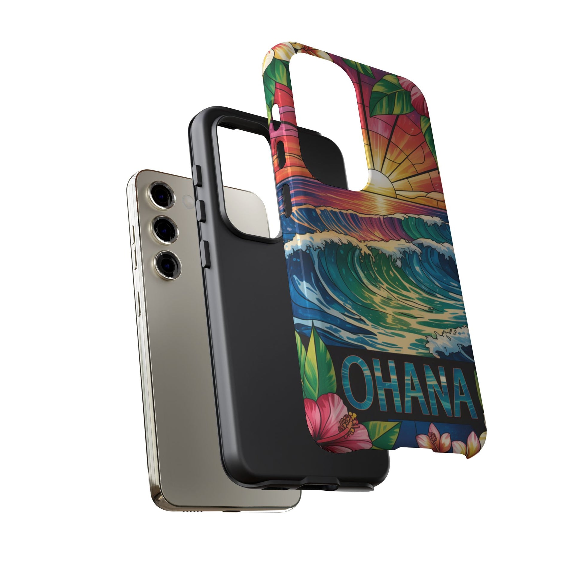 Celebrate the spirit of family and paradise with this vibrant "Ohana" Samsung phone case. Featuring a stunning sunset, ocean waves, and tropical floral art, this design is inspired by the beauty of Hawaii and the meaning of ohana—family that goes beyond blood.