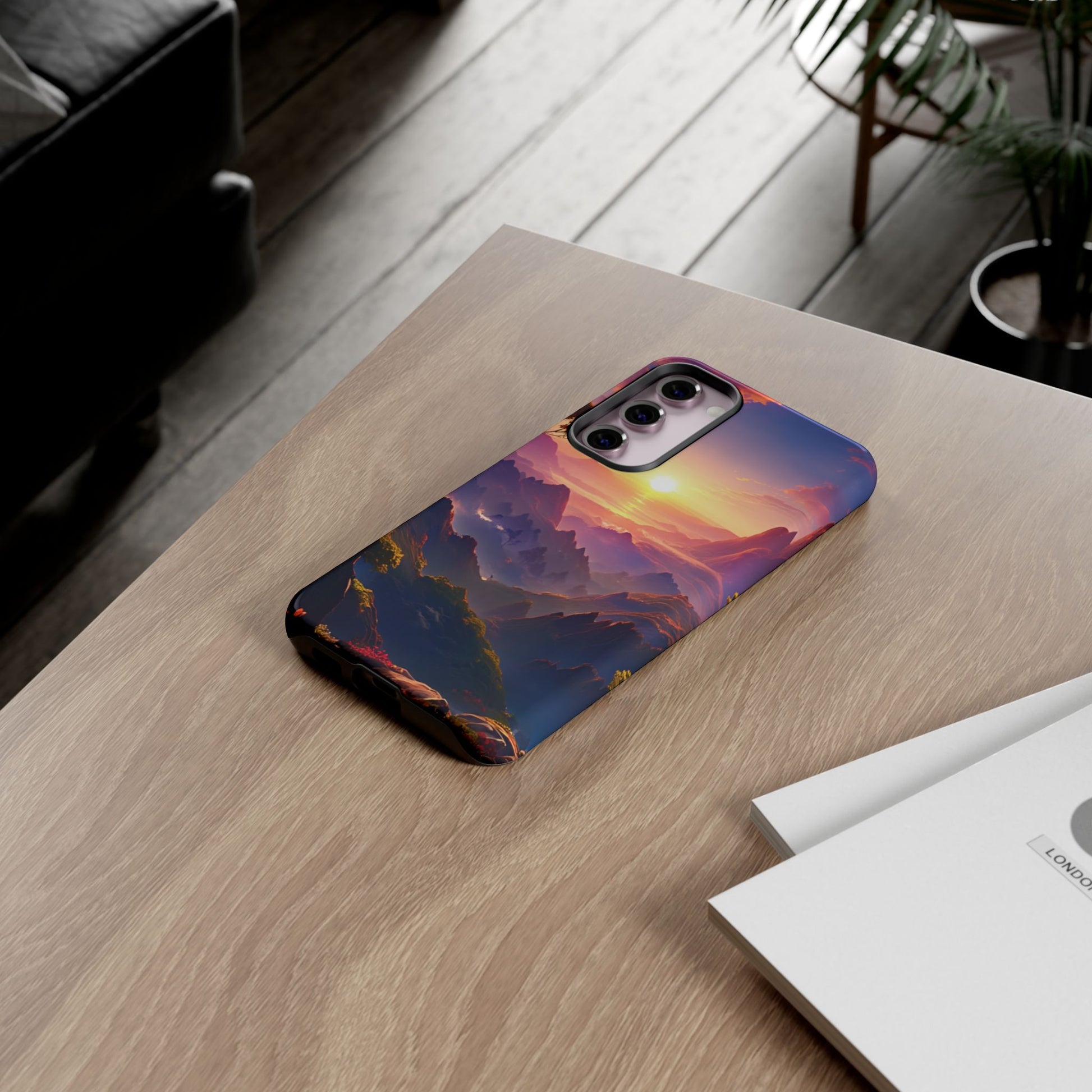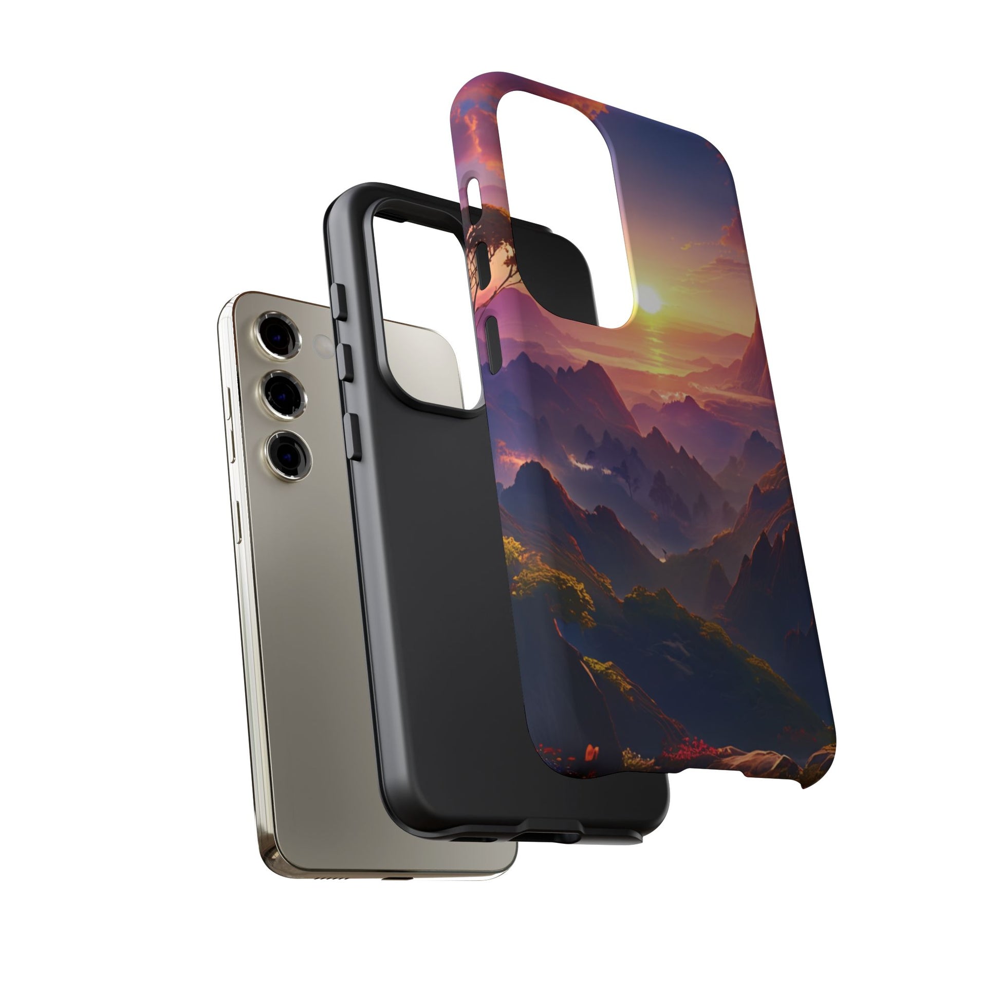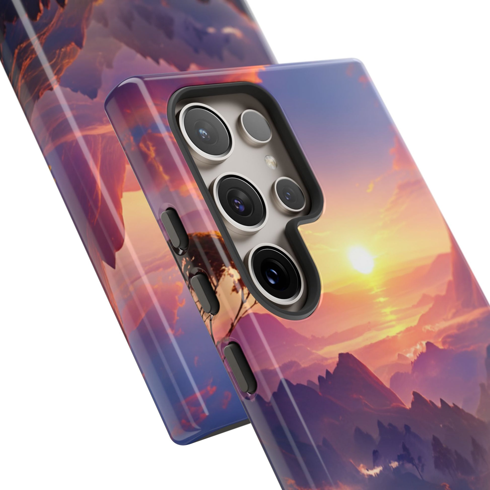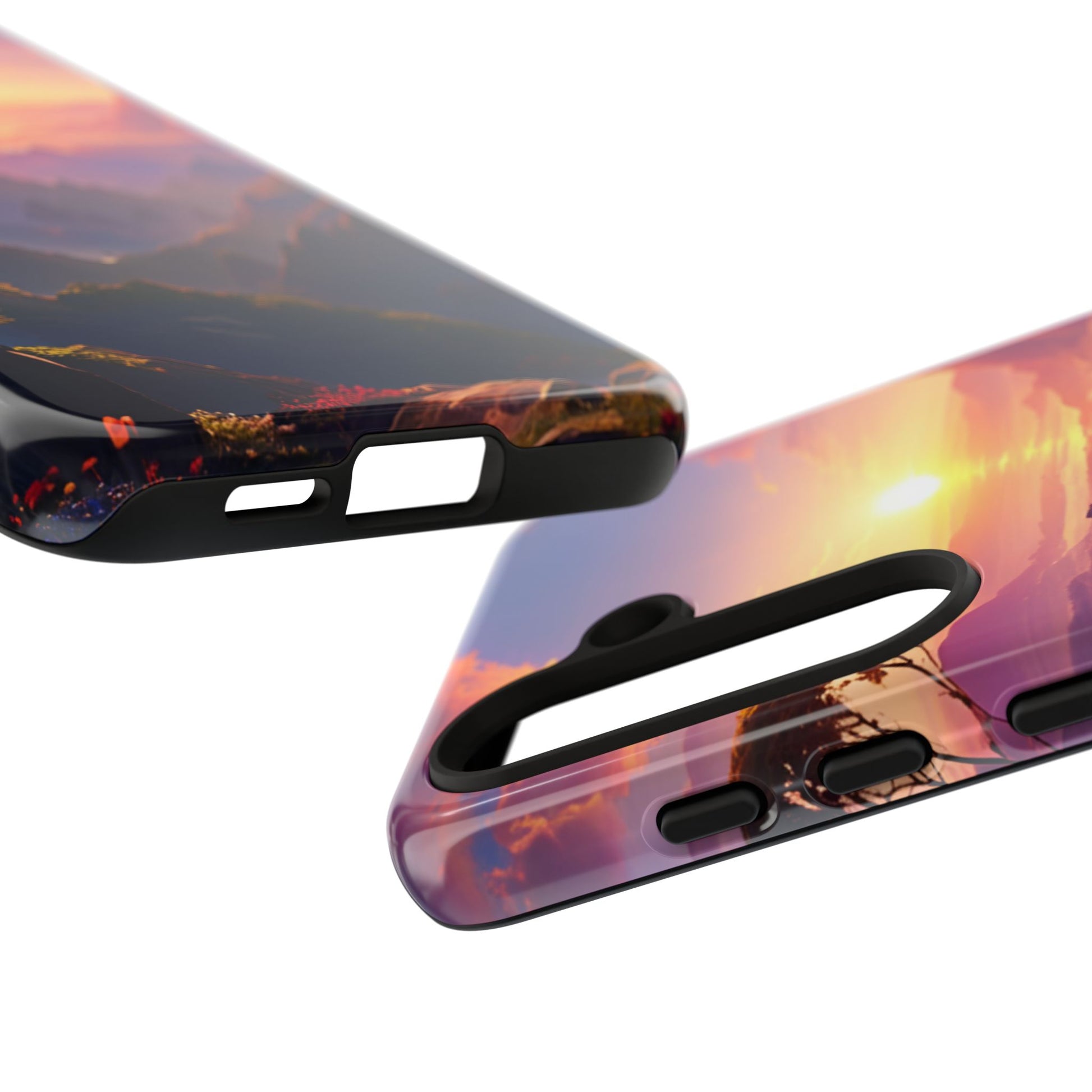 A fun Samsung phone case with a beautiful illustration of a landscape at sunset. This phone case gives off a vibrant and artistic vibe, perfect for someone who enjoys nature-inspired designs. Ideal for adults looking to protect their Samsung phone in style, especially great for nature lovers and those who appreciate sunset views. Perfect for gift giving on birthdays, holidays, or as a thoughtful gesture.