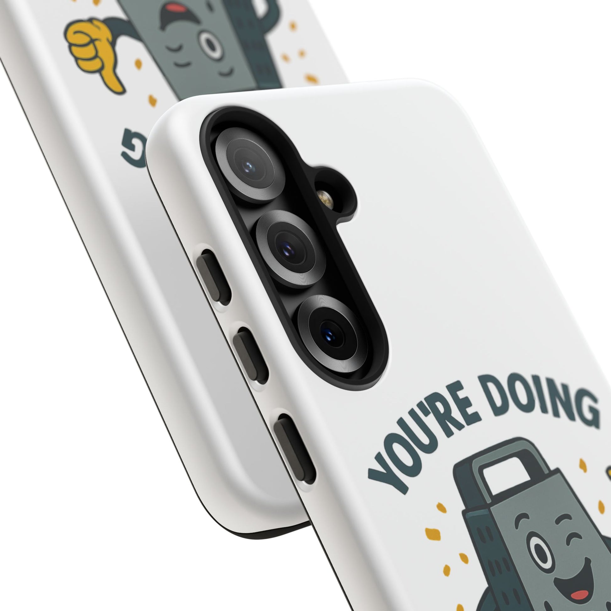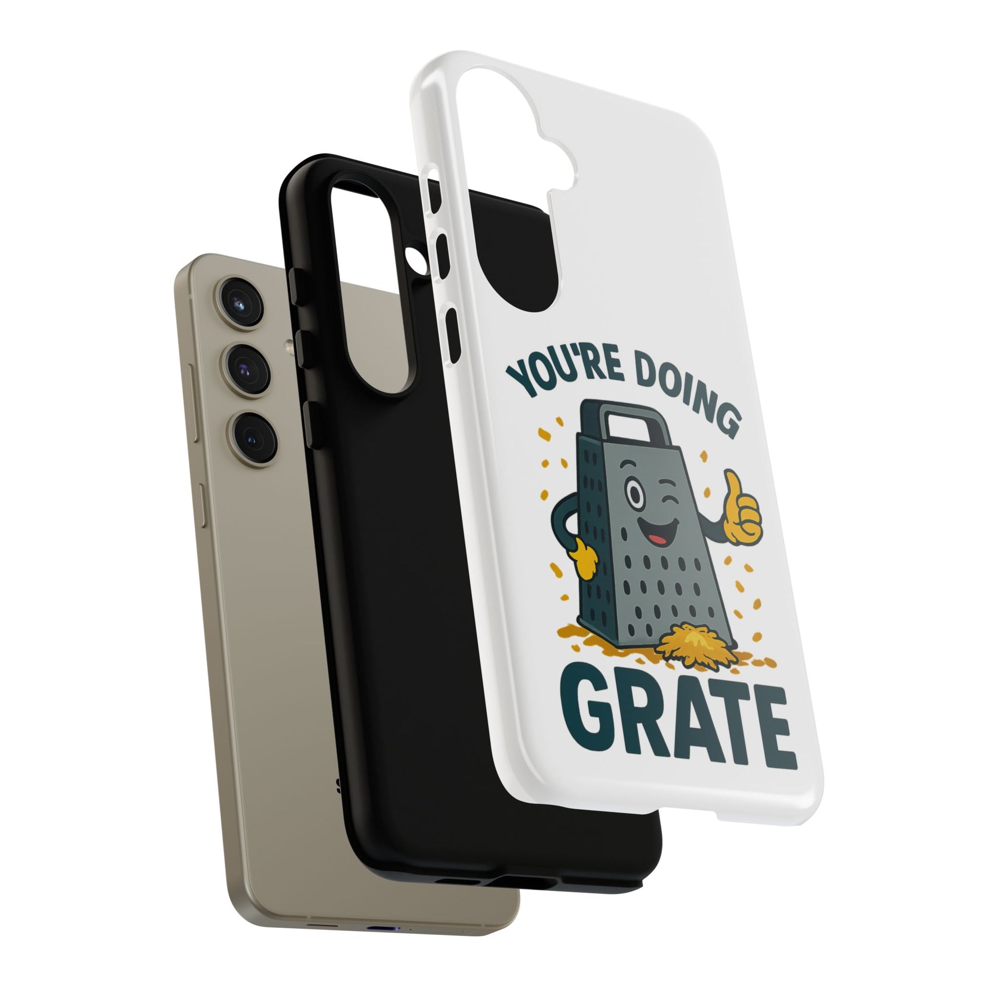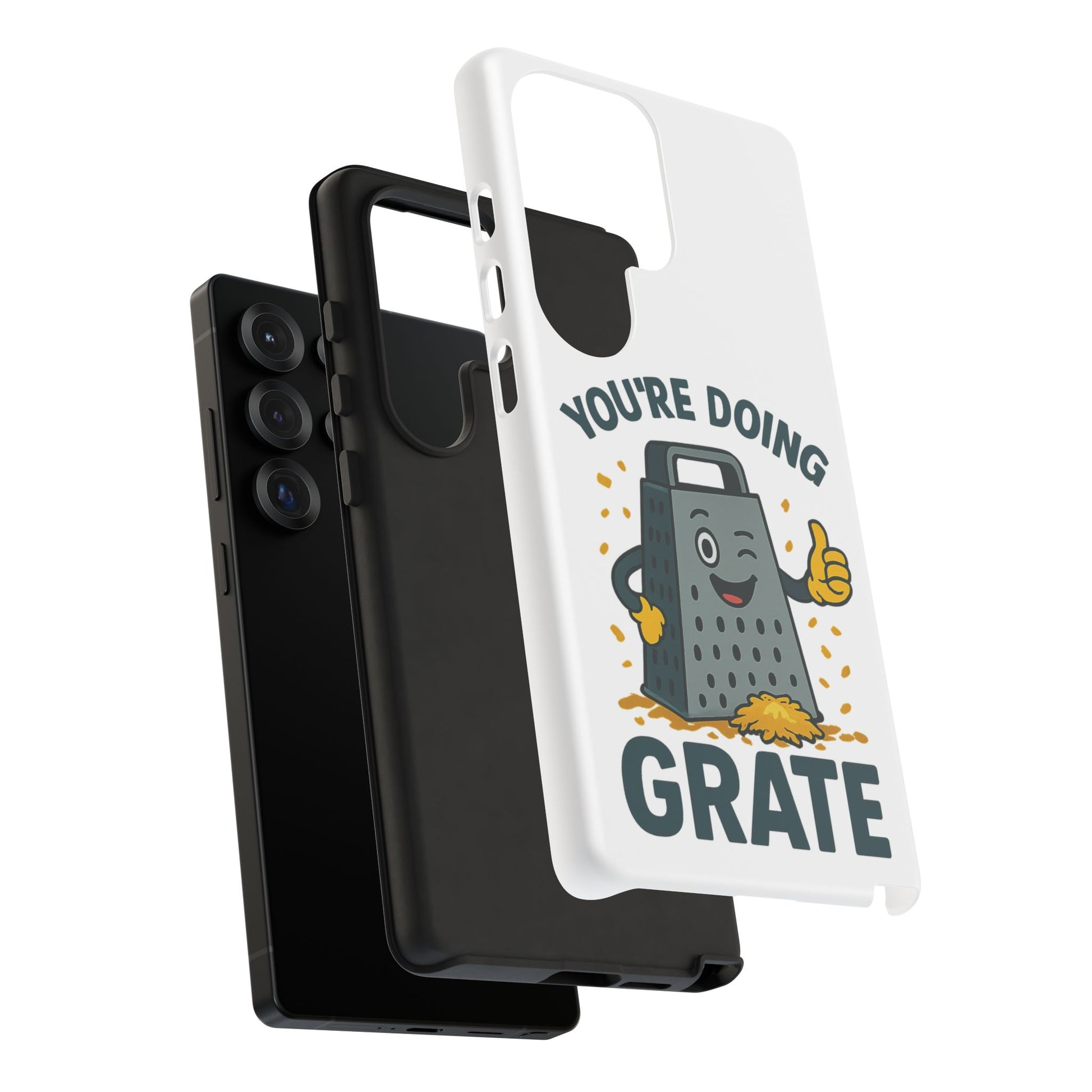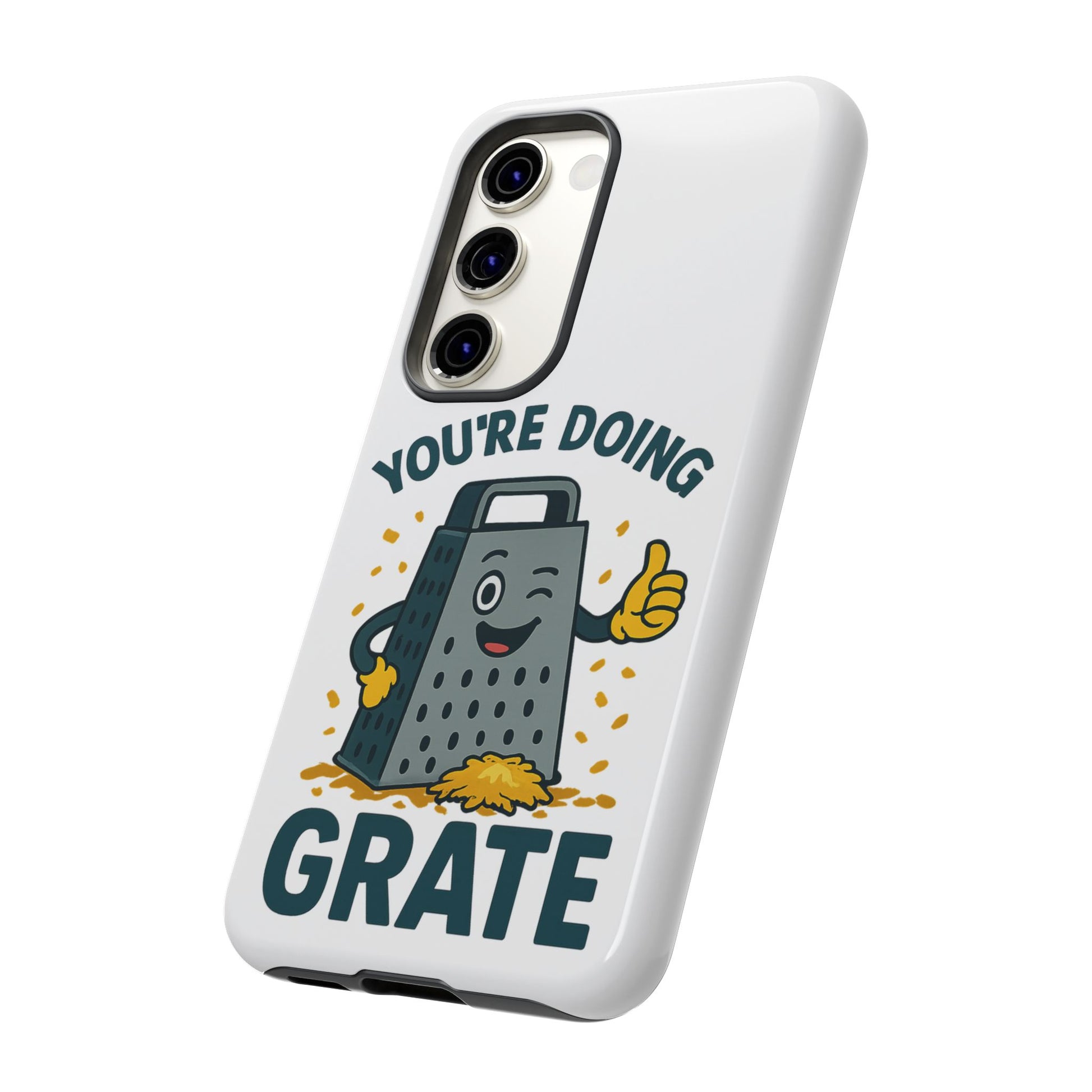 A fun Samsung phone case with a cheese grater design that states "You're Doing Grate". Perfect for those who love quirky accessories and want to add a touch of humor to their phone. Ideal for adults looking for a unique and durable phone case. Great for gifting on birthdays, holidays, or just as a fun surprise.