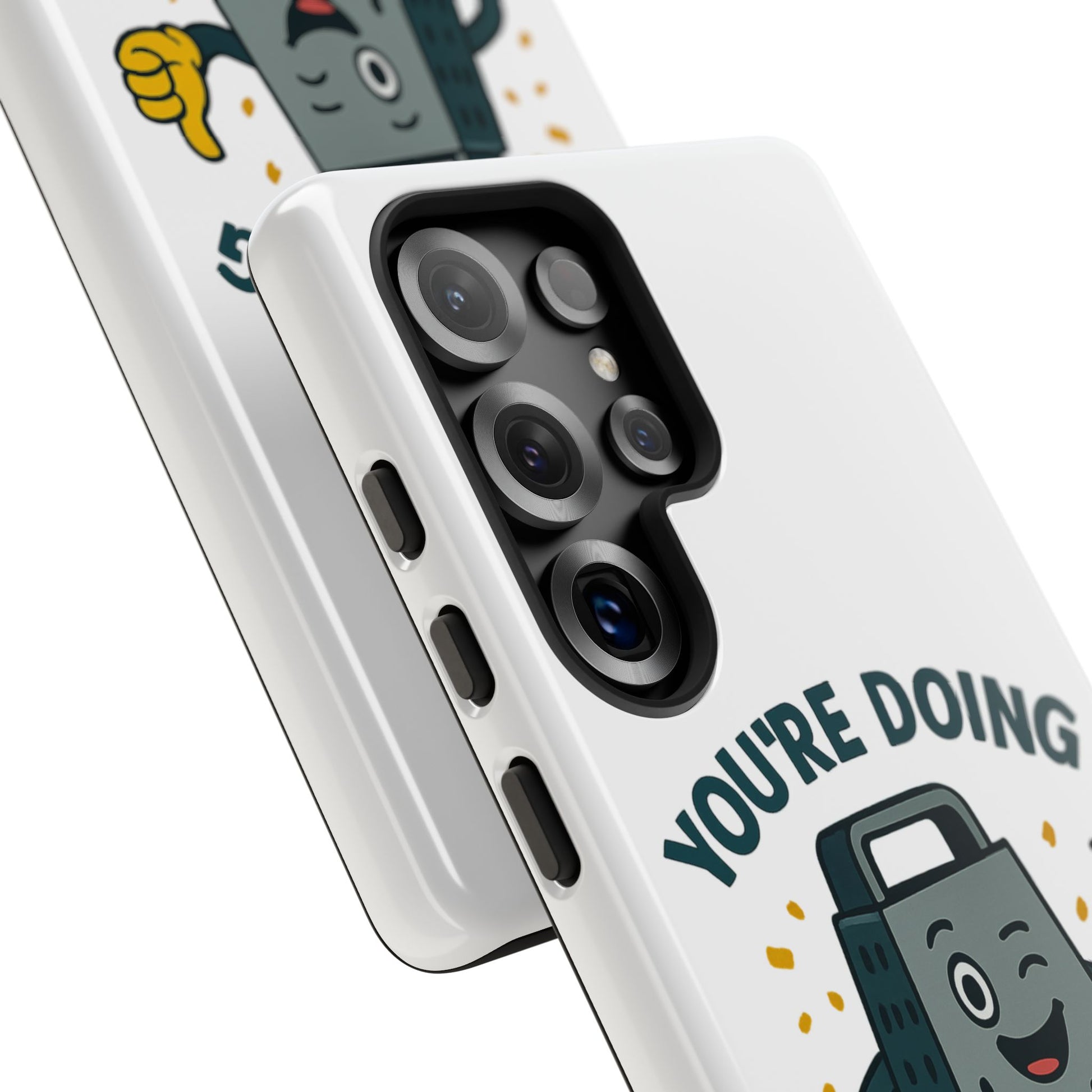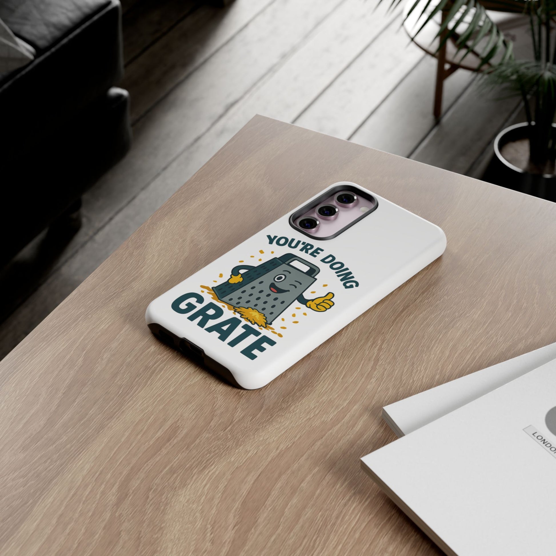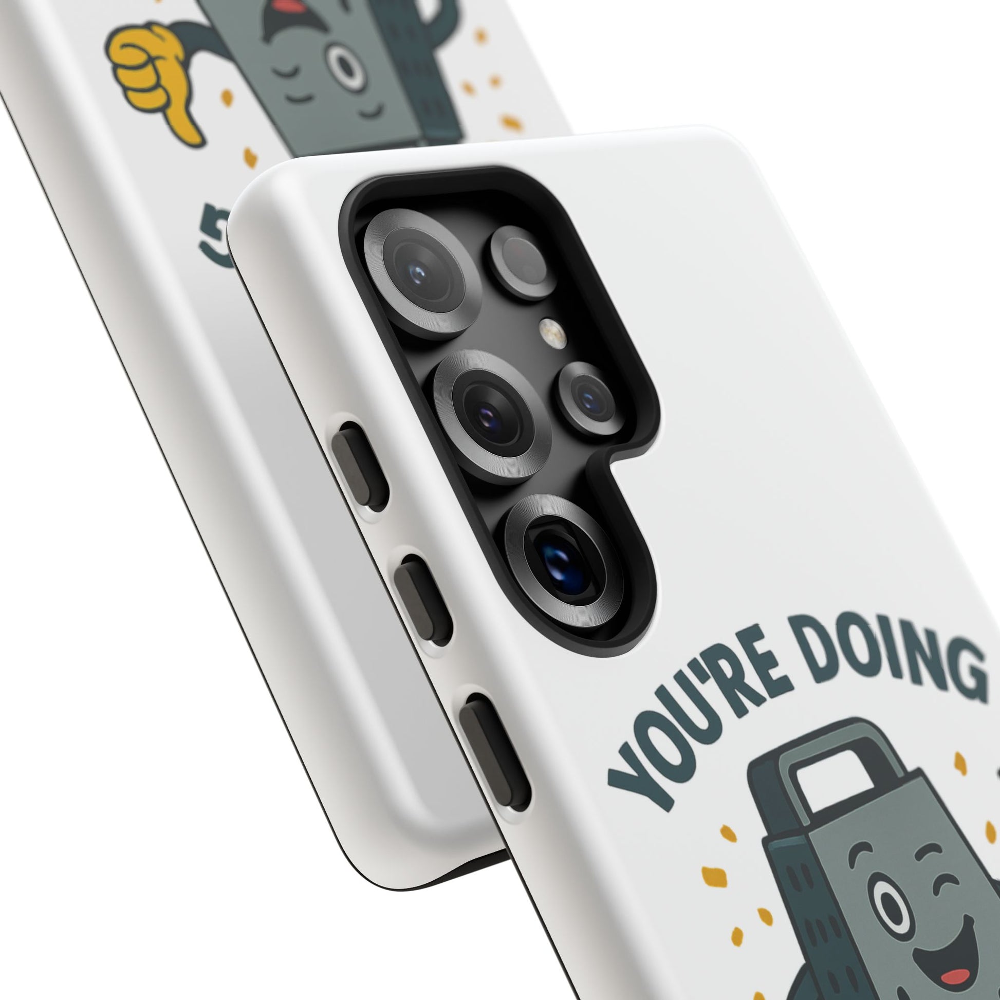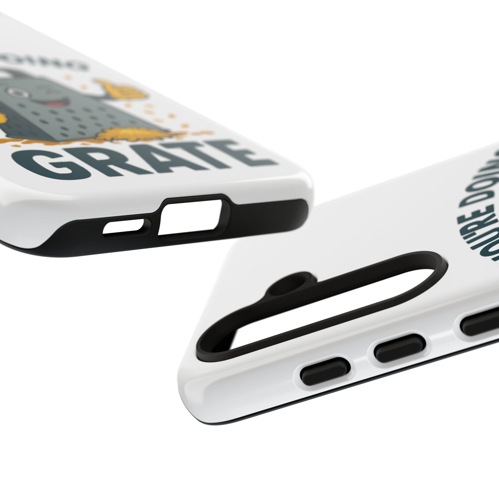 A fun Samsung phone case with a cheese grater design that states "You're Doing Grate". Perfect for those who love quirky accessories and want to add a touch of humor to their phone. Ideal for adults looking for a unique and durable phone case. Great for gifting on birthdays, holidays, or just as a fun surprise.
