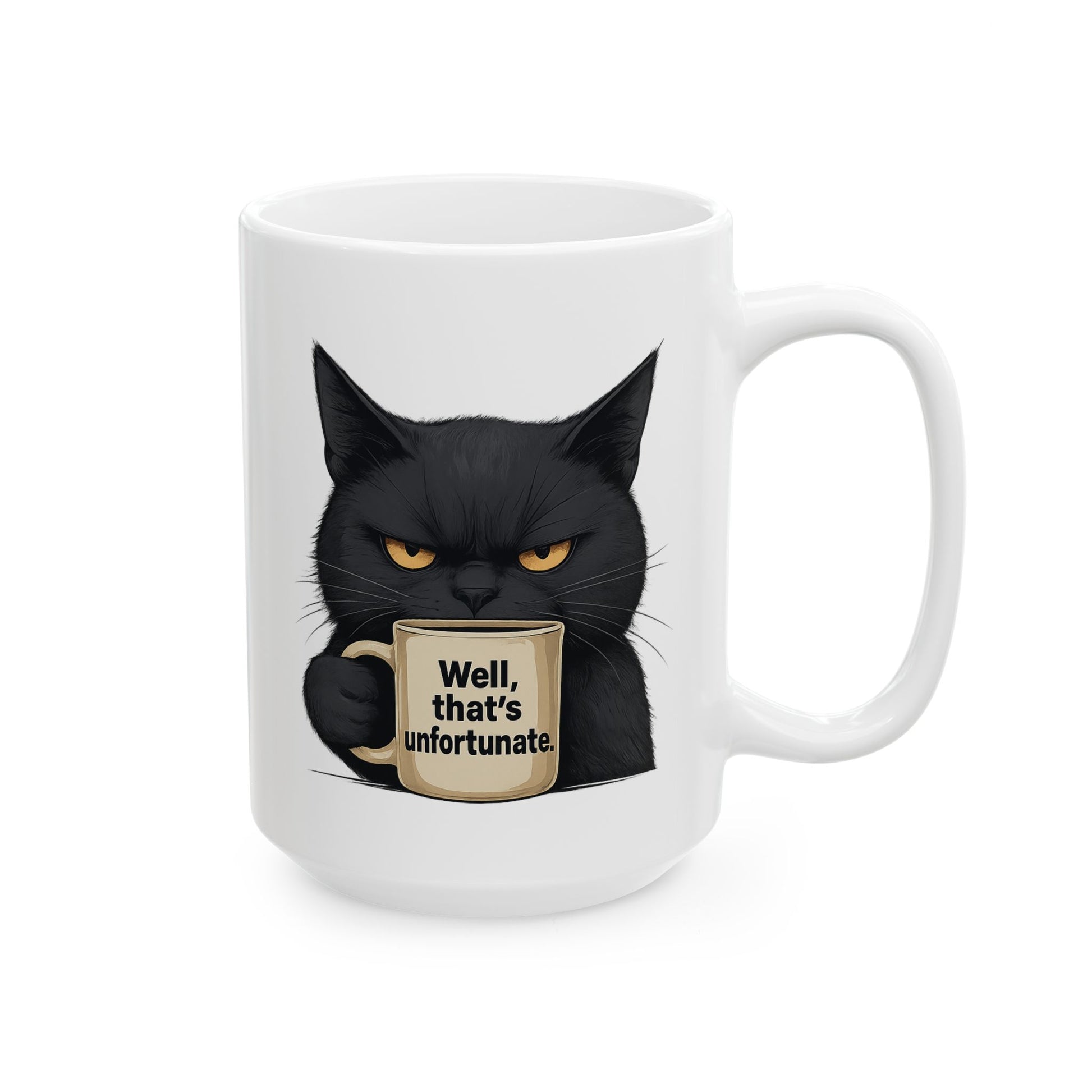 Sarcastic Black Cat Coffee Mug 11 oz or 15oz - “Well, thats unfortunate.” Funny Grumpy Cat Meme Gift, Office Humor, Tea Cup, Sarcasm Lover