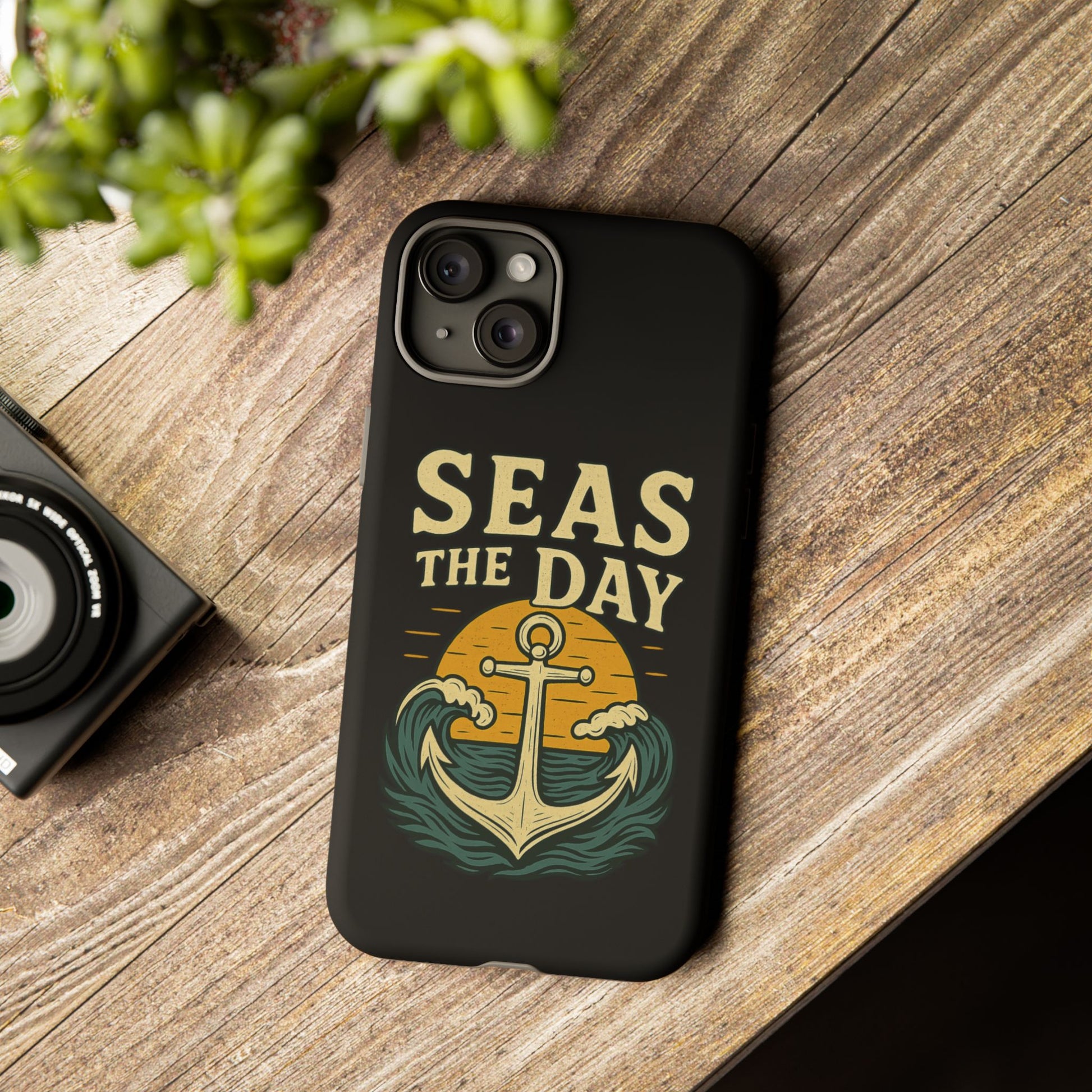 Protect your phone in style with this “Seas the Day” iPhone case, a perfect blend of adventure, pun-filled motivation, and nautical charm. Featuring a bold anchor surrounded by ocean waves and a golden sun, this phone case is ideal for sailors, beachgoers, and dream chasers alike.