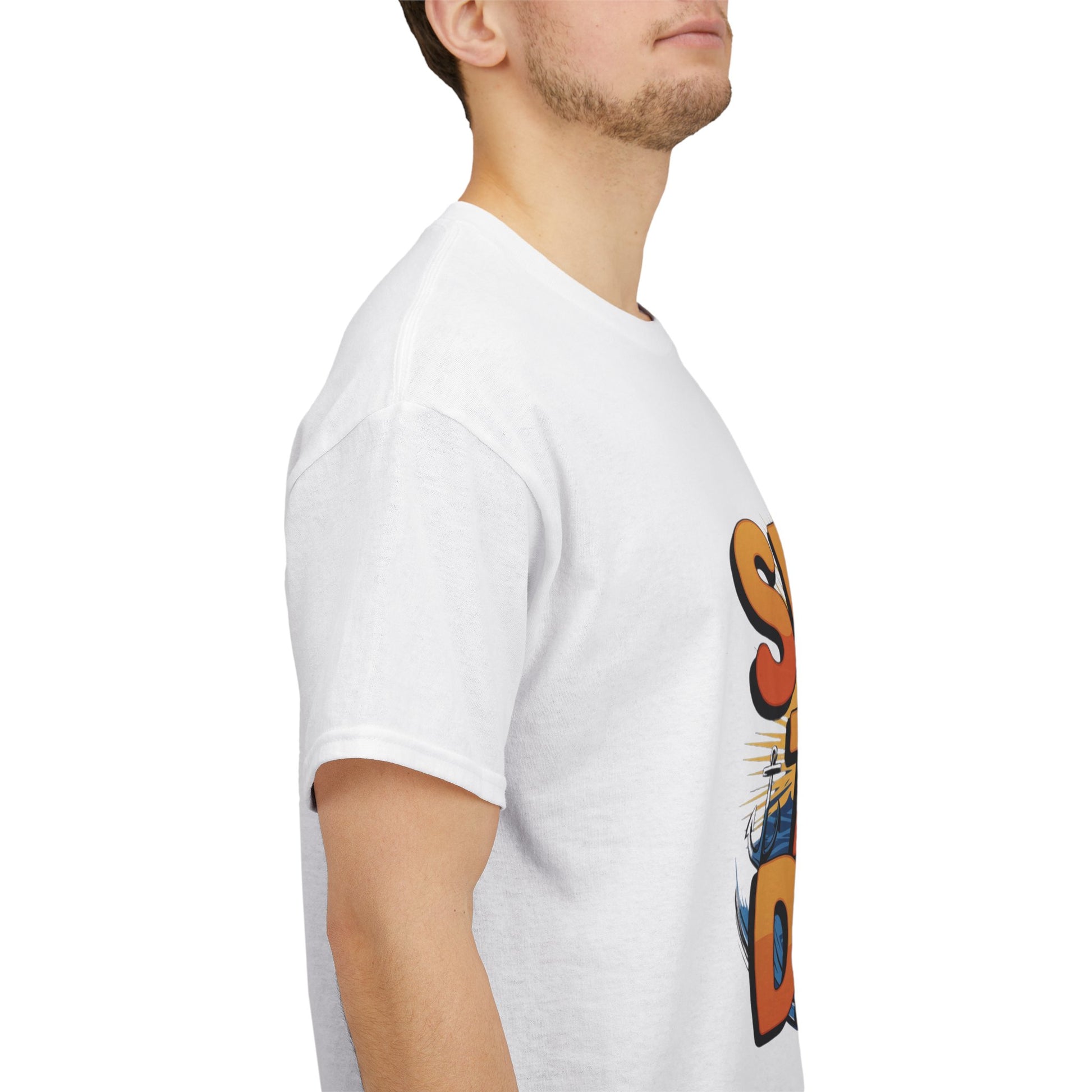 Vibrant Ocean Graphic – Bold orange typography over ocean wave & boat art—stands out and brings coastal charm.