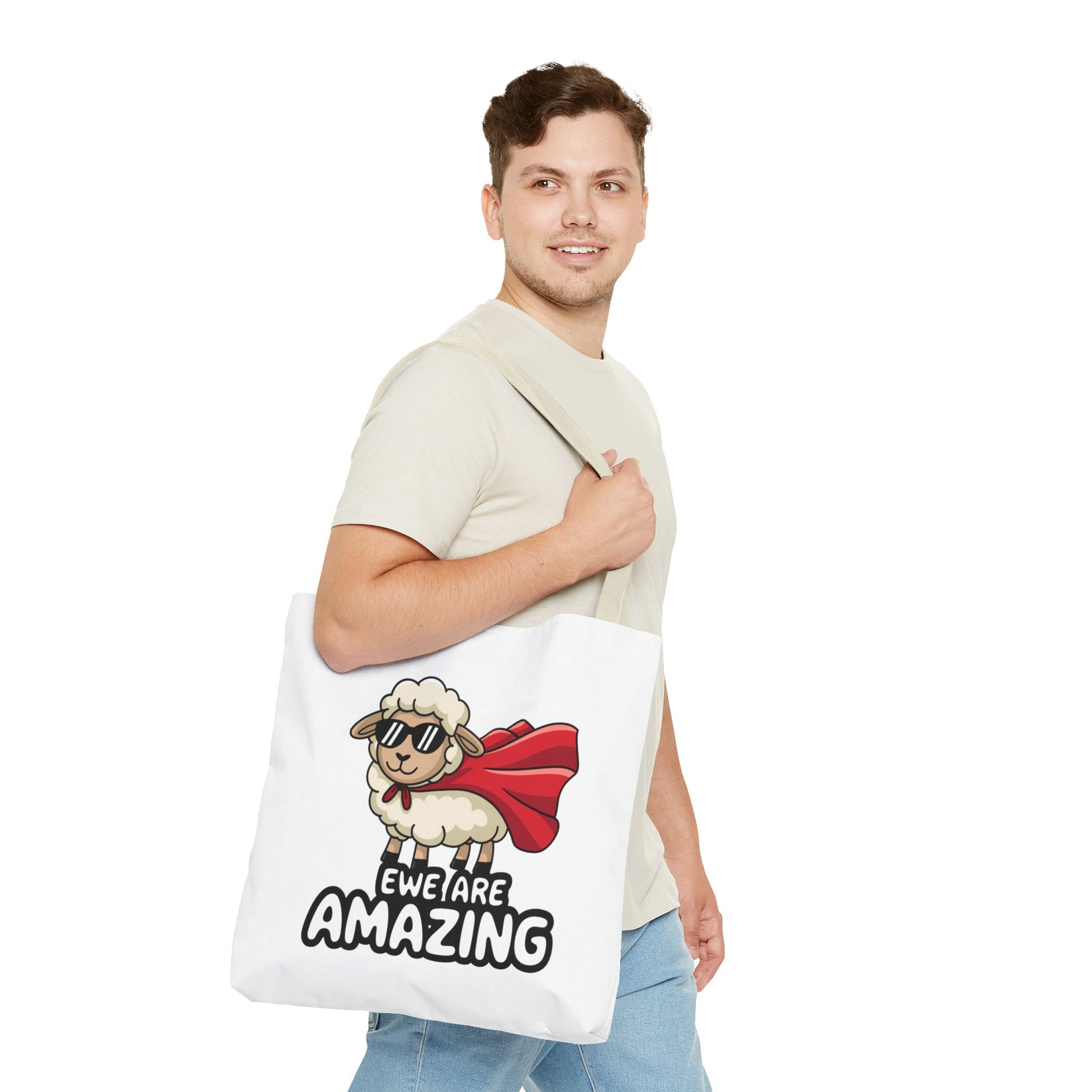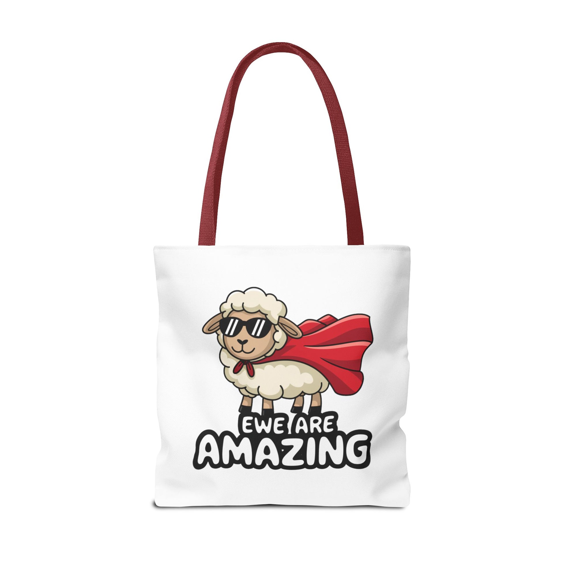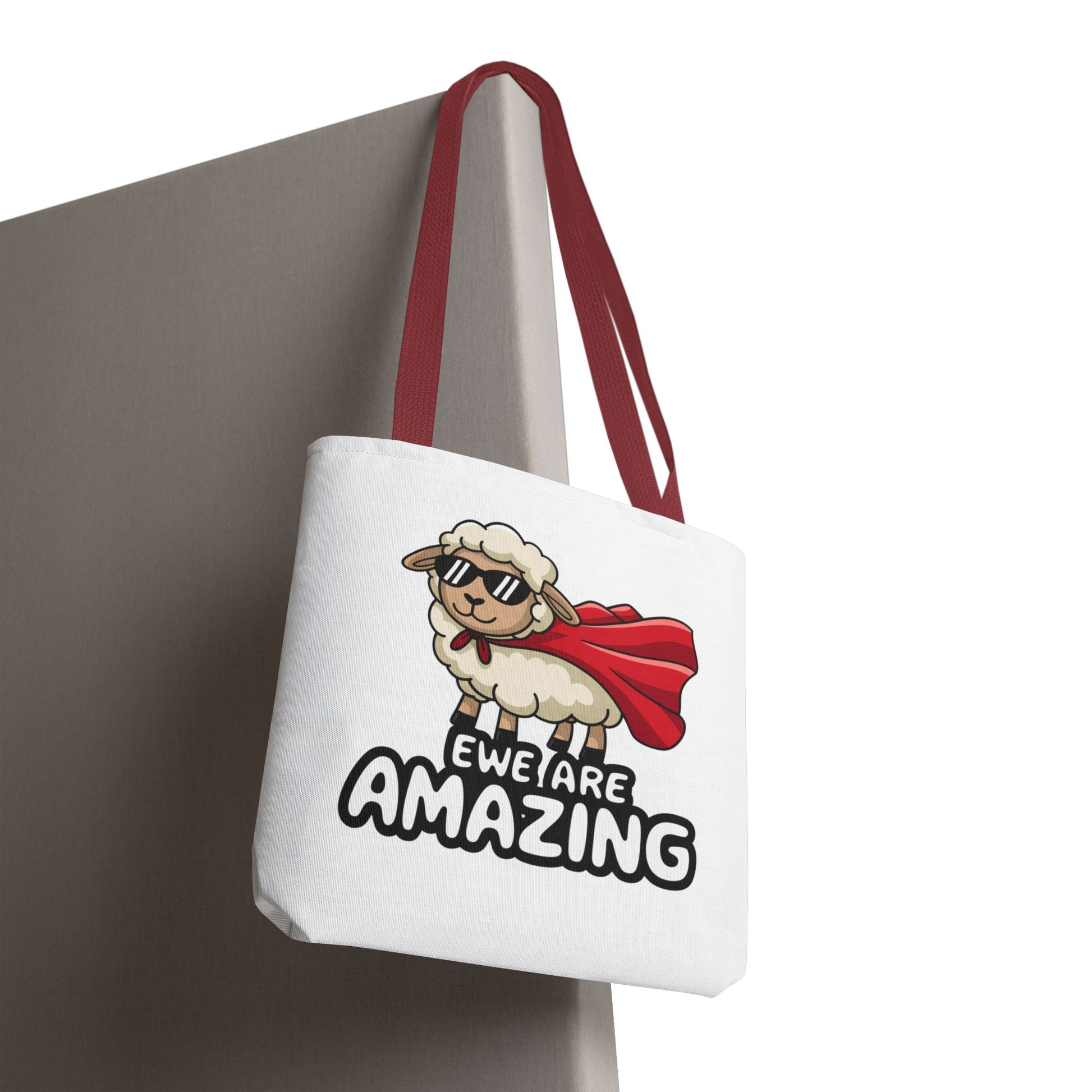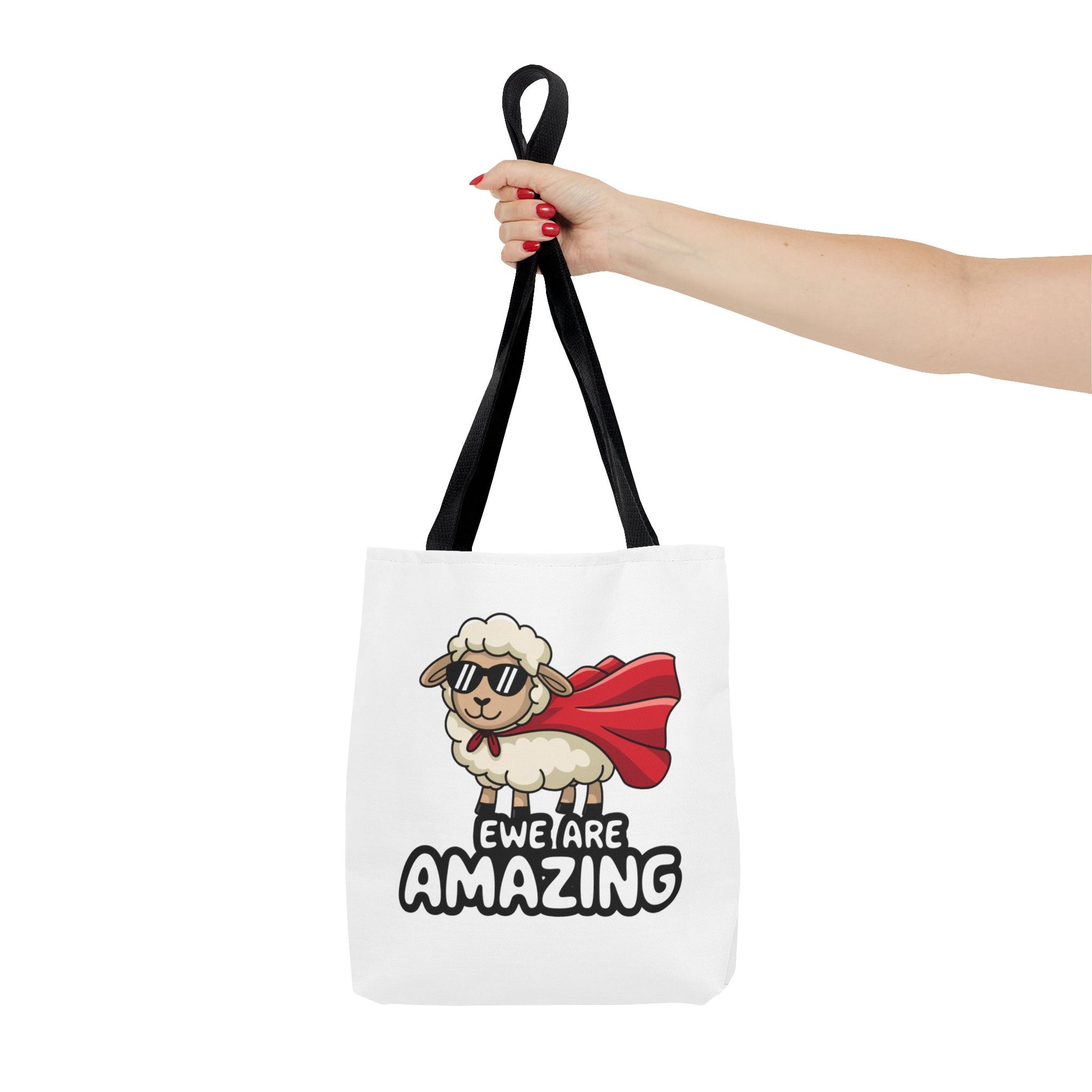 A fun tote bag with a sheep design that states "Ewe Are Amazing", perfect for everyday use. This tote bag is made of 100% polyester, making it extremely durable and quick-drying. It features 5 color handle options and reinforced stitching on handles for added strength. The boxed corners create extra room in the tote bag, making it practical and spacious. Ideal for animal lovers and those who appreciate cute and motivational designs. Perfect for everyday use or as a gift for birthdays, holidays, or special occasions.