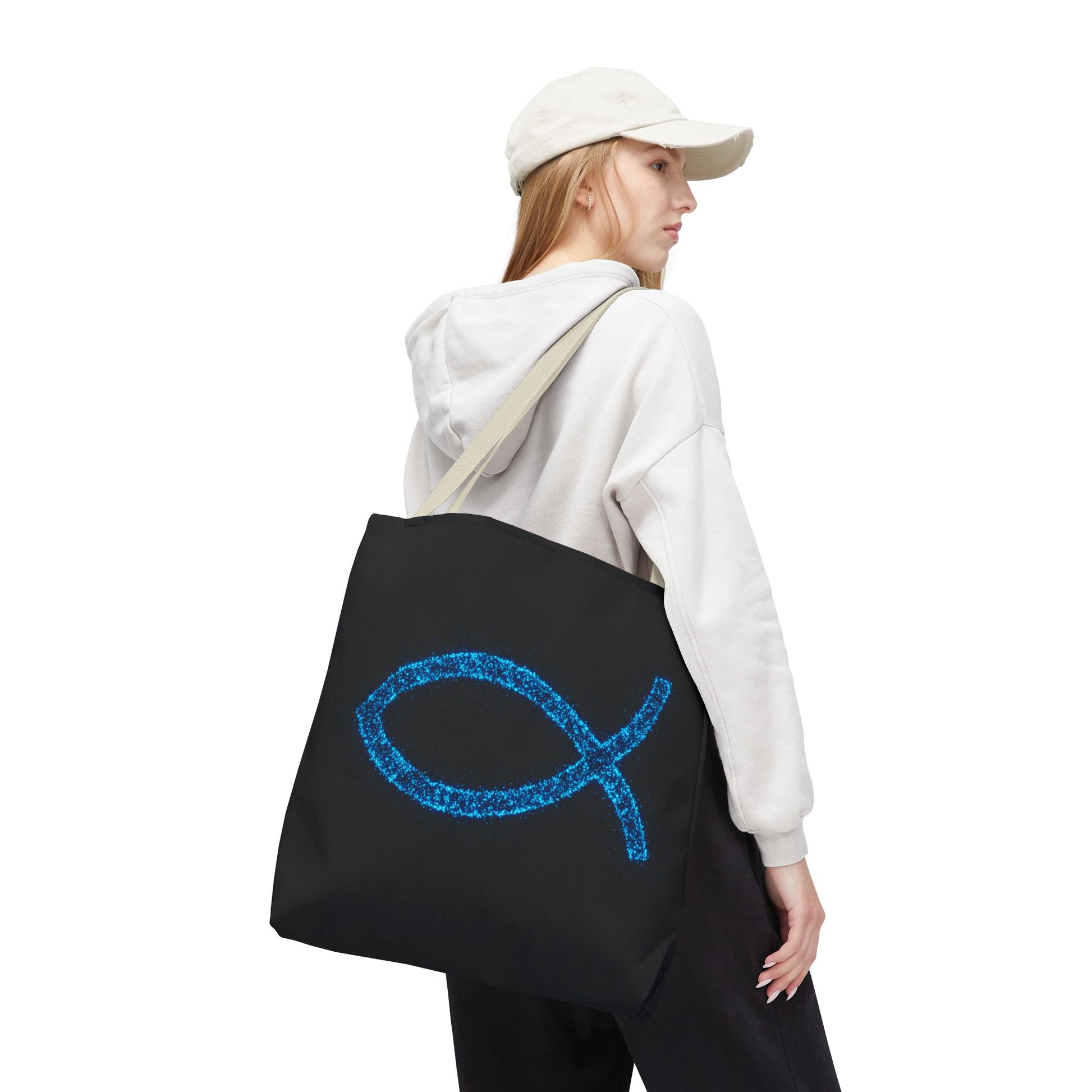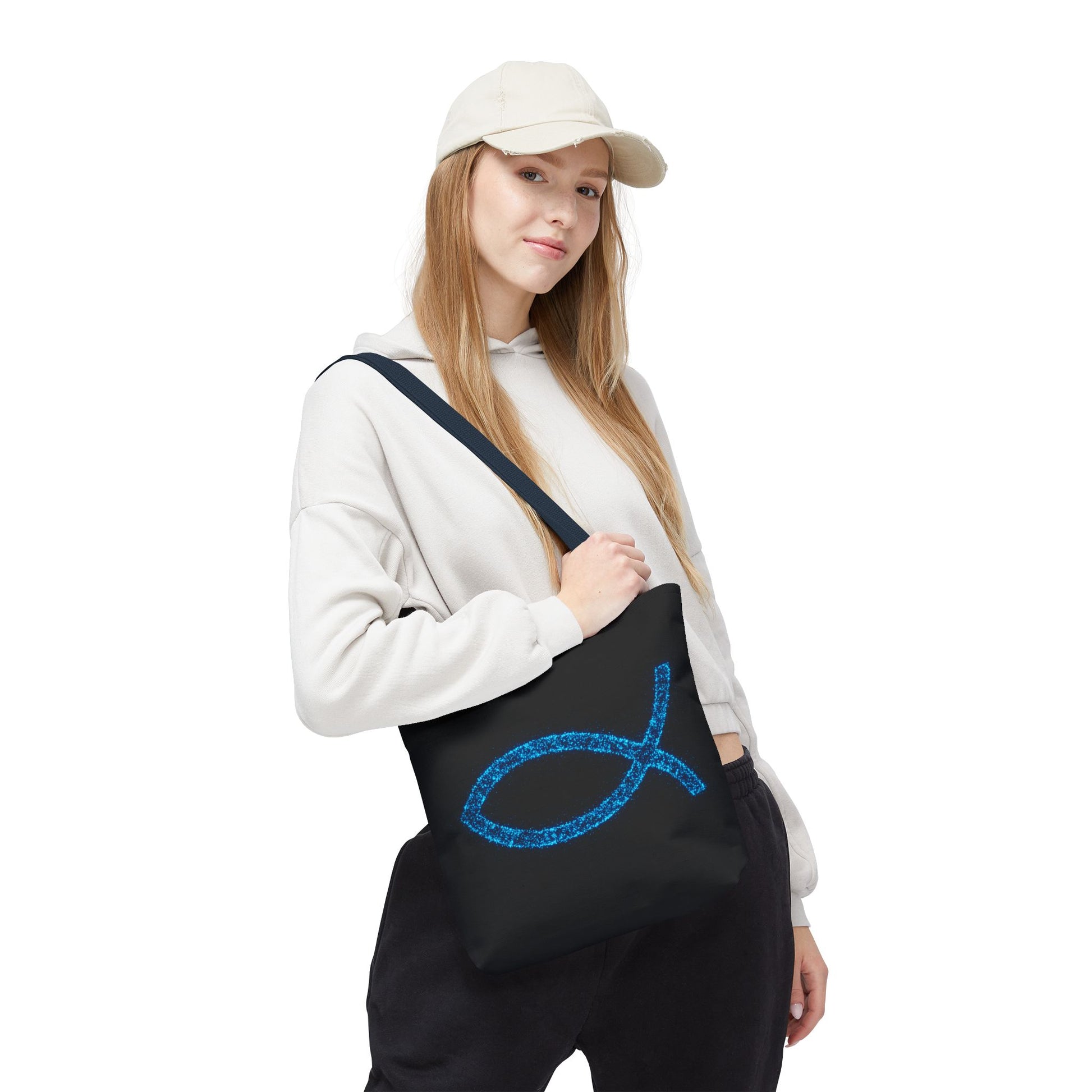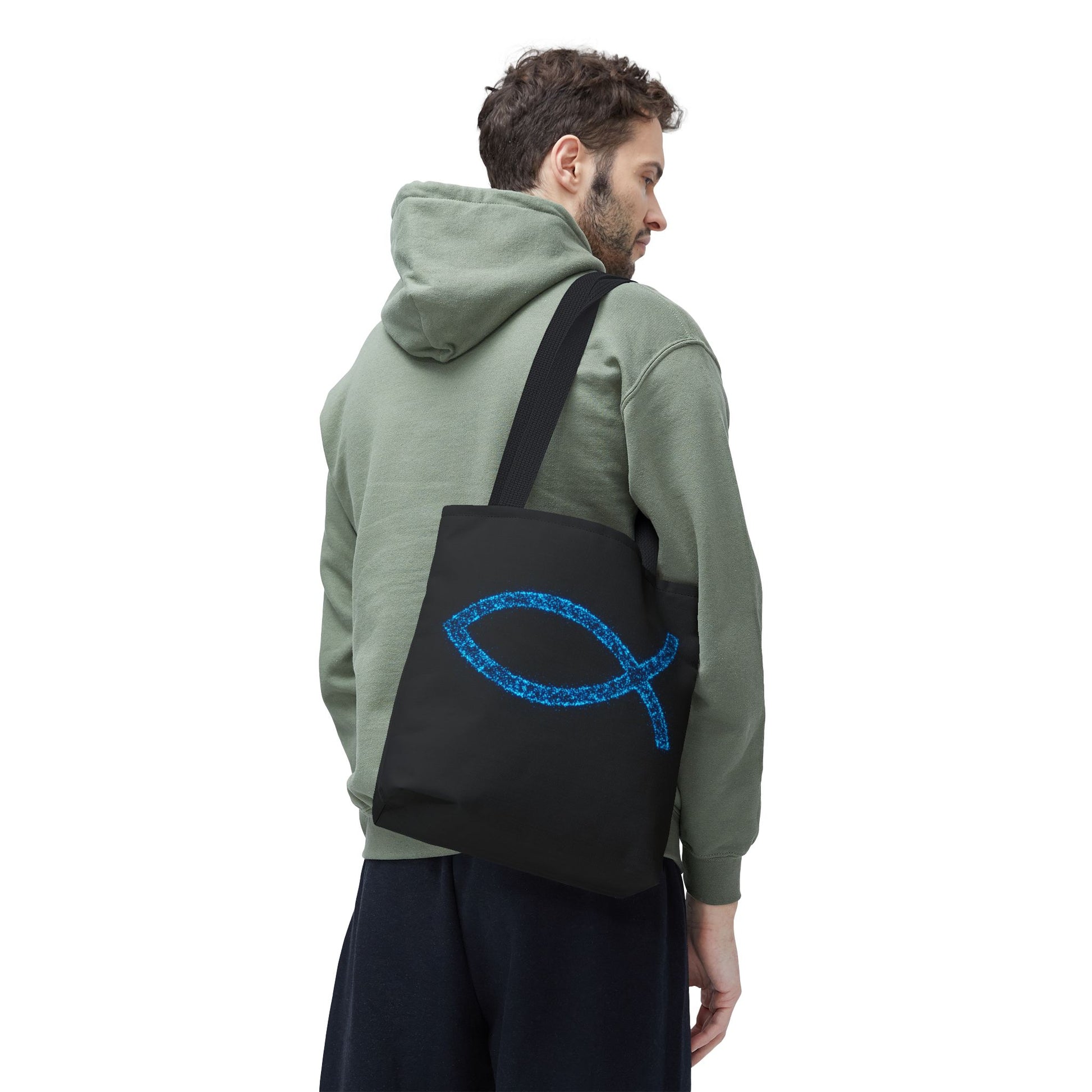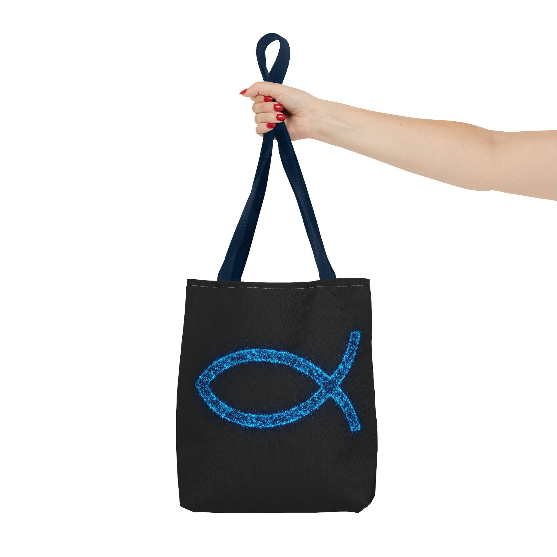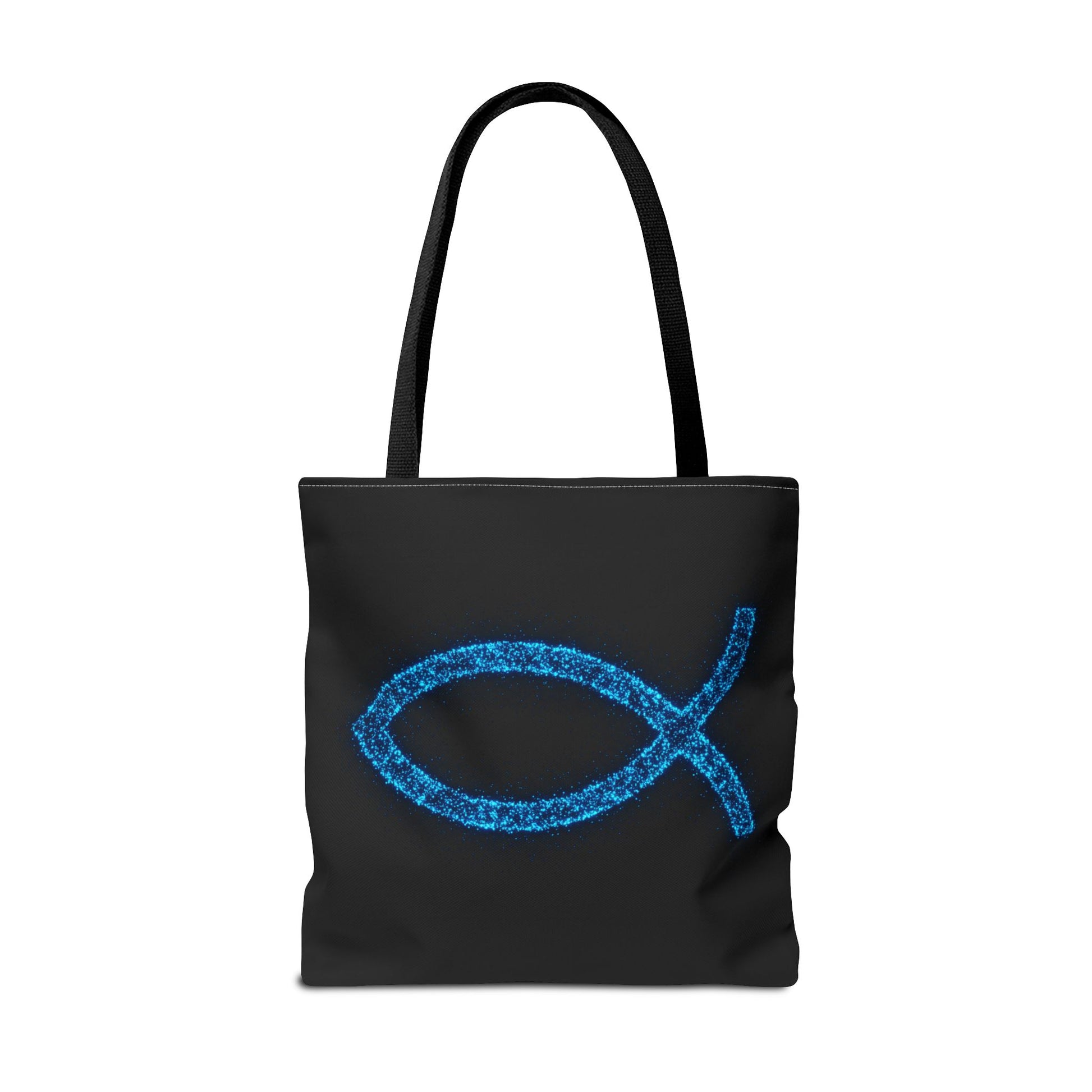 Carry your faith and essentials in style with this eye-catching tote bag! Featuring a shimmering, blue fish symbol against a sleek black background, this tote is a subtle yet powerful statement of belief. Perfect for everyday use, whether you're heading to church, the grocery store, or a casual outing. Made with durable materials, this tote is designed to be both fashionable and functional, helping you share your inspirational vibes wherever you go.