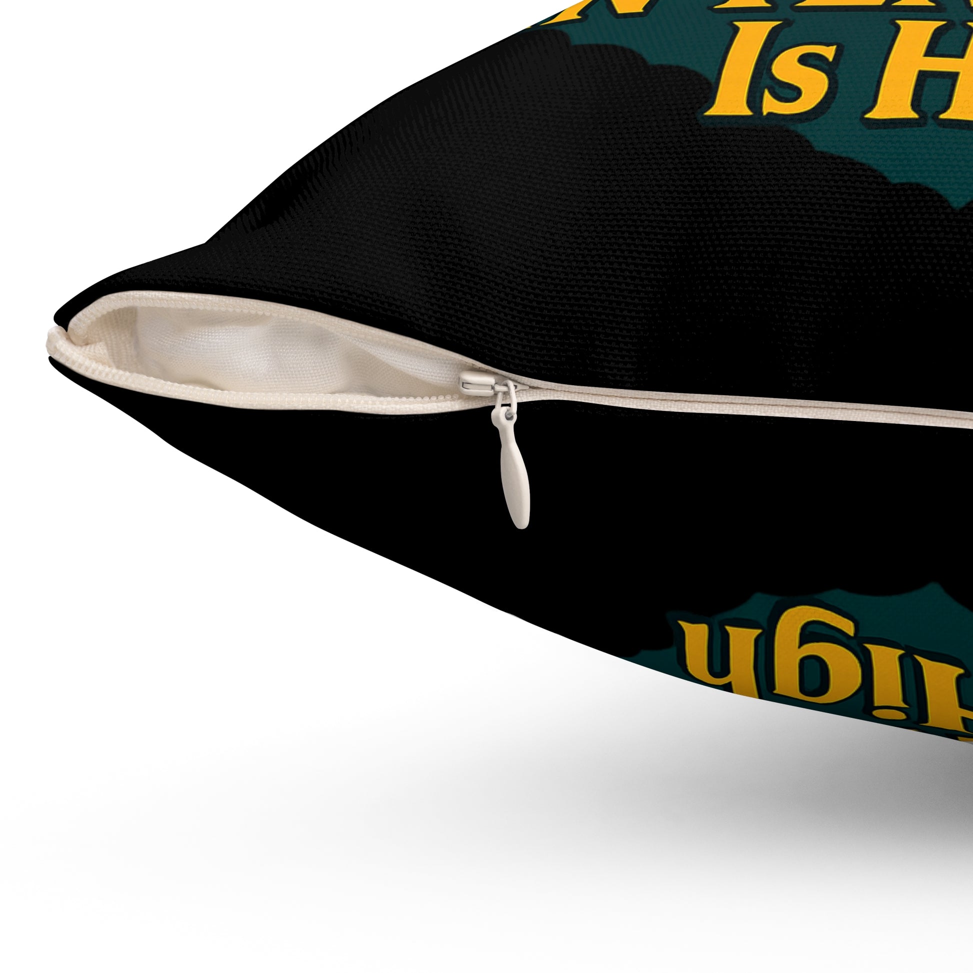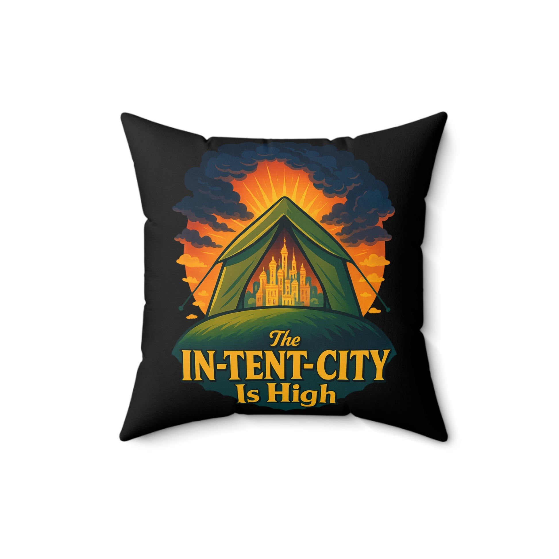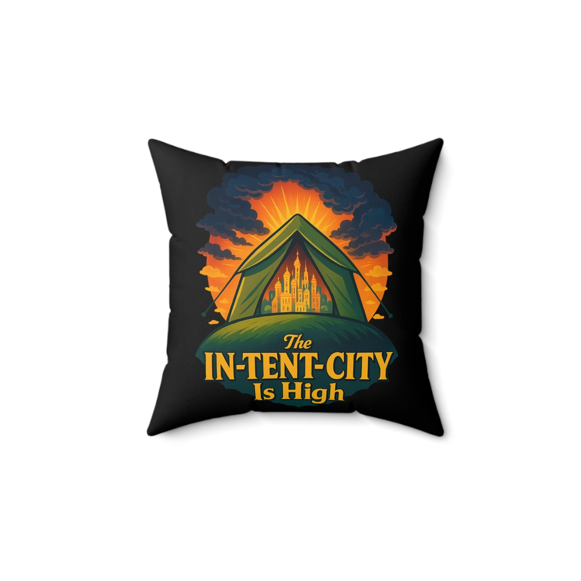 A fun pillow featuring a city in a tent on top of a hill with the statement 'The In-Tent-City is High'. This quirky design adds a playful touch to any living space and is perfect for those who enjoy unique decor. Ideal for those who love urban motifs and whimsical themes, this pillow is a great addition to a modern home or a student dorm room. Perfect for urban dwellers, college students, and fans of cityscapes.