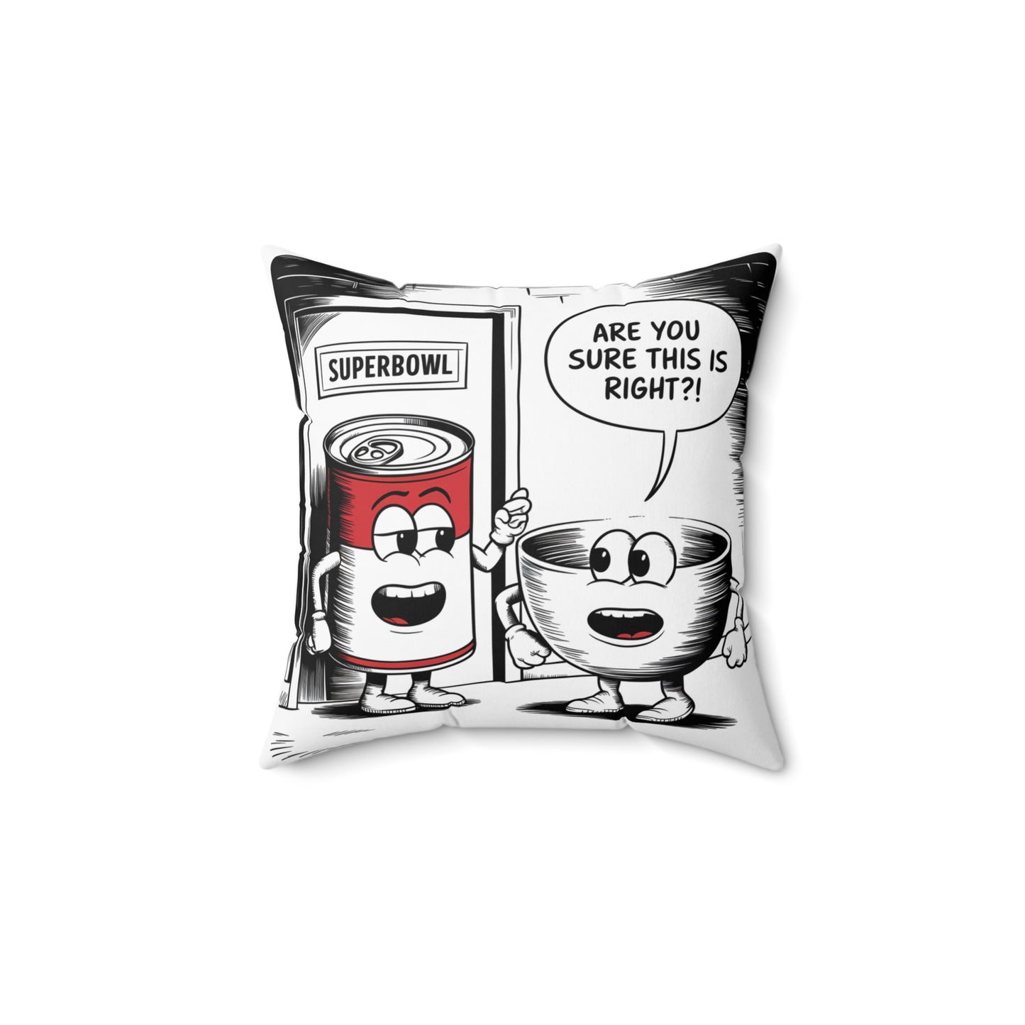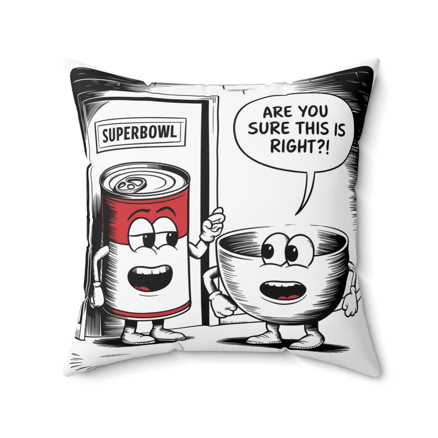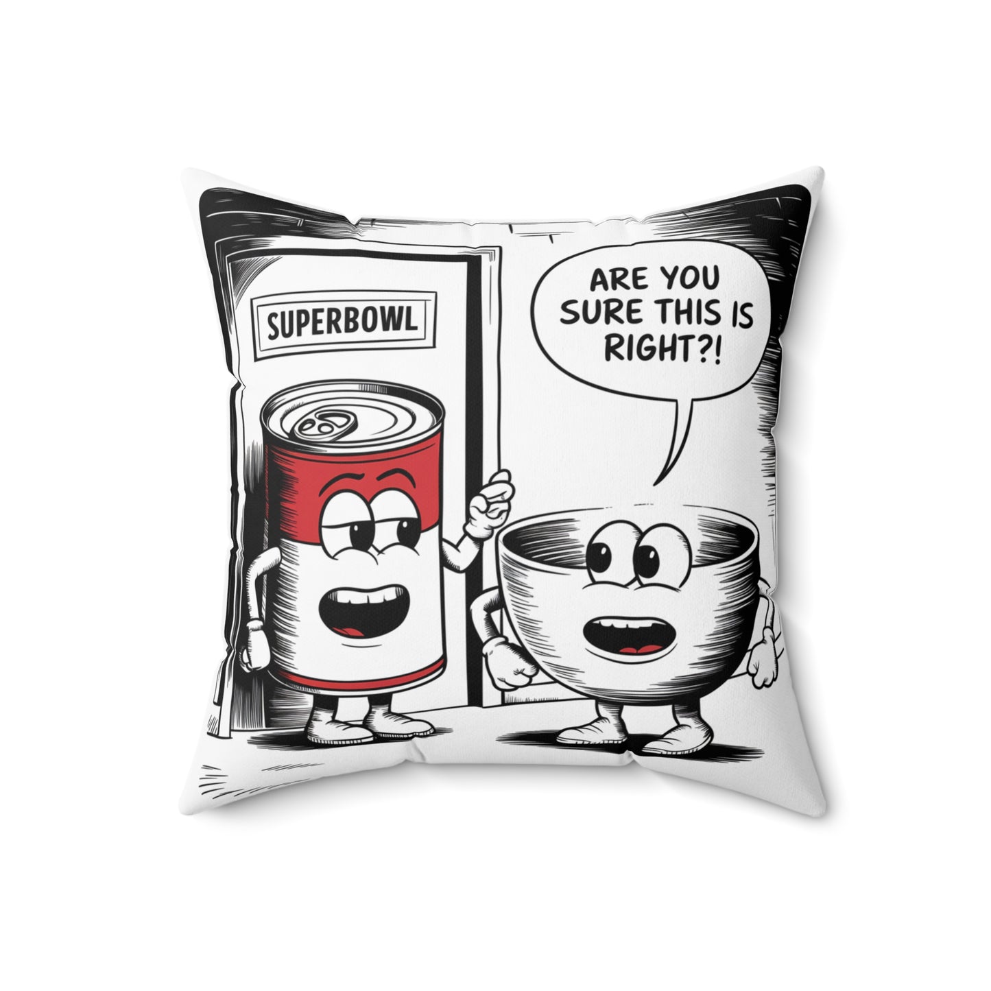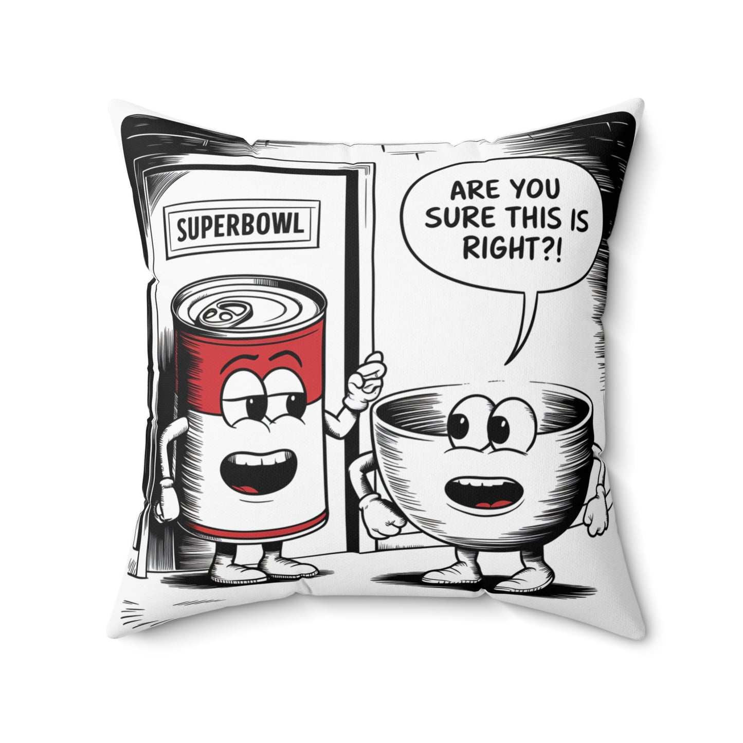 This square pillow features a fun comic design of a bowl and a can of soup about to enter a door that says "Superbowl". It adds a playful touch to any living space and is perfect for those who appreciate quirky and humorous decor. Ideal for fans of puns and comic illustrations, this pillow is great for decorating a cozy reading nook or as a gift for a friend who loves a good laugh. Perfect for the Superbowl Sunday celebration or any occasion where humor is appreciated.