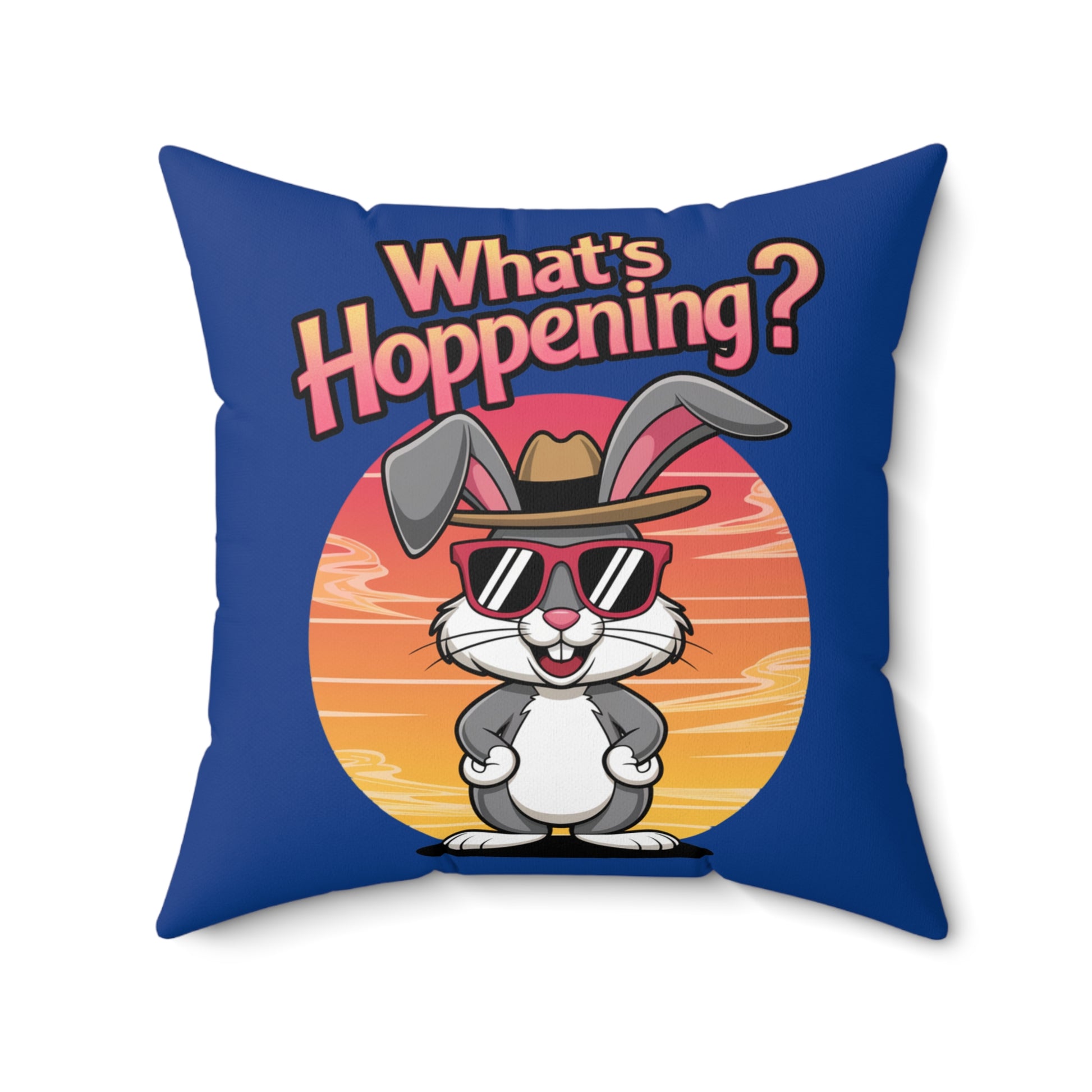 A fun pillow with a cool bunny on it that states 'What's Hoppening'. This pillow brings a playful and whimsical vibe to any room, perfect for those who love cute and quirky decor. Ideal for Easter, springtime, or anyone who adores bunnies.
