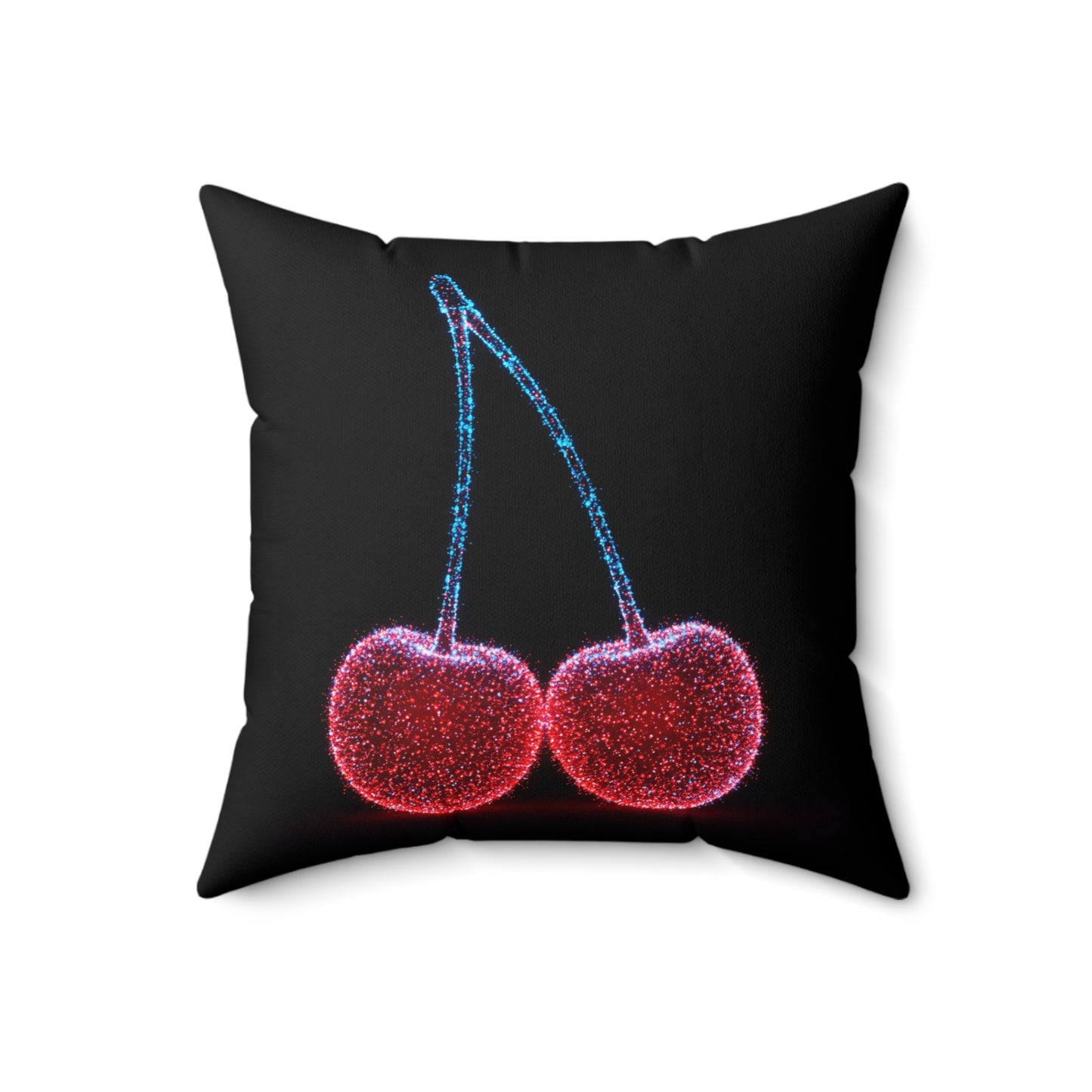 A fun pillow with sparkling bioluminescent cherries on it, perfect for adding a whimsical touch to any room. This pillow is great for nature lovers and those who appreciate unique, eye-catching designs. Ideal for decorating during summer or as a gift for someone who loves cherries or fruit-themed decor.