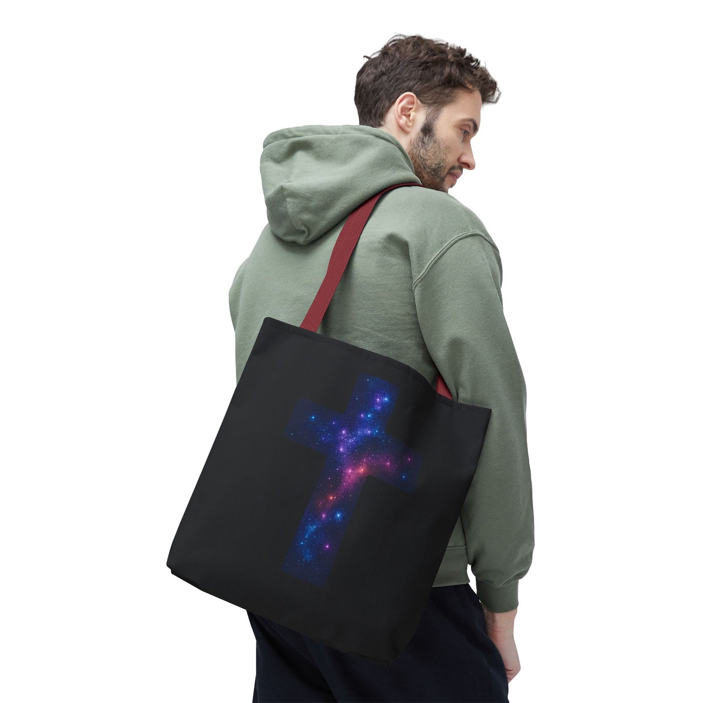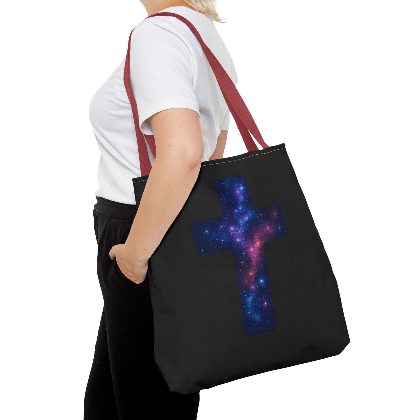 Carry your faith with style! This sleek black tote bag features a bold cross filled with a stunning galaxy design — a reminder of the infinite beauty of creation and the light that guides us. Perfect for everyday use, it blends functionality with spiritual inspiration, making it more than just a bag — it’s a statement of faith and hope.
