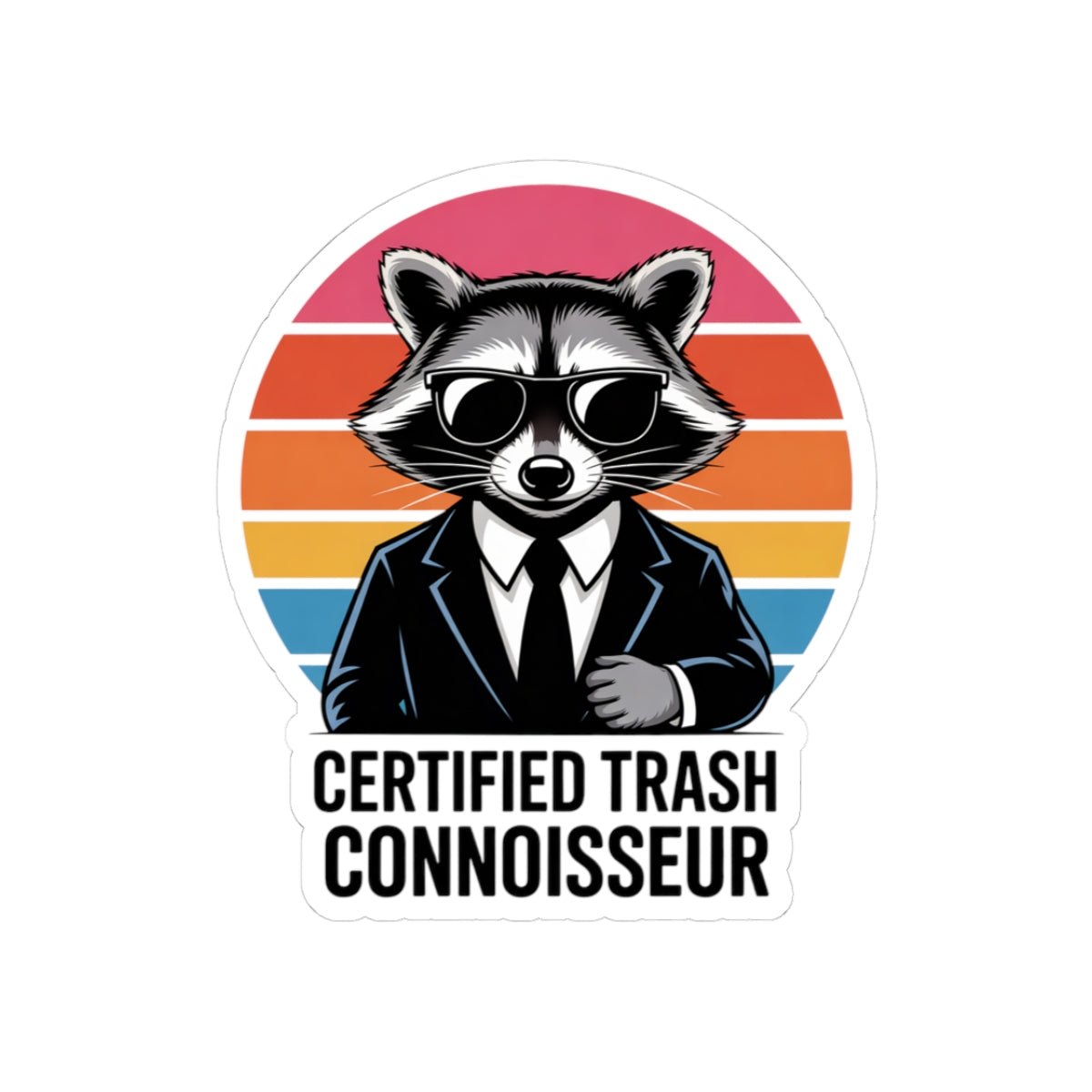A fun sticker featuring a raccoon in a suit that states "Certified Trash Connoisseur". Perfect for adding a touch of whimsy to laptops, journals, and windows. This sticker is ideal for adults who enjoy playful and quirky designs. Suitable for occasions like birthdays, casual gift-giving, or personal use.