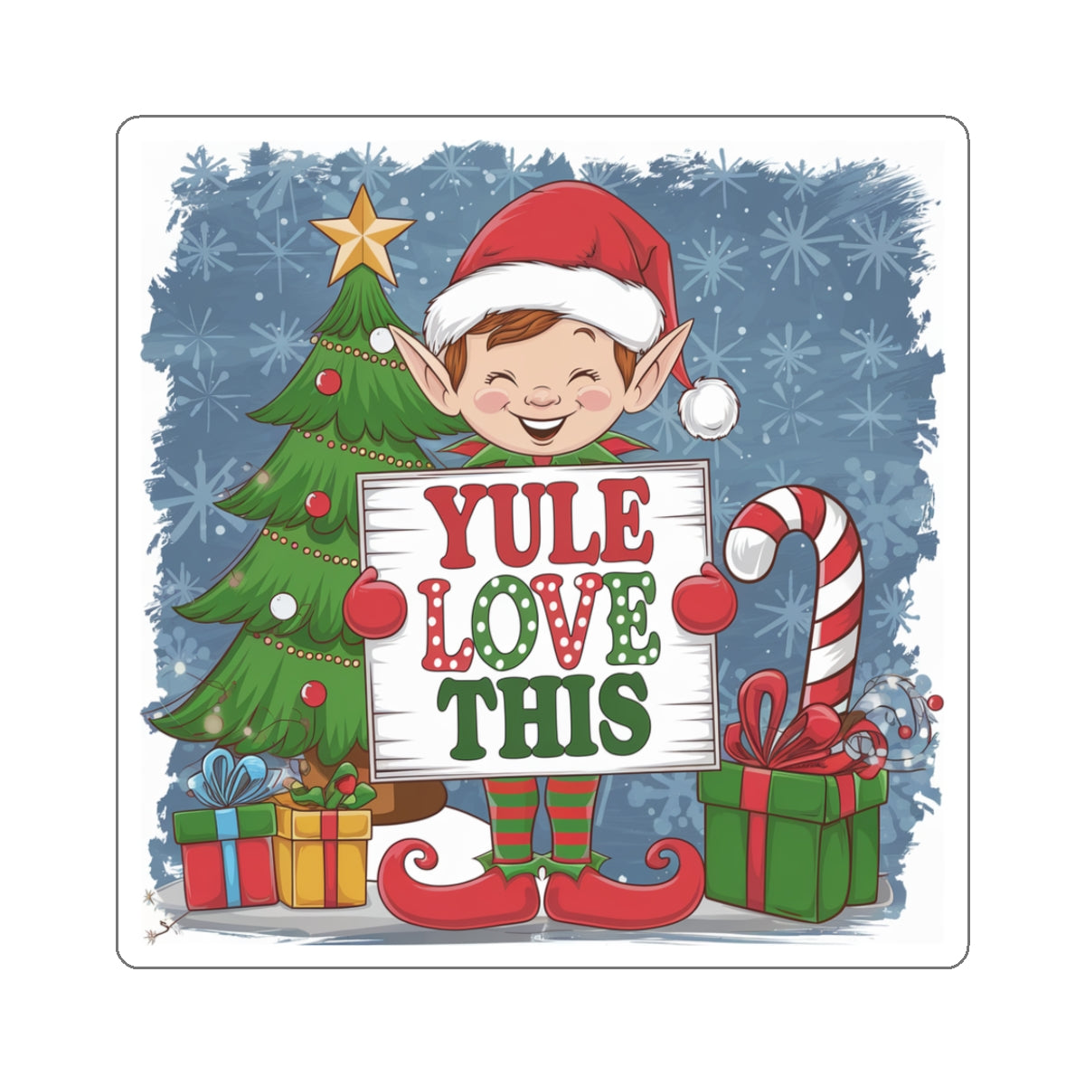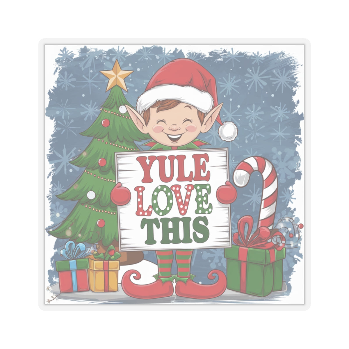 A playful sticker featuring an Elf holding a sign that says 'Yule Love This', perfect for adding a touch of whimsy to laptops, journals, and windows. It gives off a festive and fun vibe, making it ideal for the holiday season. This product is relevant to anyone looking to add some holiday cheer to their belongings.