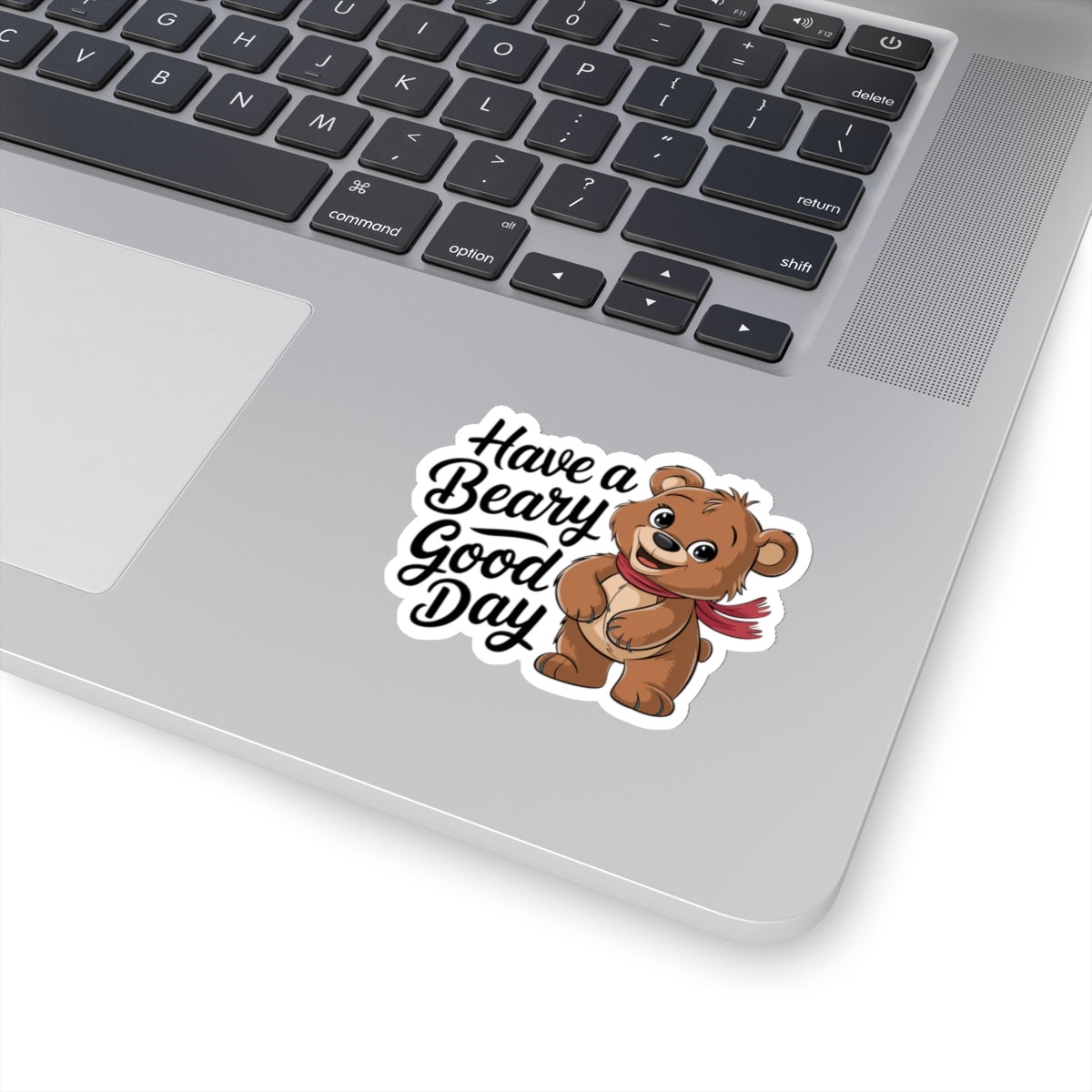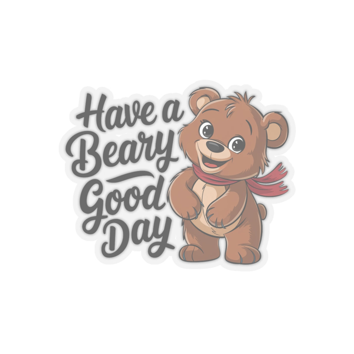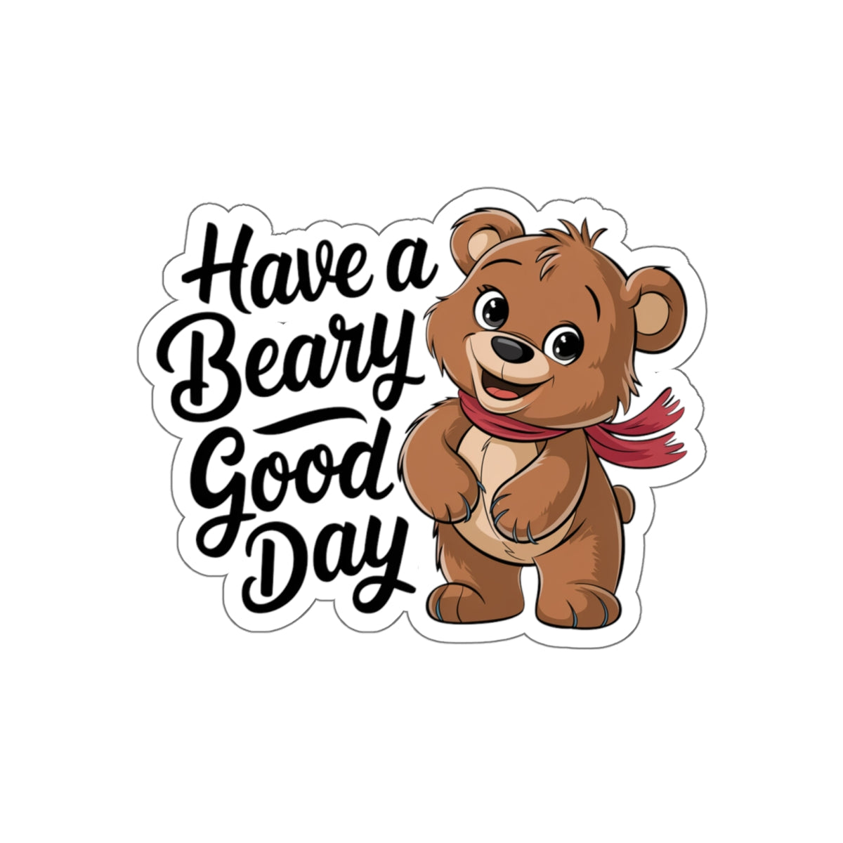 A fun pun bear sticker that states 'Have a Beary Good Day'. Bright and vibrant colors for decorating laptops, journals, and windows. Perfect for spreading positivity and adding a touch of whimsy to your everyday life. Ideal for those who enjoy cute and playful designs. Relevant for birthdays, friendship, appreciation, and any occasion that calls for a smile.