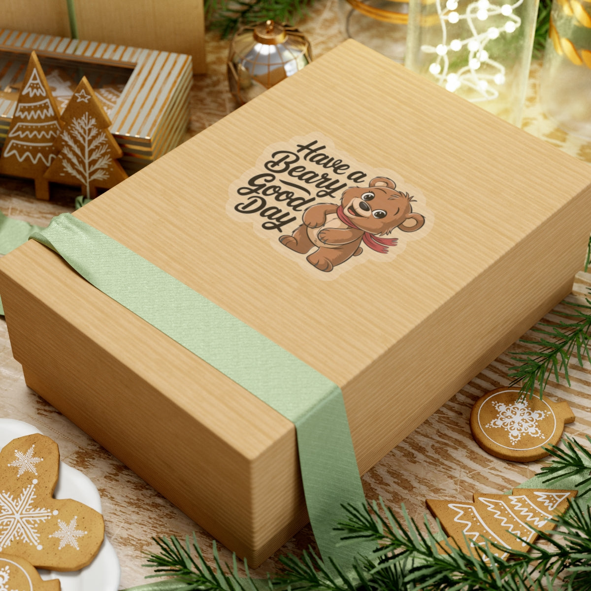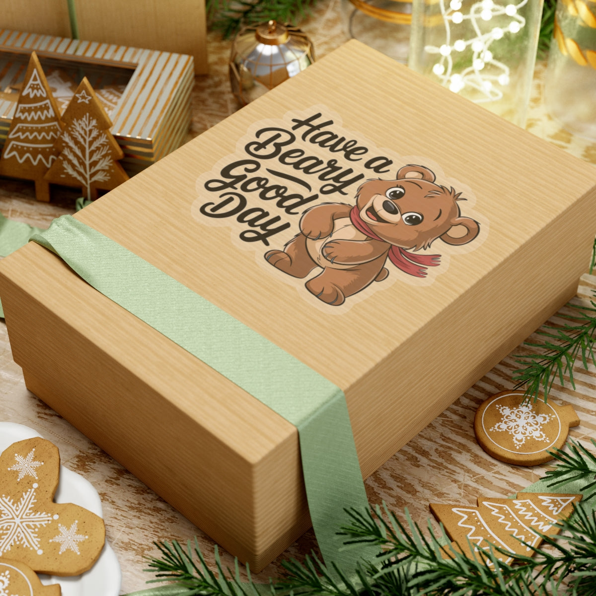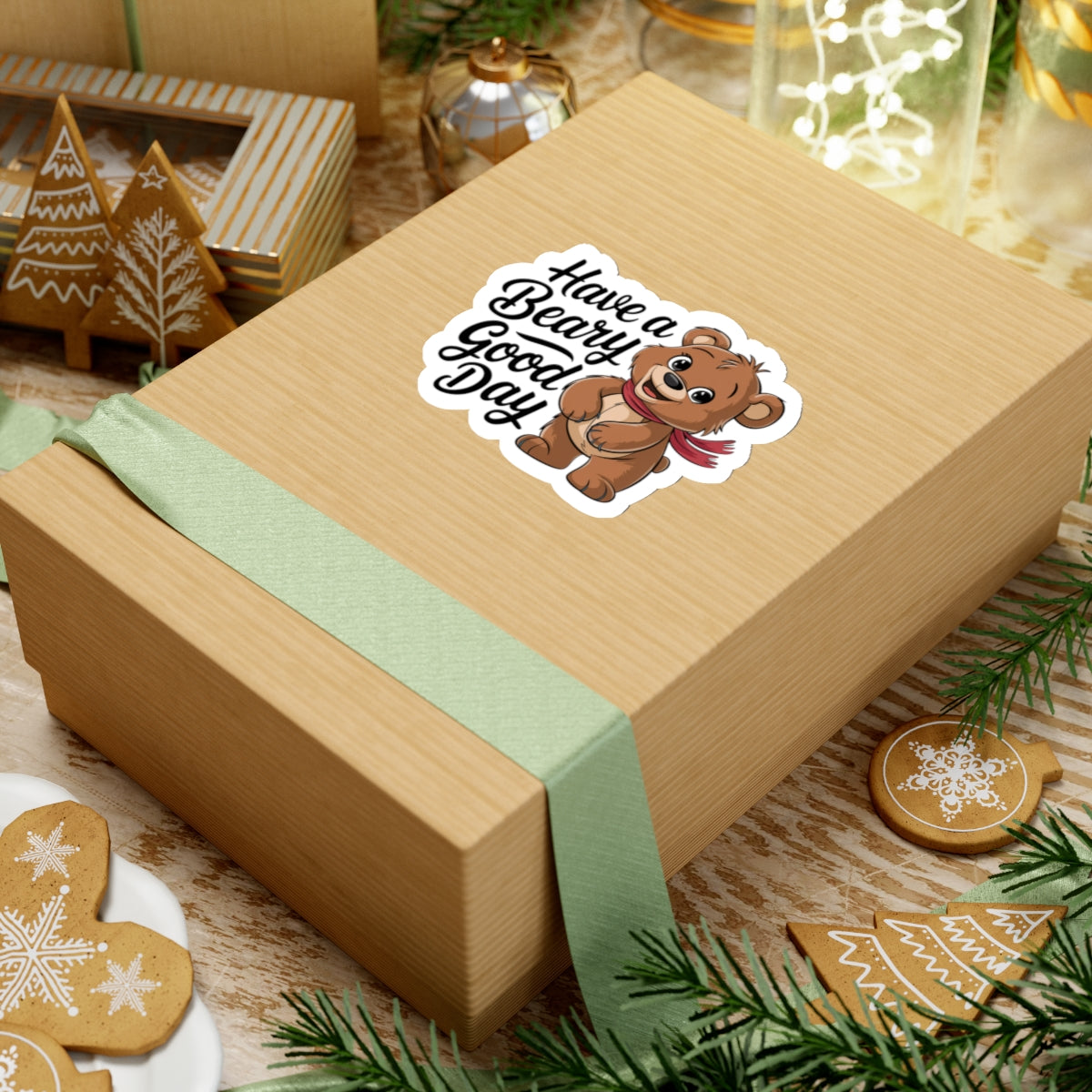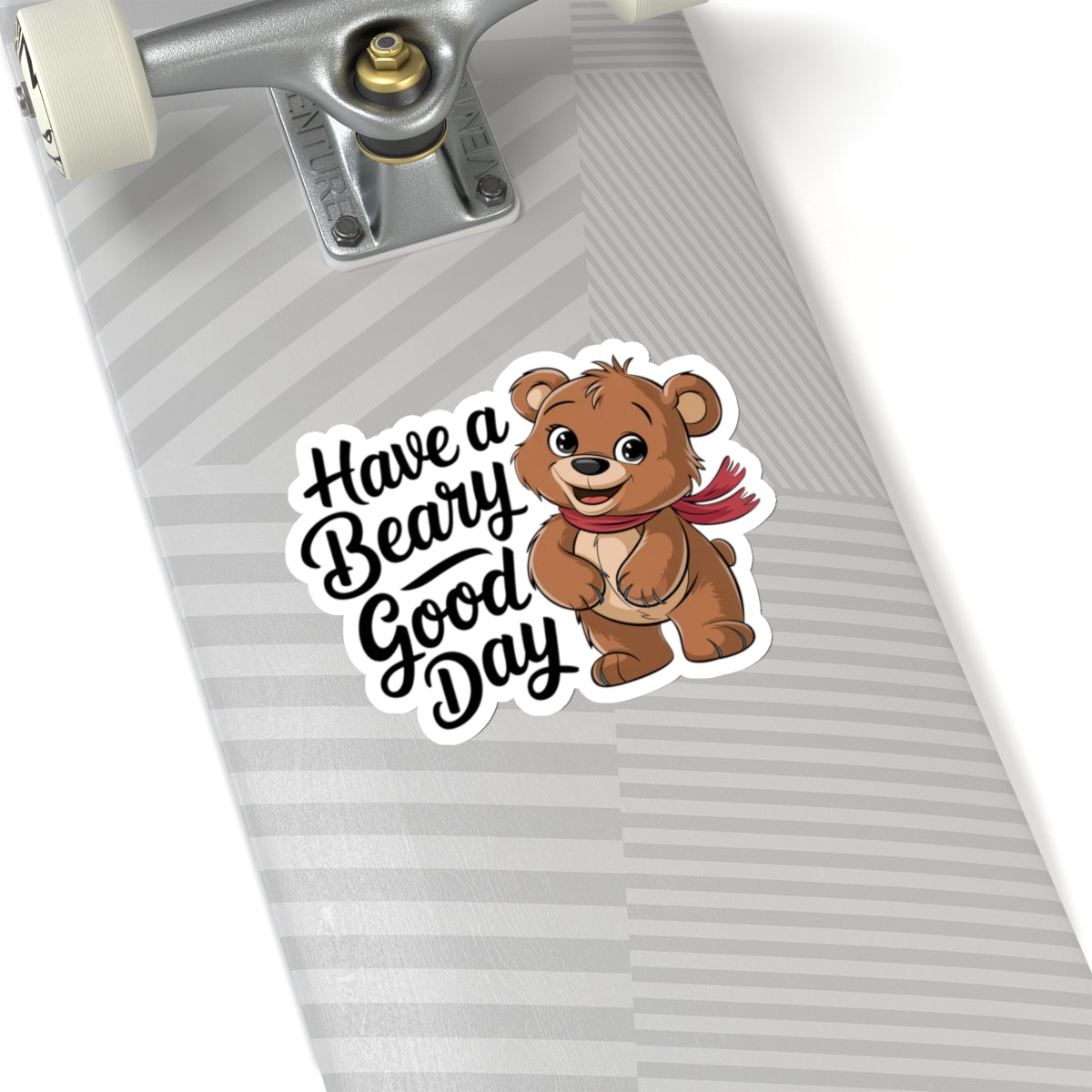 A fun pun bear sticker that states 'Have a Beary Good Day'. Bright and vibrant colors for decorating laptops, journals, and windows. Perfect for spreading positivity and adding a touch of whimsy to your everyday life. Ideal for those who enjoy cute and playful designs. Relevant for birthdays, friendship, appreciation, and any occasion that calls for a smile.