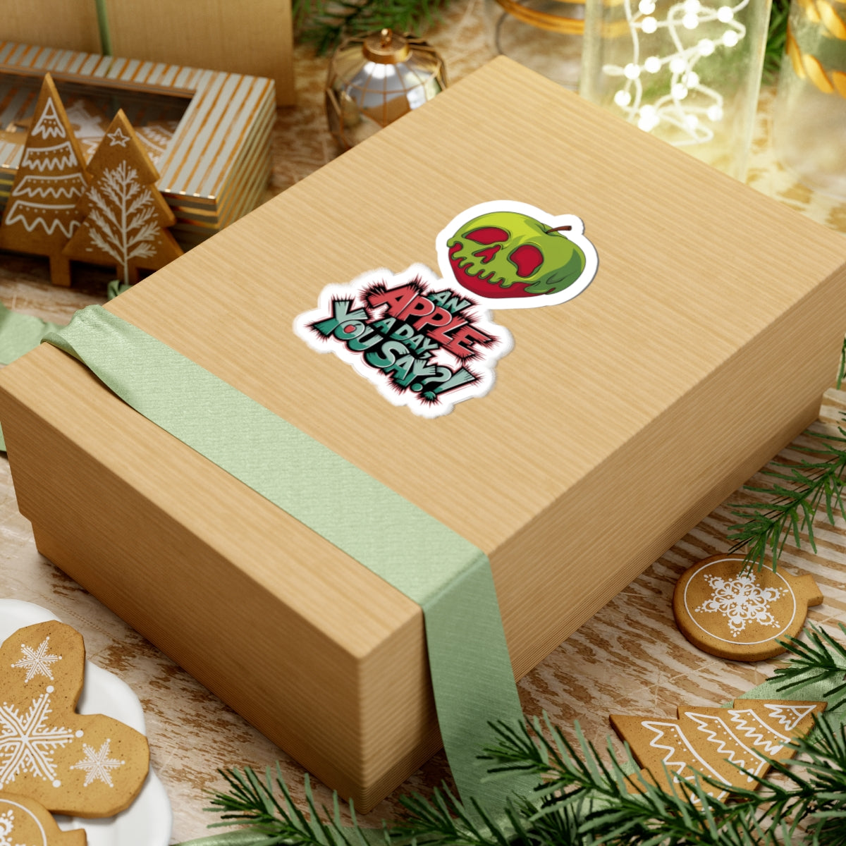 A vibrant and fun sticker featuring a poison apple with the phrase "An Apple a Day You Say". Perfect for adding a touch of whimsy to laptops, journals, and windows. Target audience includes adults looking to decorate their belongings with unique and colorful stickers. Relevant for Halloween, Poison Prevention Week, or simply for everyday use.