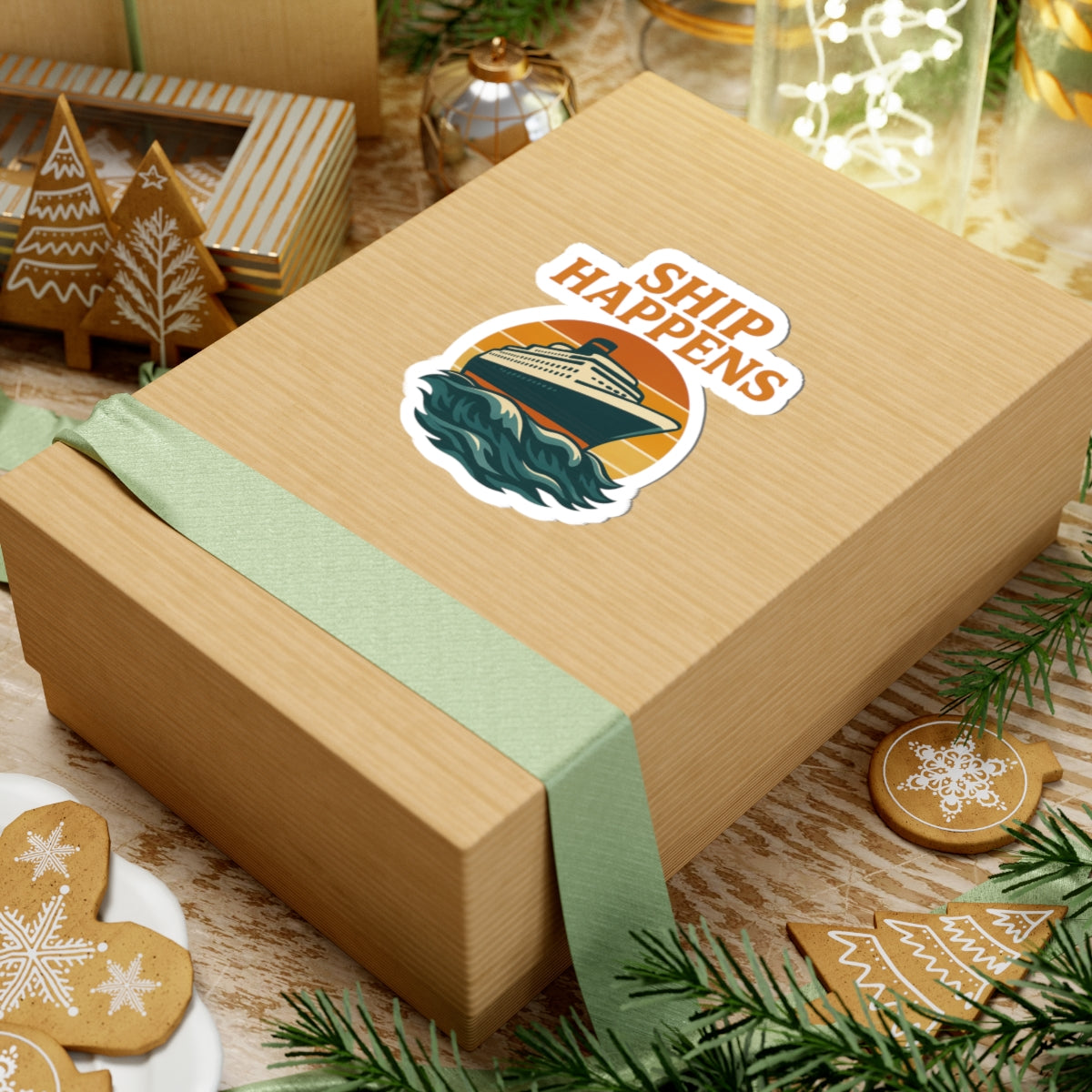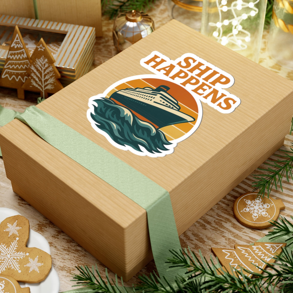 Vibrant kiss-cut sticker featuring a cruise ship in a sunset with the phrase 'Ship Happens'. Perfect for adding a fun and colorful touch to laptops, journals, and windows. Ideal for adults looking to add some personality to their belongings. Great for gift-giving during holidays, birthdays, or as a souvenir.
