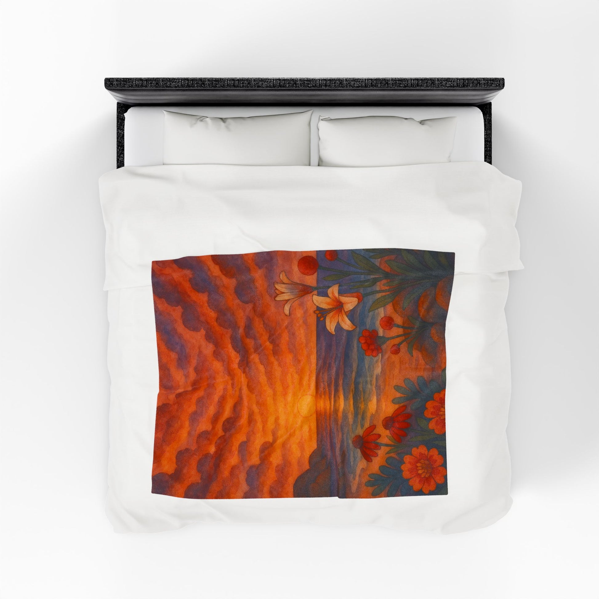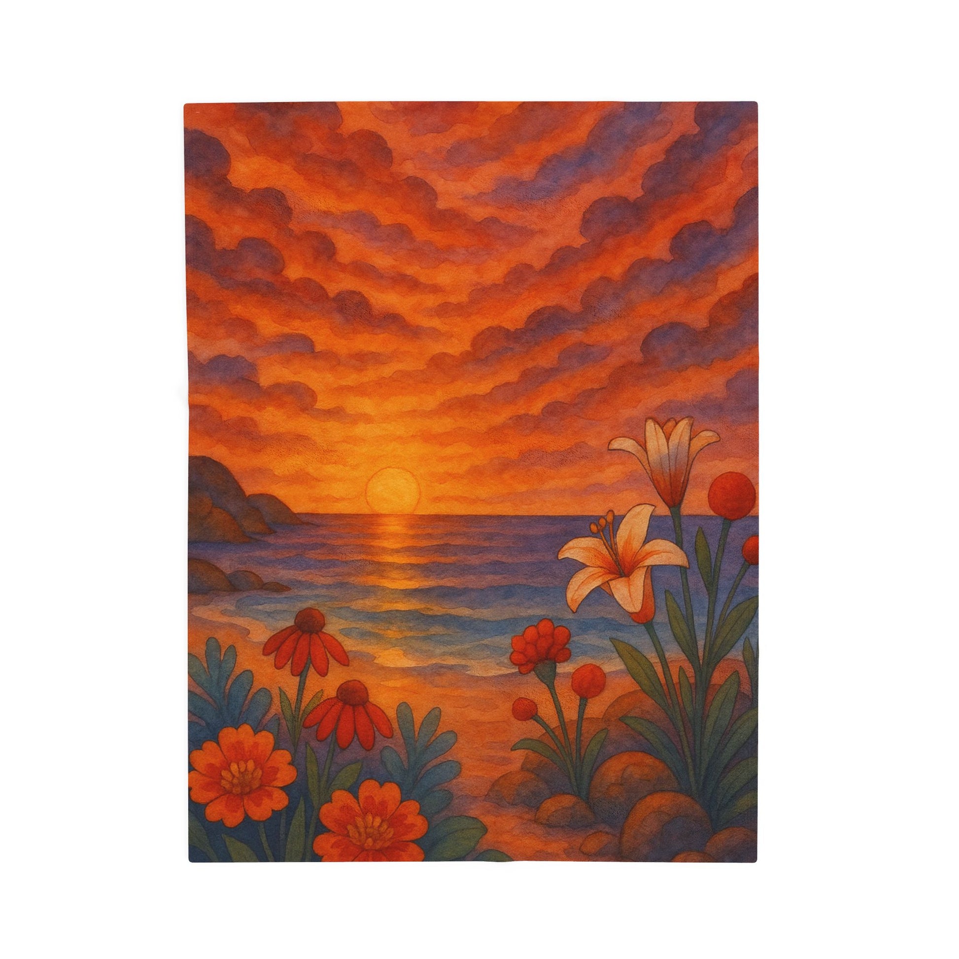 Wrap yourself in warmth and wanderlust with this Sunset Floral Blanket, featuring a breathtaking scene of a glowing ocean sunset, vibrant wildflowers, and dreamy painted skies. Made from ultra-soft velveteen plush, this cozy throw adds a splash of color and calm to any room.