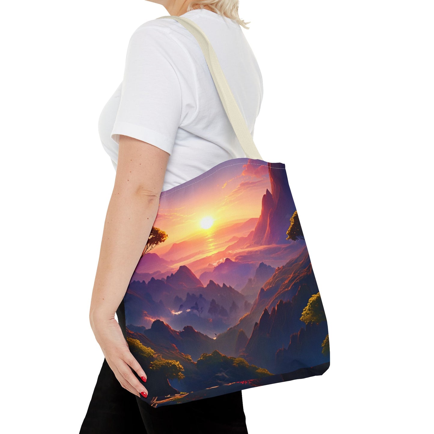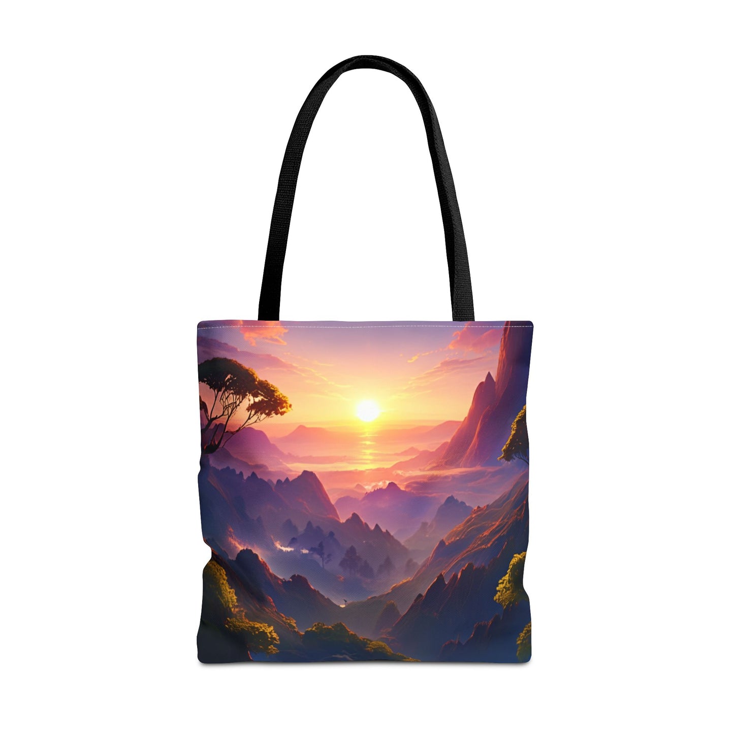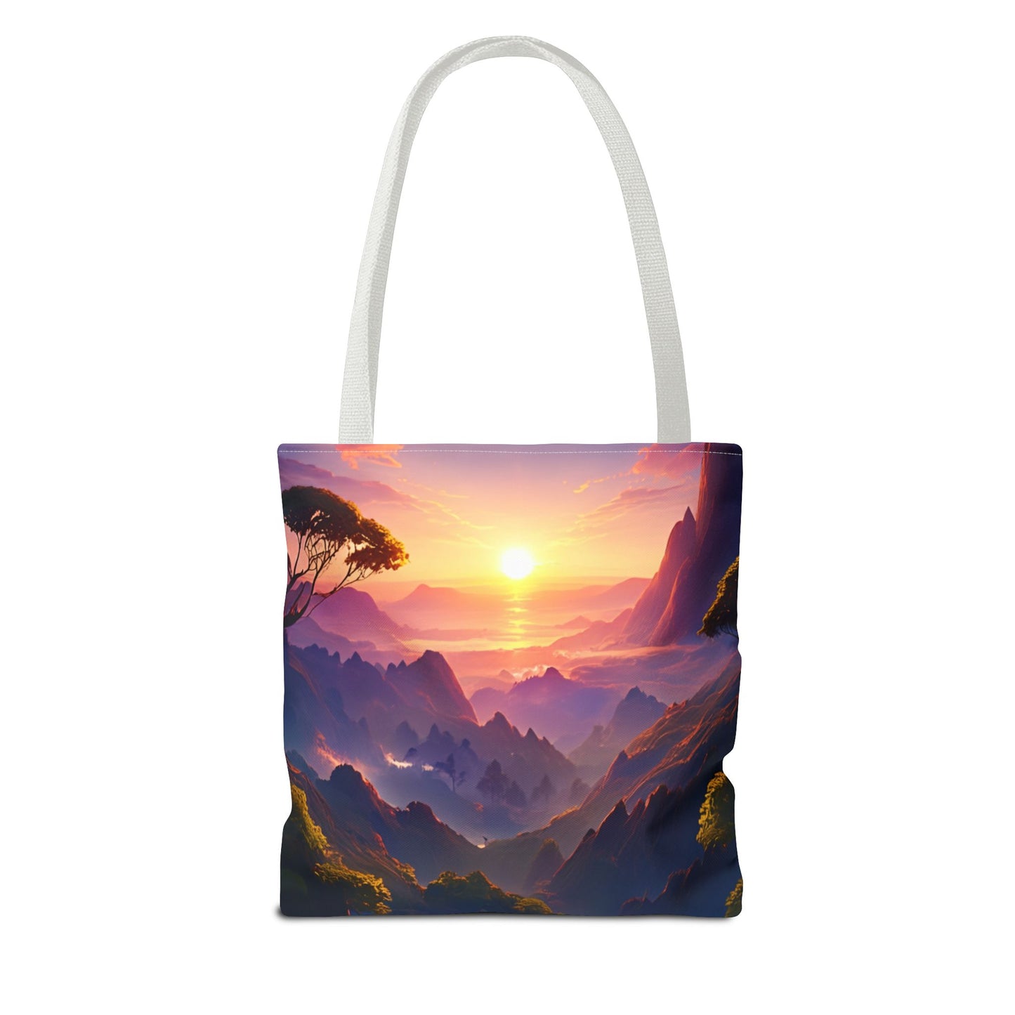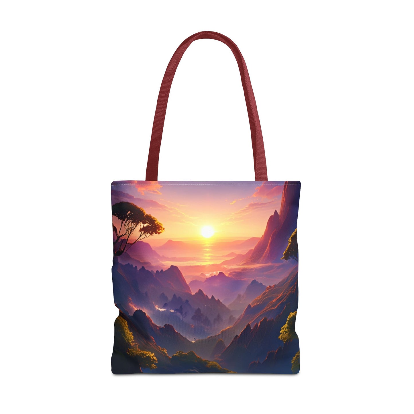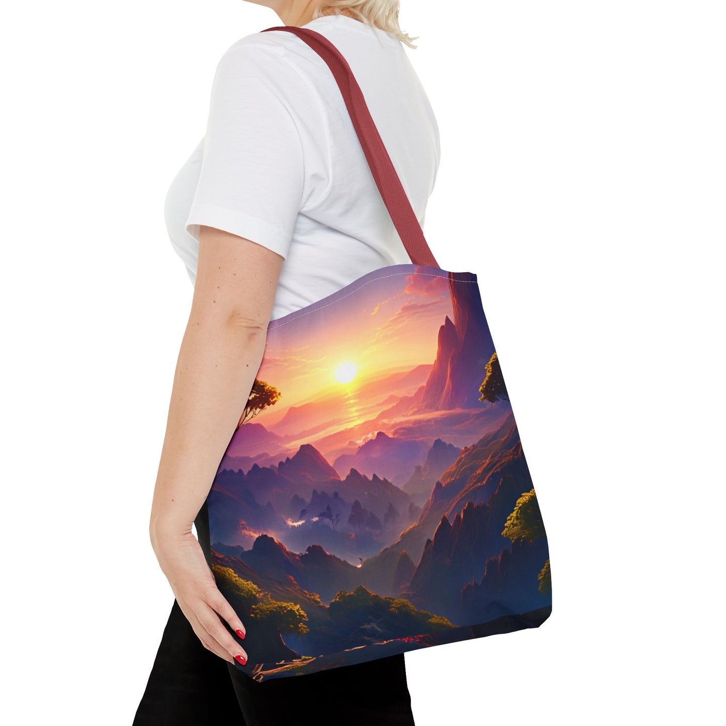 A fun scenic landscape at sunset tote bag that brings a relaxing and peaceful vibe. Perfect for nature lovers and those who enjoy serene views. Ideal for everyday use, outdoor activities, and trips to the beach or park. Relevant for summer holidays, picnics, and nature-themed celebrations.
