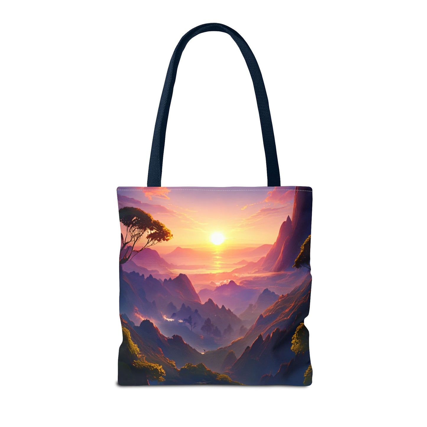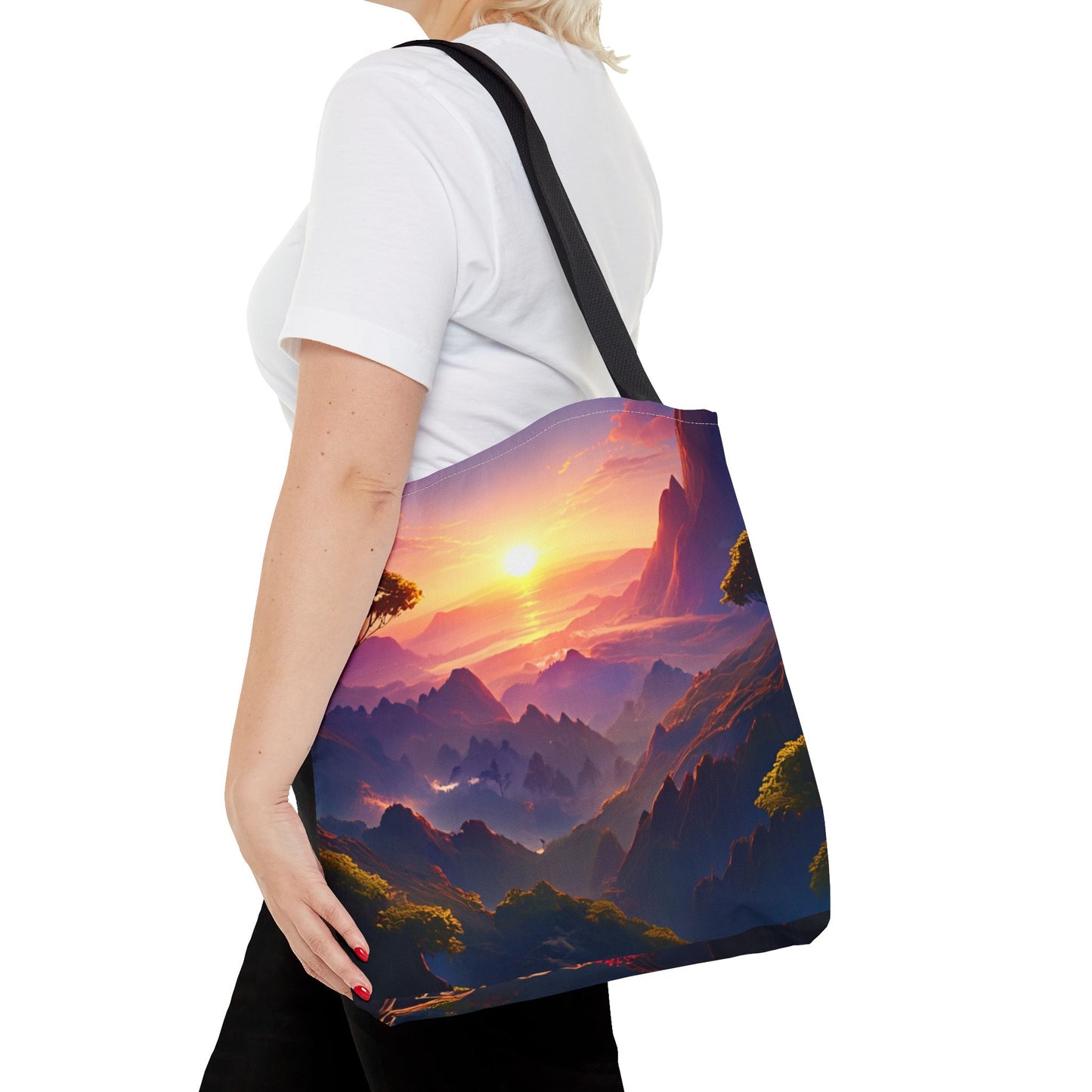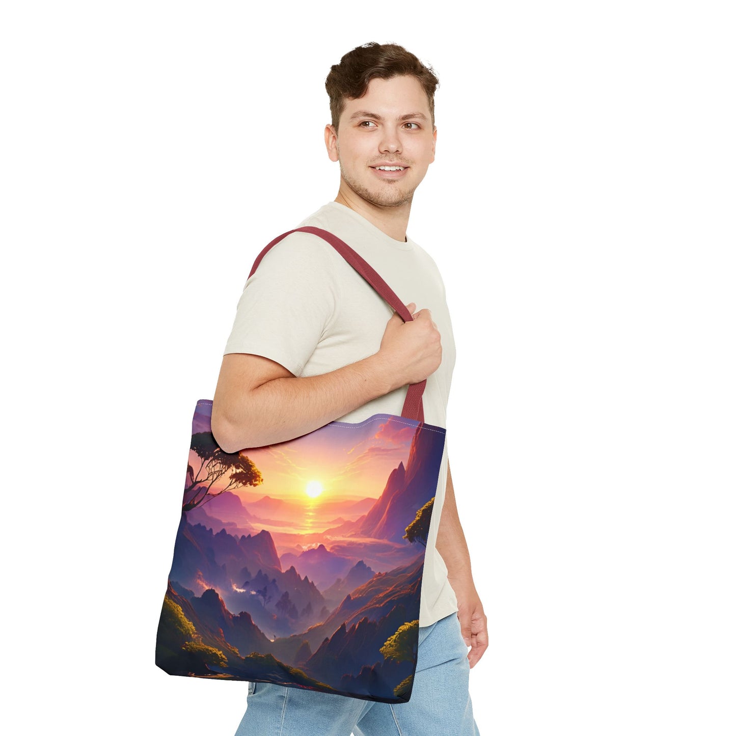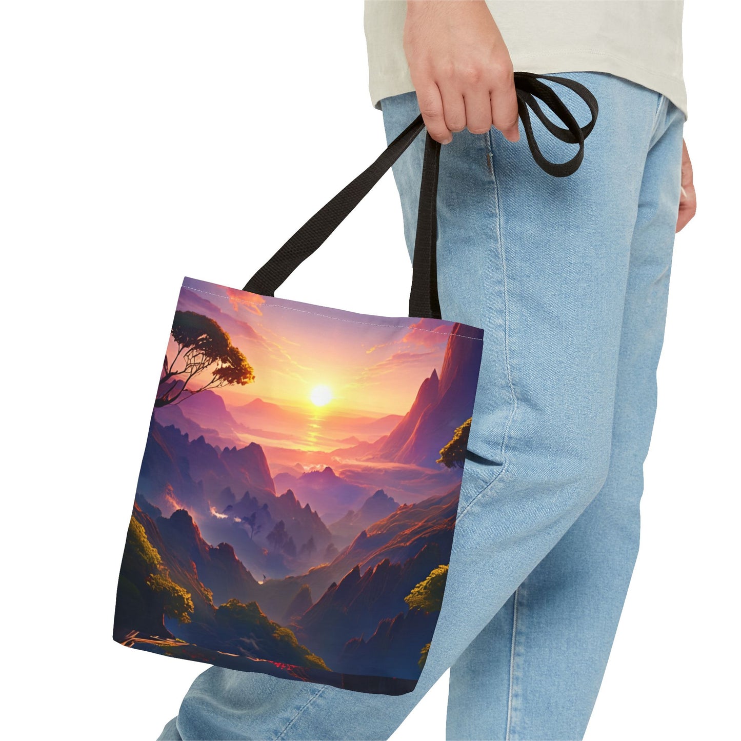A fun scenic landscape at sunset tote bag that brings a relaxing and peaceful vibe. Perfect for nature lovers and those who enjoy serene views. Ideal for everyday use, outdoor activities, and trips to the beach or park. Relevant for summer holidays, picnics, and nature-themed celebrations.
